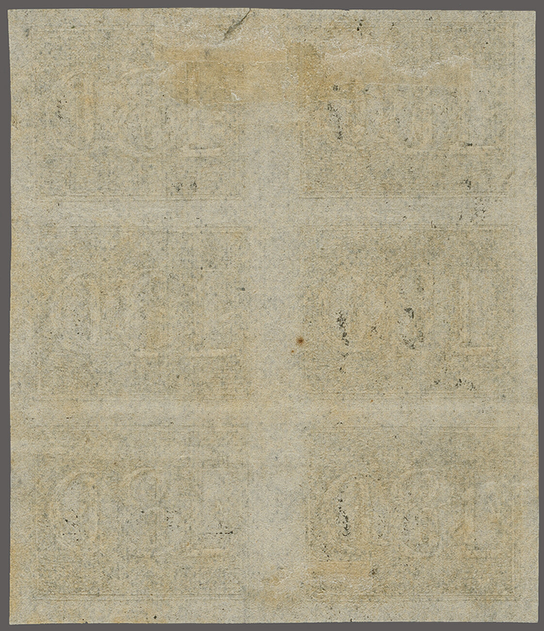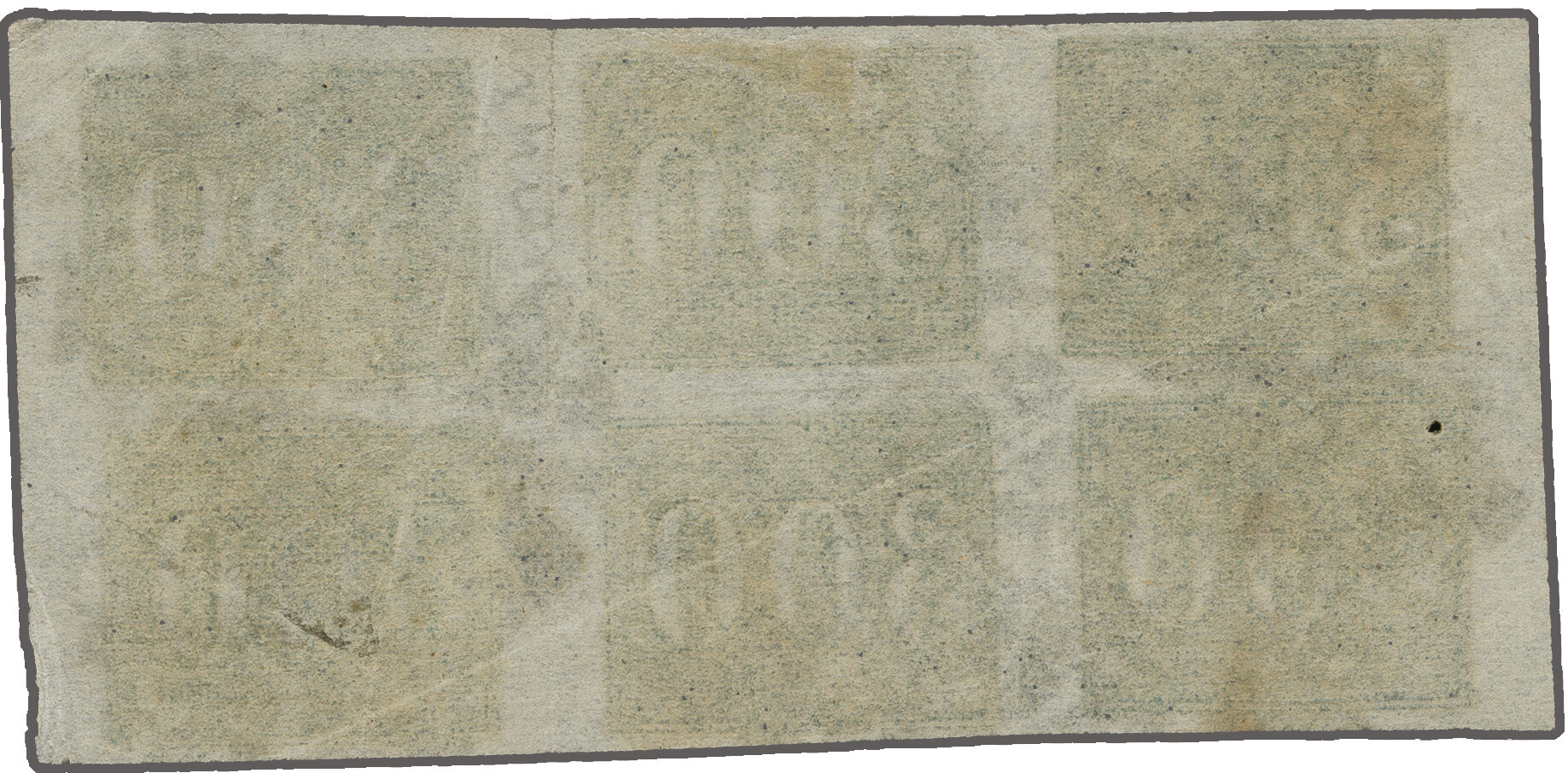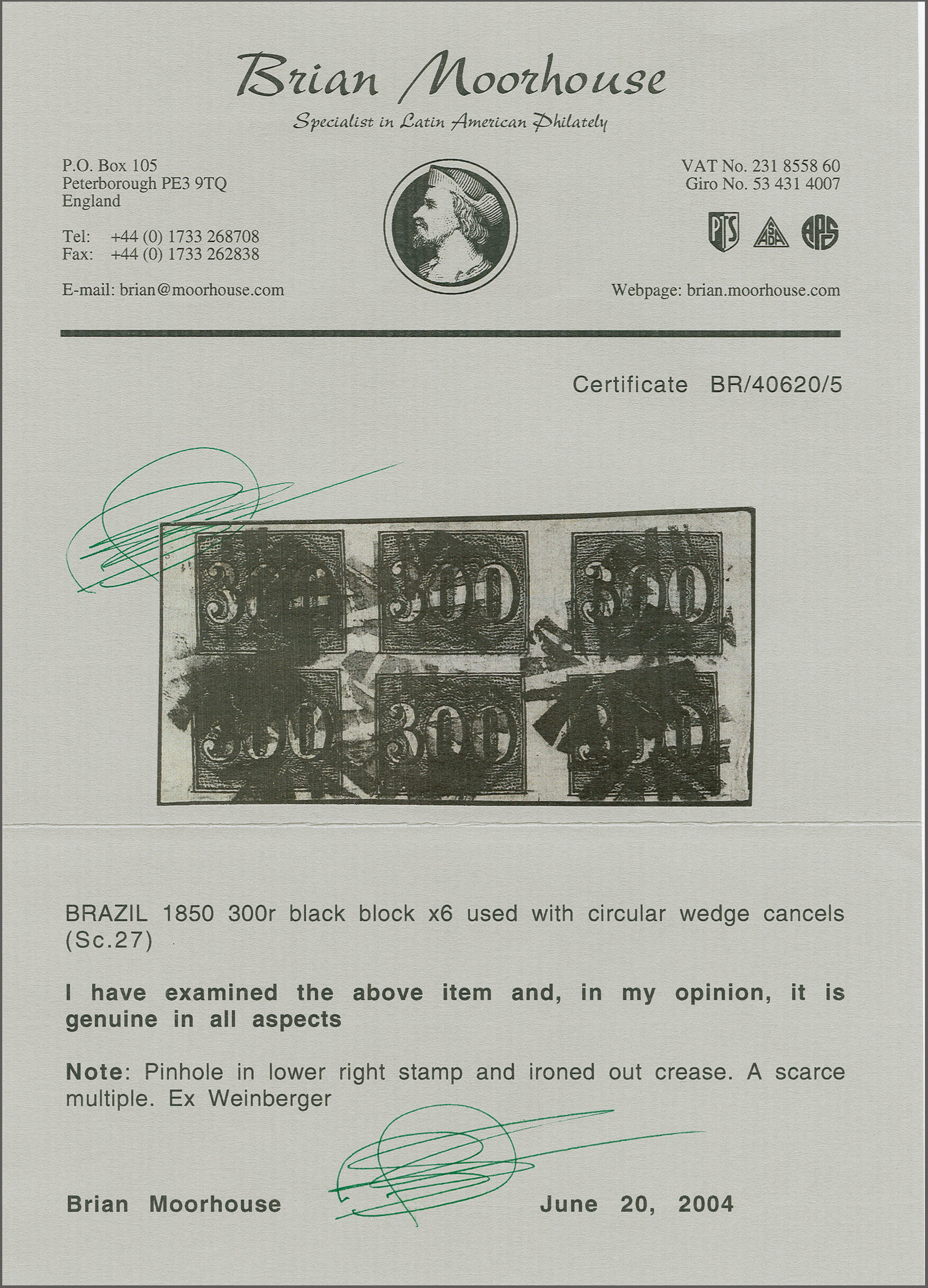 10089 bof imageVerticais 1850: 300 r. black on greyish thin paper, a used block of six (3 x 2) with good to very large margins all round in a deep shade, ironed out diagonal crease and sixth stamp with pinhole, cancelled by segmented cork handstamps in black. An enormously rare stamp in a large multiple (no larger used multiples noted in Burrus, Hubbard, Pracchia, Lima or Ferreira collections) and believed to be the second largest block known. Cert. Moorhouse (2004) Scott = $ 4'350++. Provenasnce: Collection Consul Weinberger. (Image 1) (Image 2)