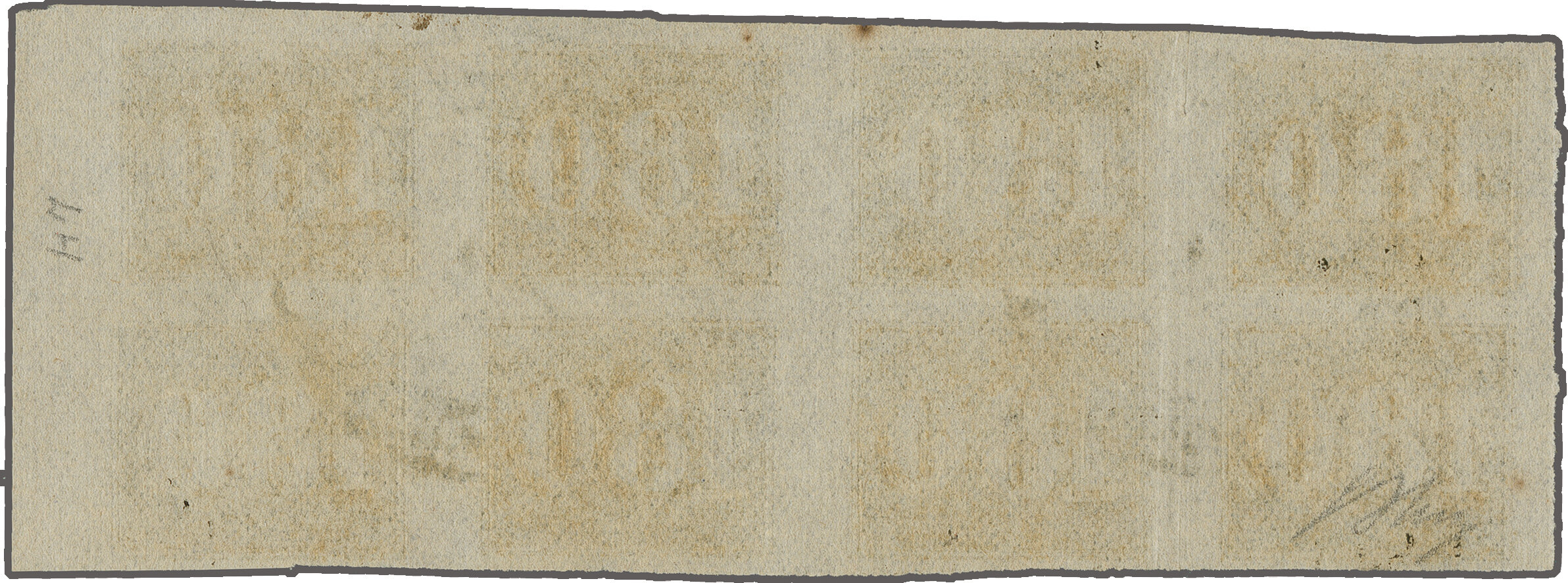 10086 bof imageVerticais 1850: 180 r. black on greyish thin paper, a used block of eight (4 x 2) marginal at right, of fine rich colour and second stamp showing trace of re-entry on the '8', ample to large margins all round, two small tone spots and vertical crease between the first and second row, cancelled by "Correio Geral da Corte / Brazil" datestamps in black. An extremely scarce and attractive multiple. (Image 1)