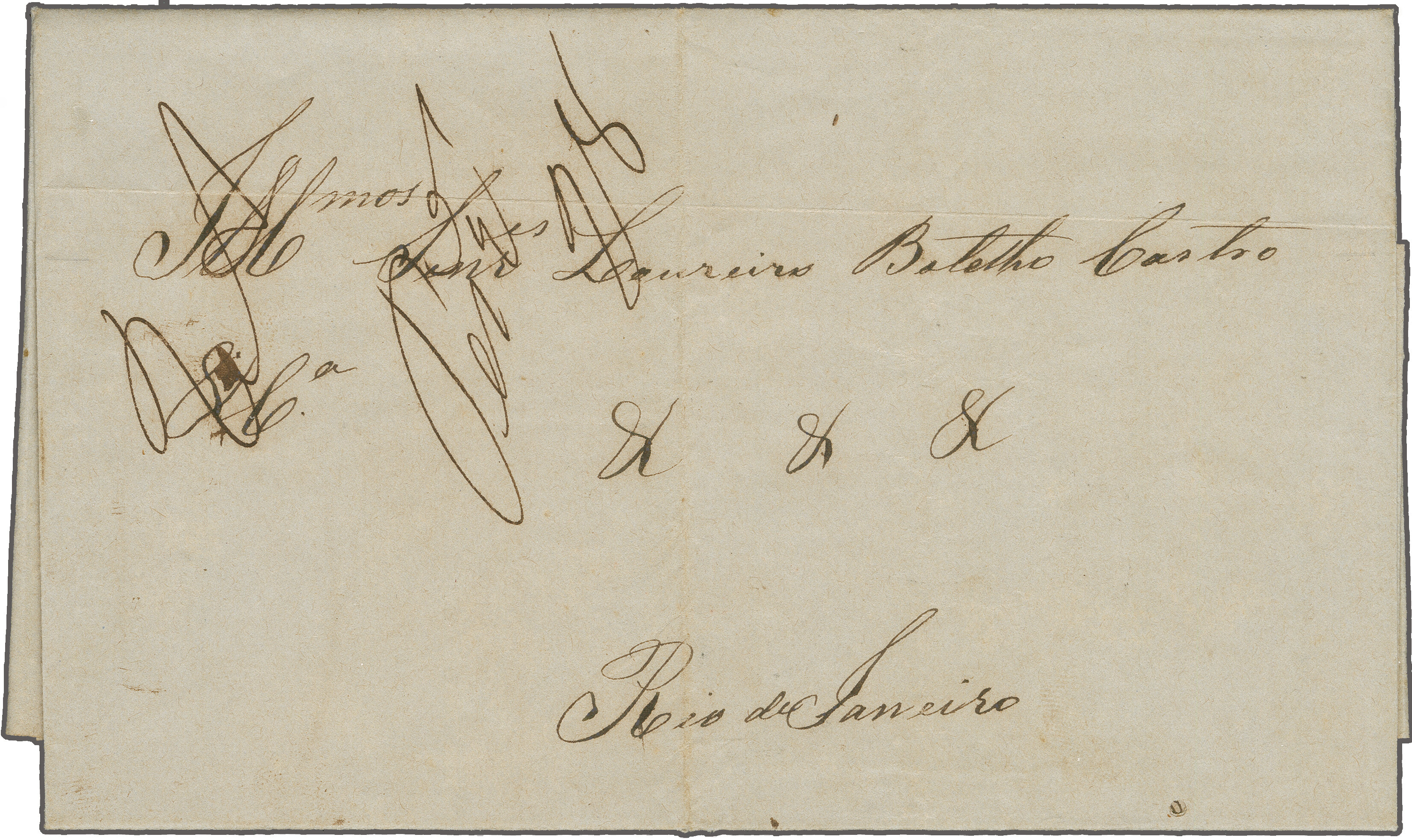 10074 cover/bof imageVerticais 1850: 30 r. black on yellowish thin paper in a deep shade, a block of six (3 x 2) with large margins on all sides and minutely touched at top right and on central stamp at base upon opening, used on 1850 entire letter from San Joao de Barra to Rio de Janeiro cancelled by two fine strikes of framed "S. JOAO / DA BARRA" handstamps in black (Ayres fig. 1459), with faint Corte cds in black and also tied by Rio de Janeiro cds in blue (Dec 9). A most attractive and scarce entire. (Image 1)