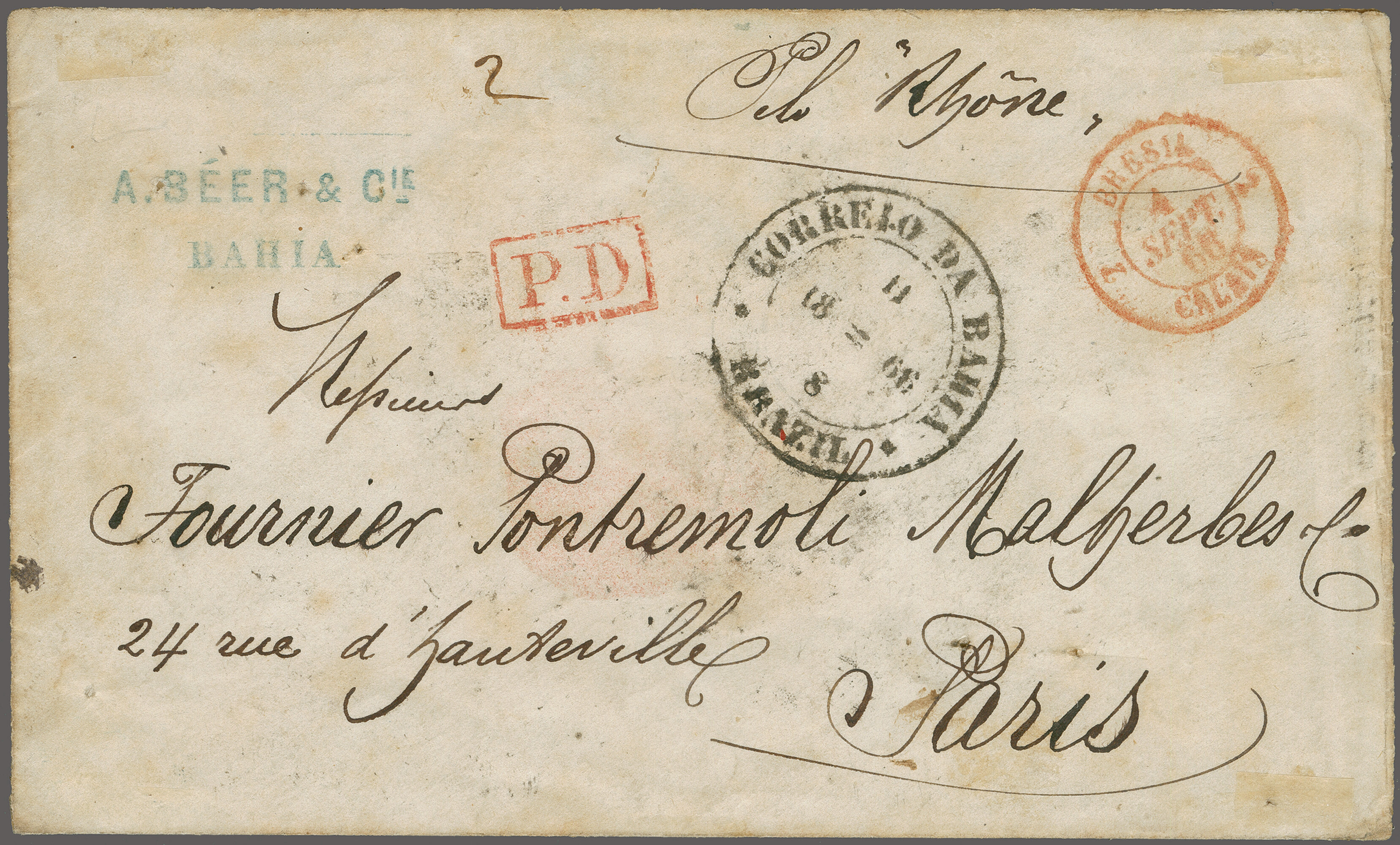 10088 cover imageVerticais 1850: 180 r. black on greyish thin paper, a used vertical strip of three with large margins on three sides and just shaved at base, together with Coloridos 1854 10 r. blue (2) with touched to large margins, used on reverse of 1866 double rate cover from Bahia to Paris, endorsed "Pelo Rhône", tied by fancy "BAHIA" handstamps in black (Ayres fig. 1223). Obverse with "CORREIO DA BAHIA / BRAZIL" cds (Aug 11) and red "PD", Calais entry marking in red at right (Sept 4). Opening tear affects one 10 reis adhesive but a colourful and unusual mixed issue double rate franking. (Image 1)