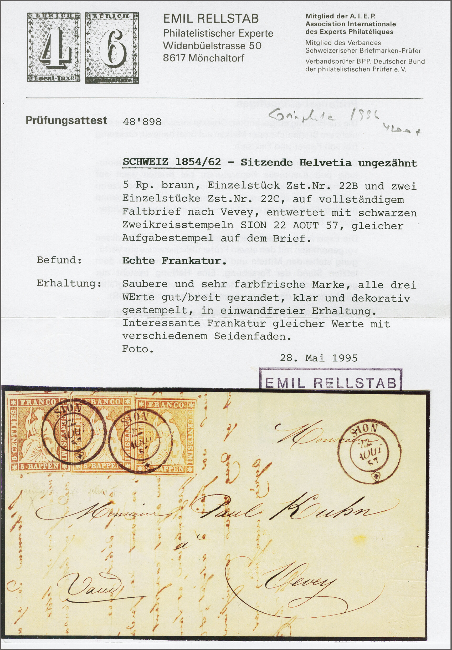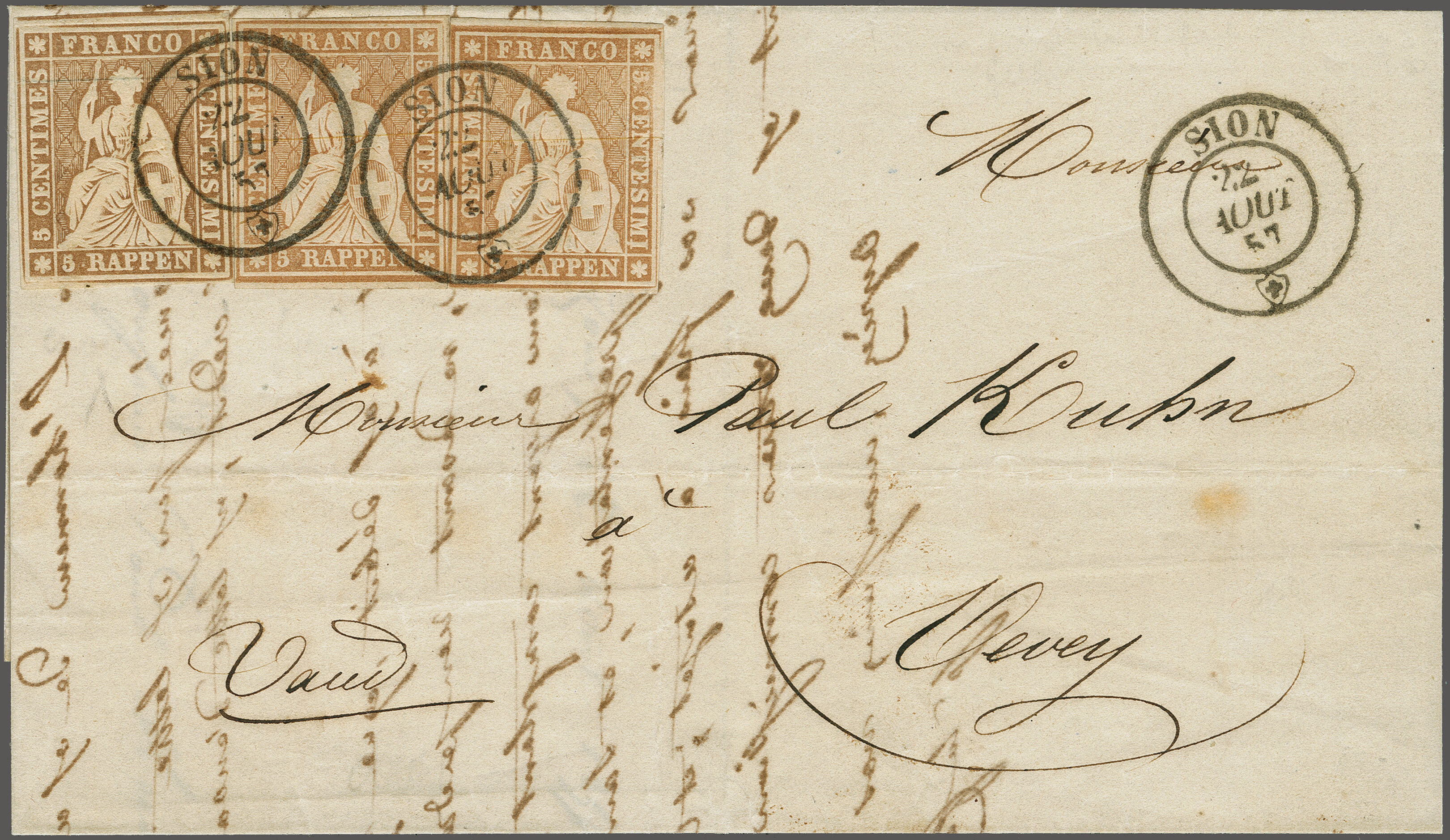 5 Rp. braun in Kombination mit 1855, 2. Berner Druck, 5 Rp. gelbbraun (2), alle farbfrisch und voll- bis meist weissrandig, schön klar entw. mit zwei Abschlägen des kl. Zweikreisstp. "SION 22 AOUT 57" in schwarz, nebenges.
