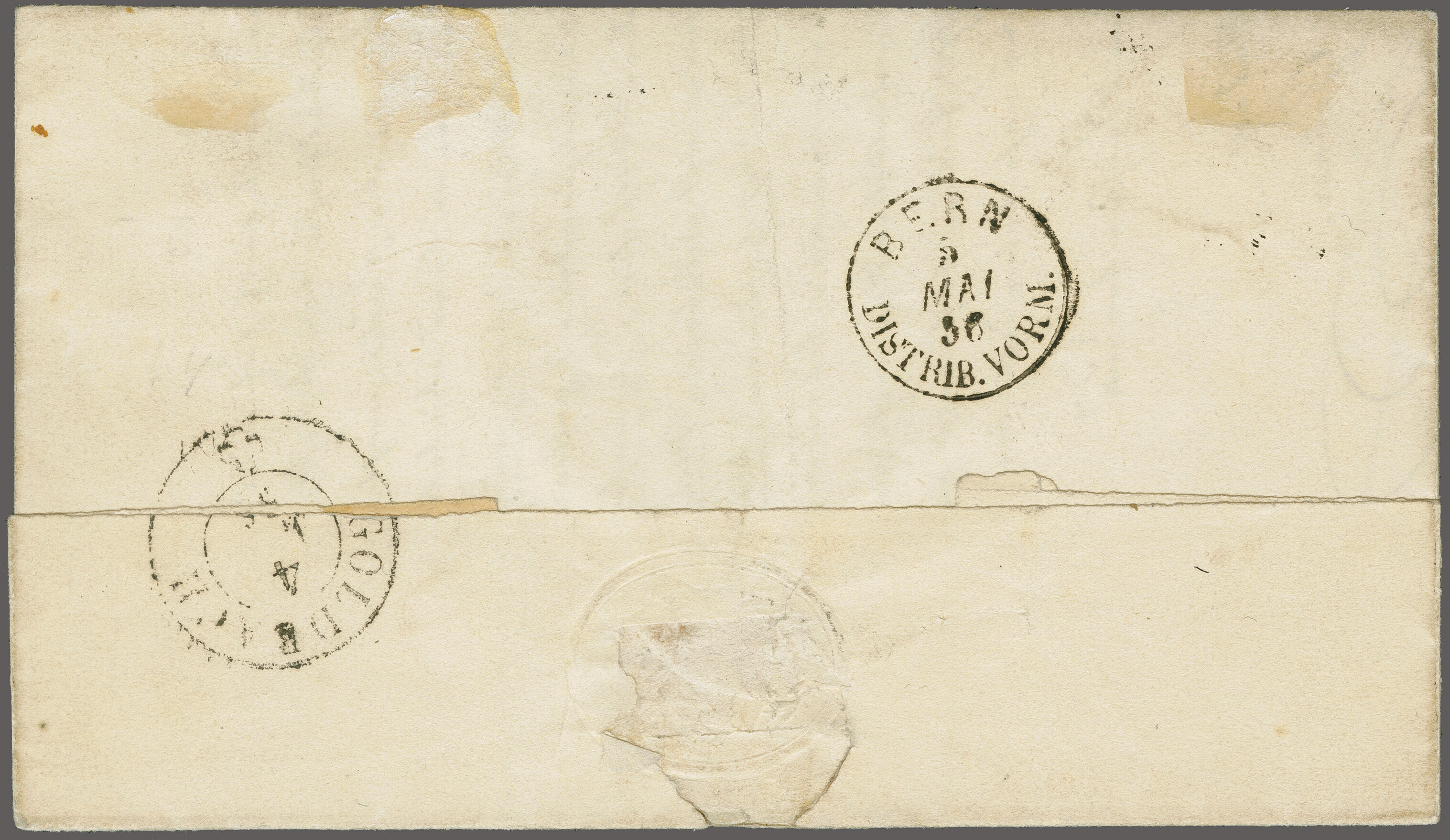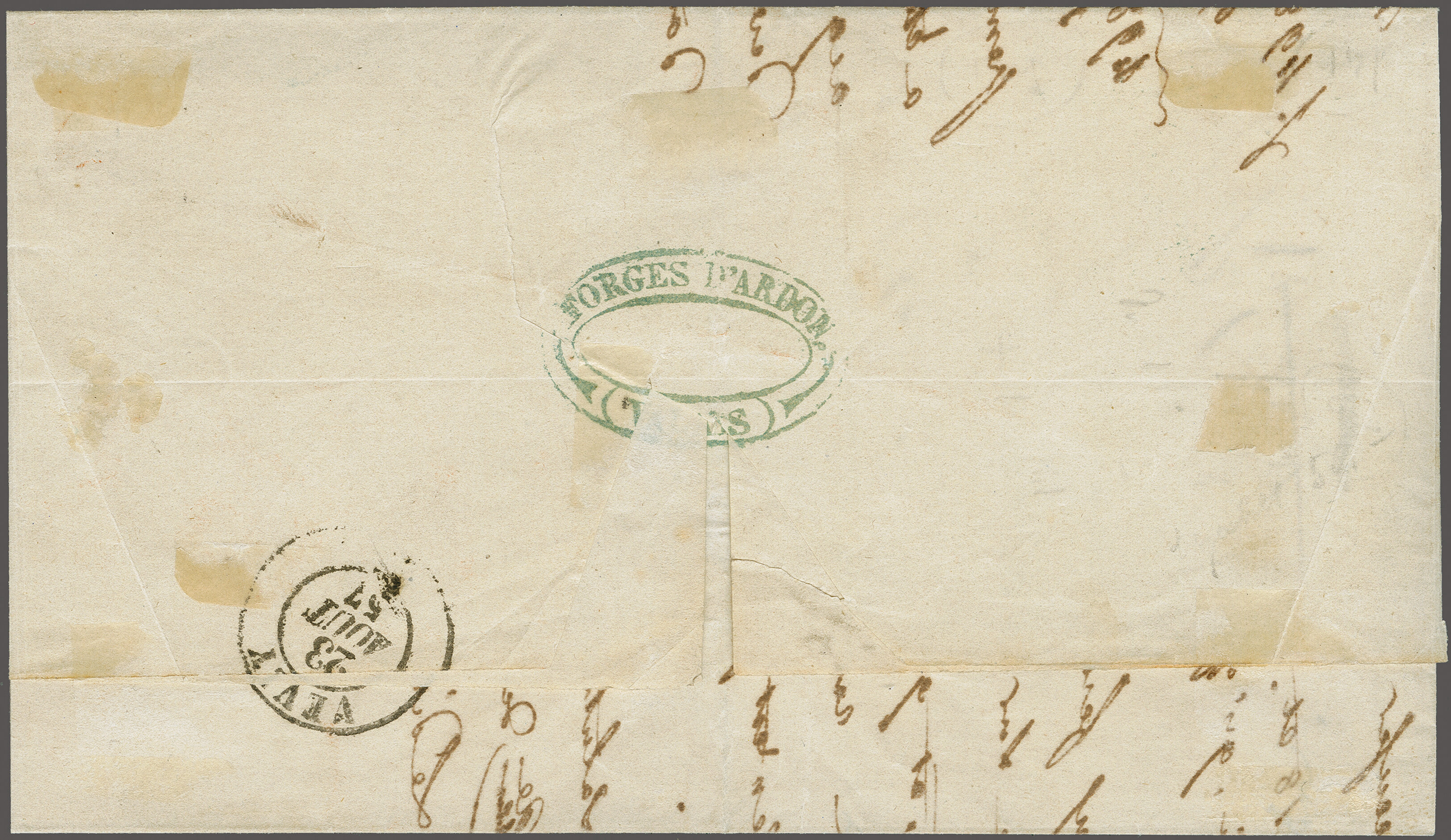 wiederholt, auf frischem und vollständigem Faltbrief, datiert "Ardon 22 Aout 1857" und im 3. Briefkreis nach Vevey adressiert. Rücks. Ankunftsstp. vom Folgetag. Eine sehr seltene Kombination zweier verschiedener Auflagen derselben Wertstufe in