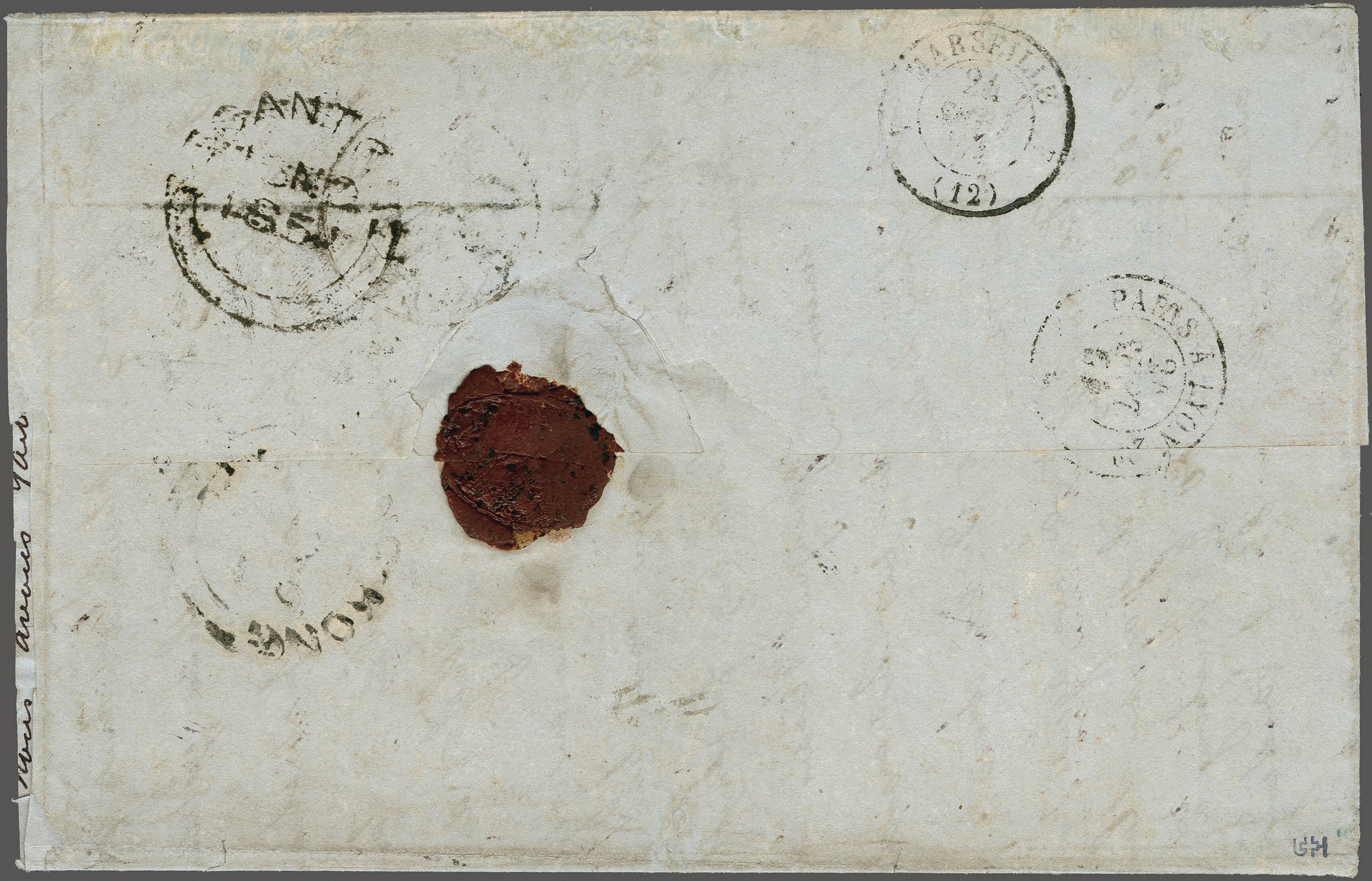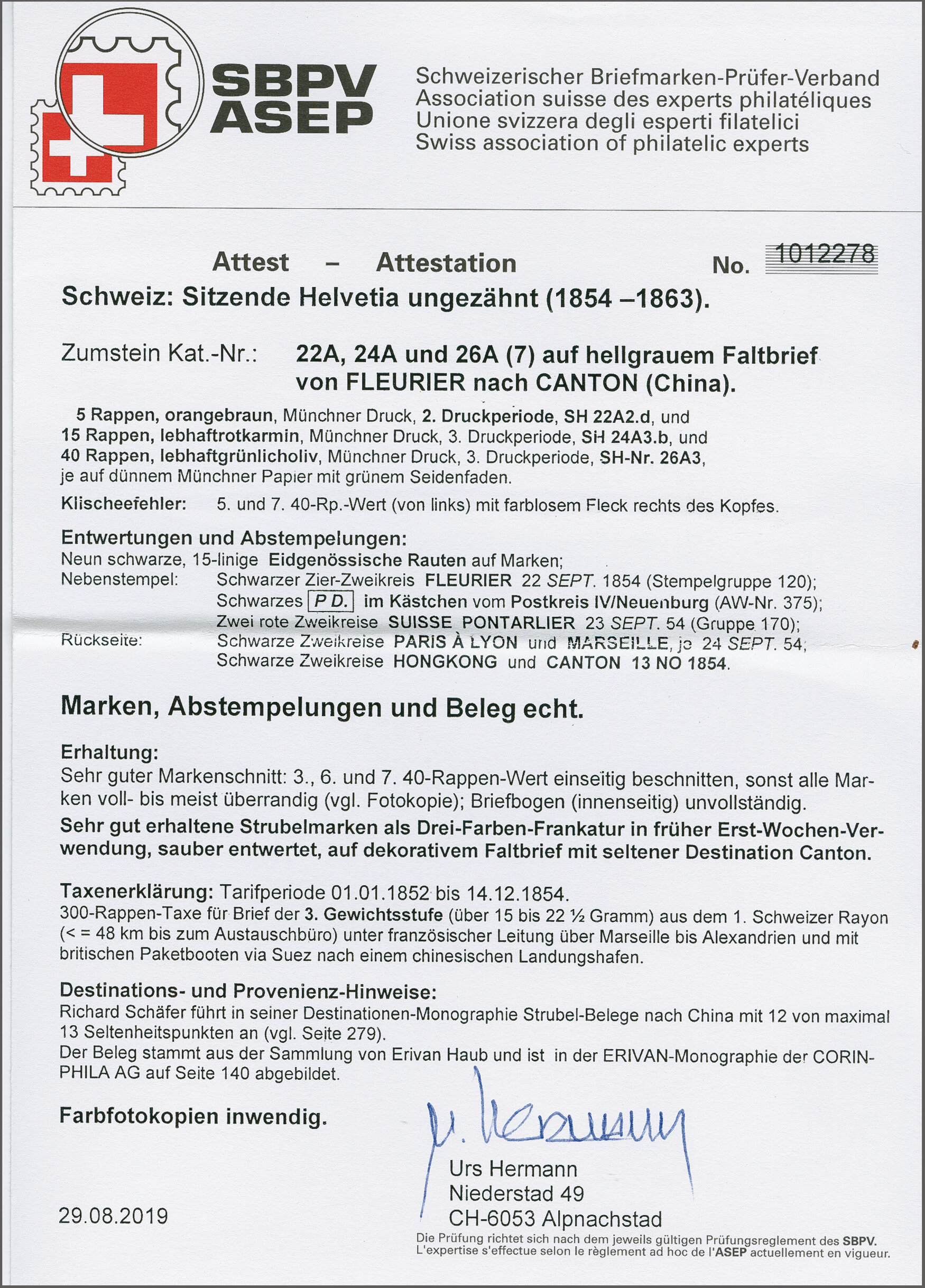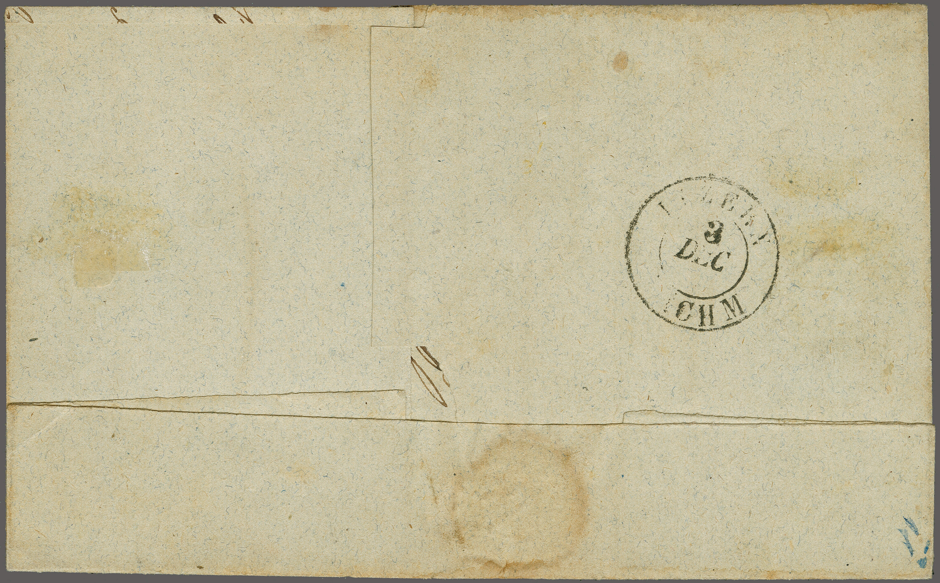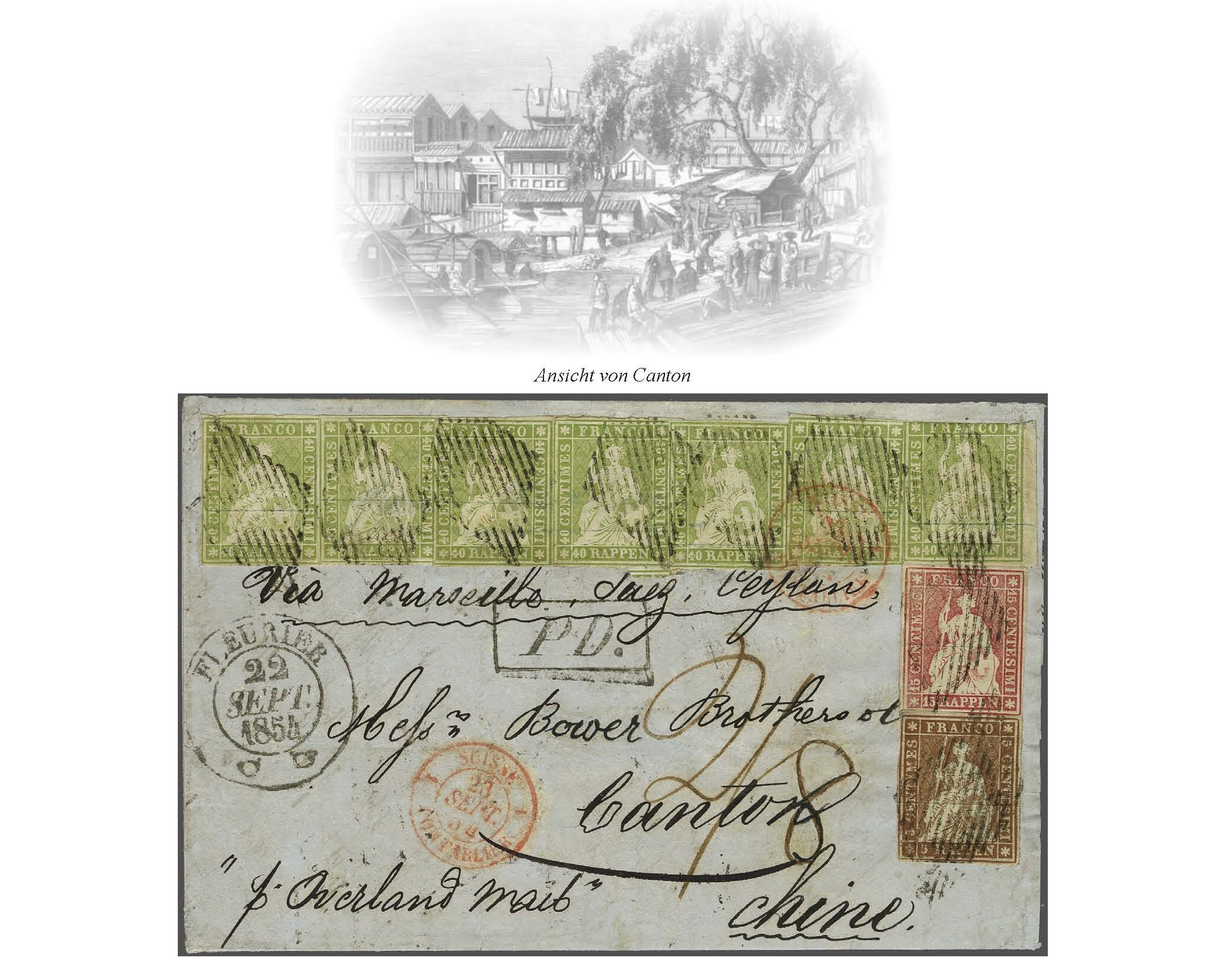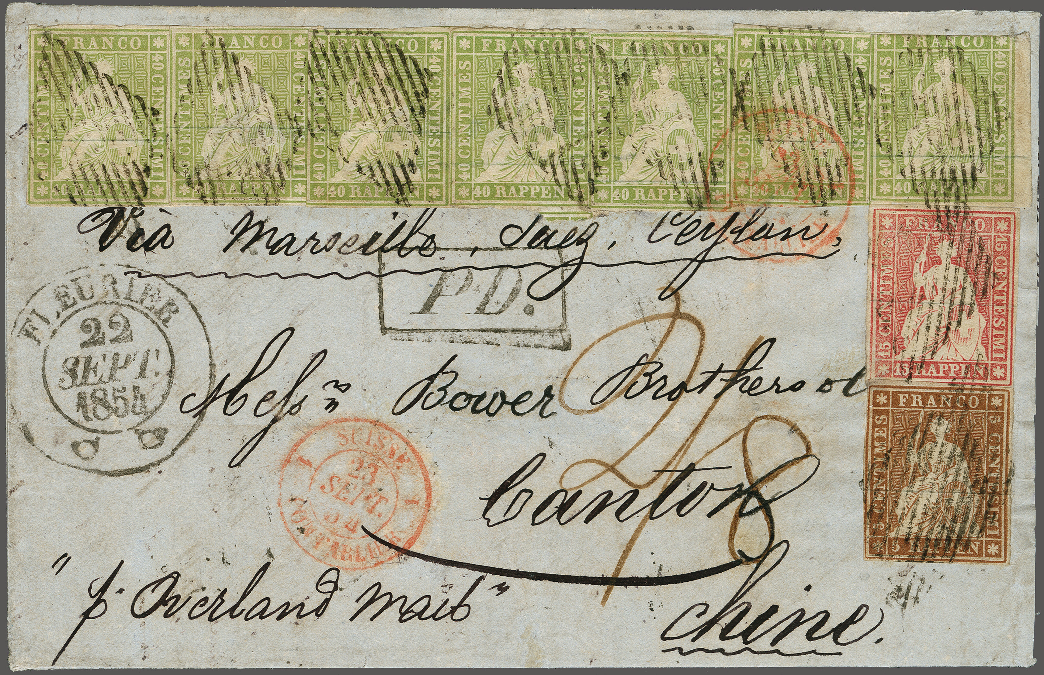 Eingangsstp. "SUISSE / PONTARLIER 23 SEPT. 54"; rücks. Bahnpoststp. "PARIS À CALAIS", Transiststp. "MARSEILLE" und "HONG KONG" sowie Ankunftsstp. "CANTON / 3 NO / 1854" des dortigen britischen Konsularpostamts. Die gemäss Postvertrag mit Frankreich