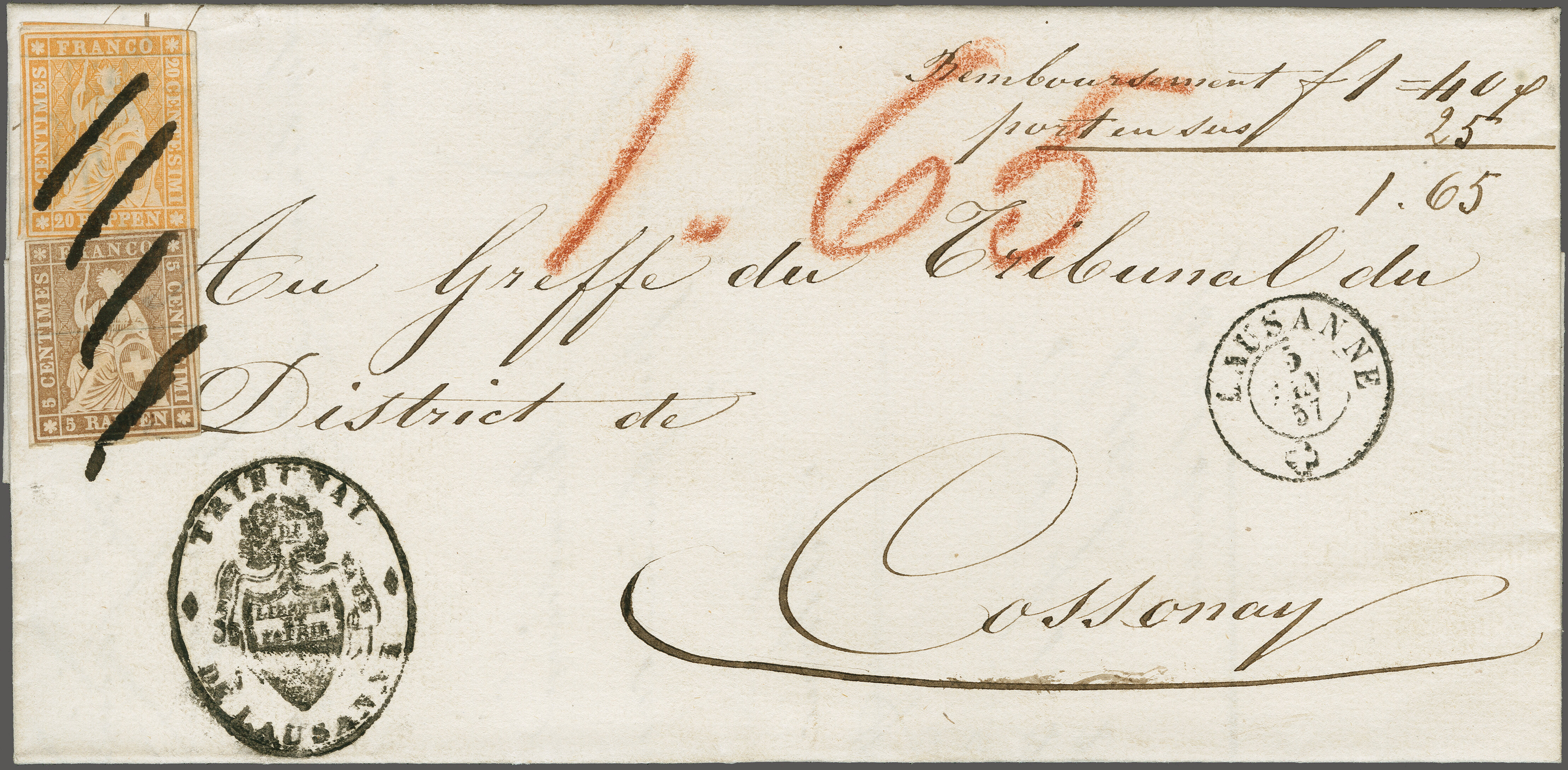 57" sowie amtlichem Absenderstp. "TRIBUNAL / DE LAUSANNE" auf grossformatigem Nachnahme-Faltbrief der 3. Gewichtsstufe im 1. Briefkreis nach Cossonay. Eine spekakuläre Behelfsentwertung auf archivfrischem Gerichtsbrief; Attest Eichele (2009). (Image 1)