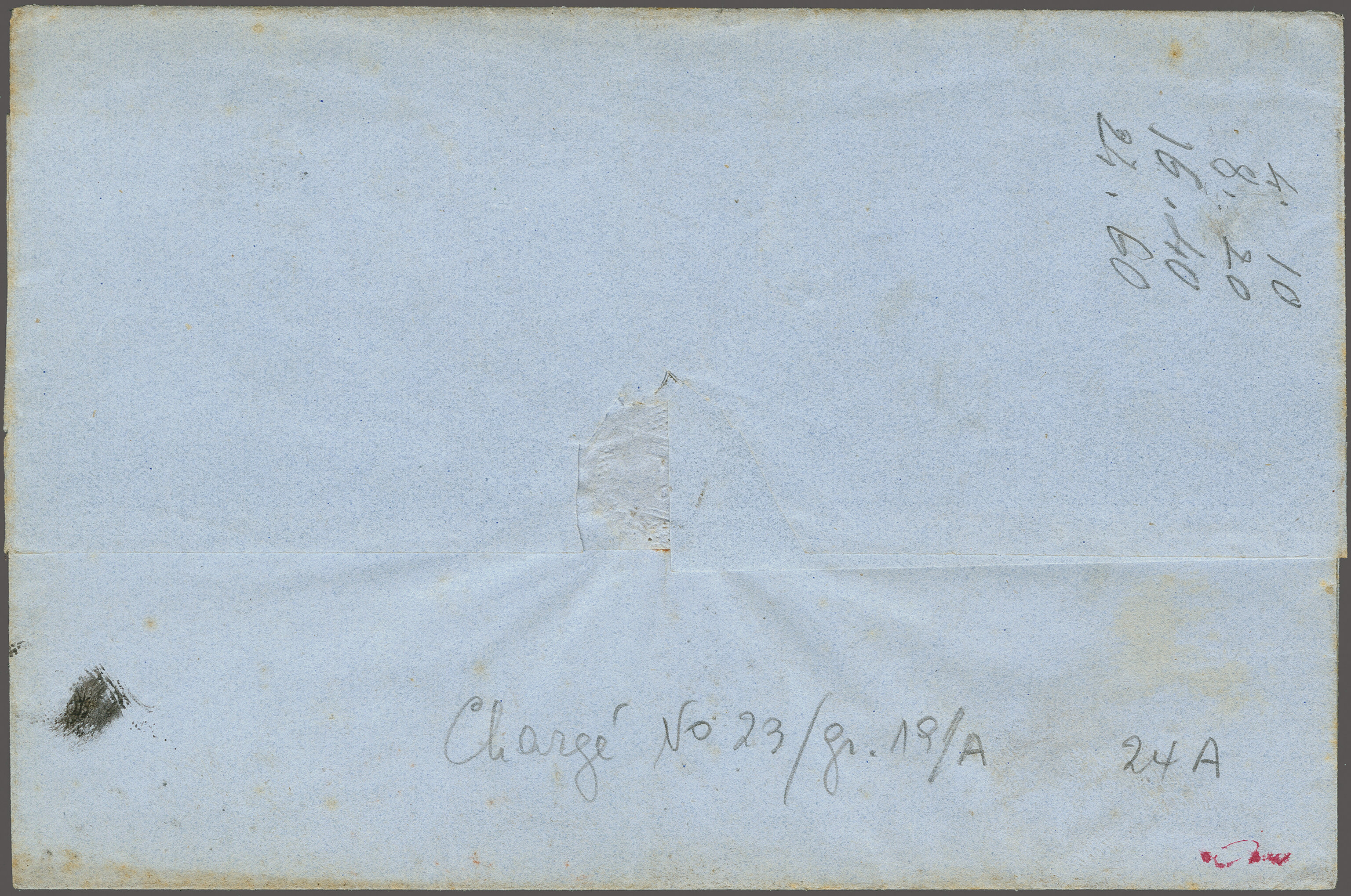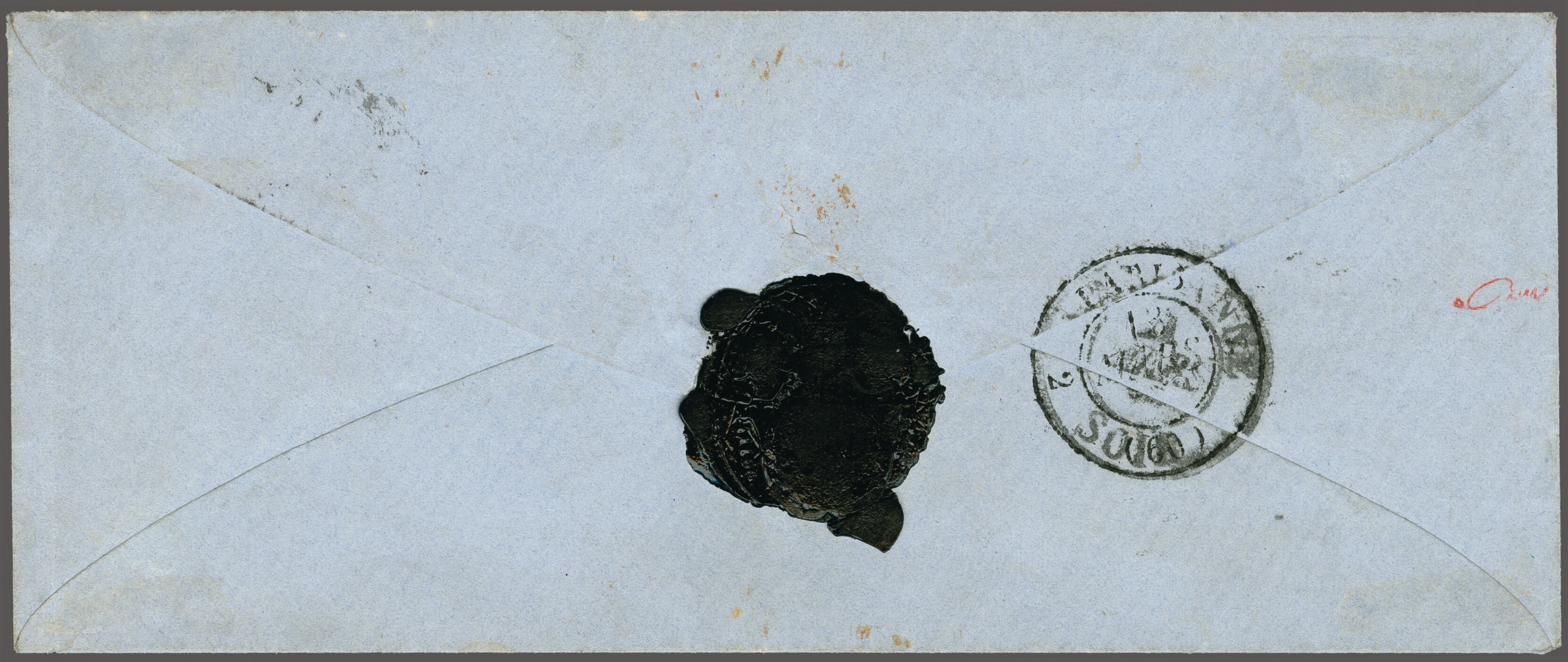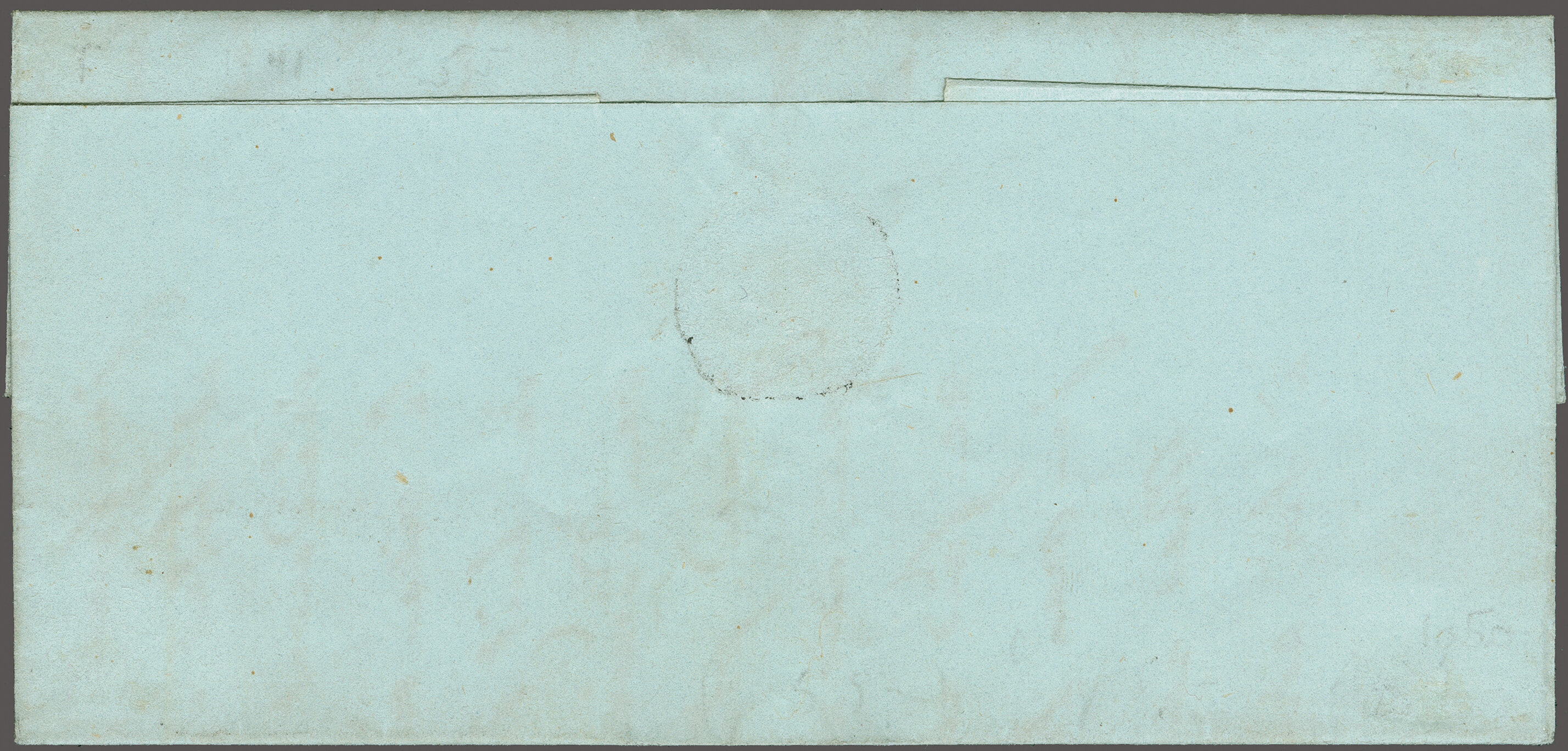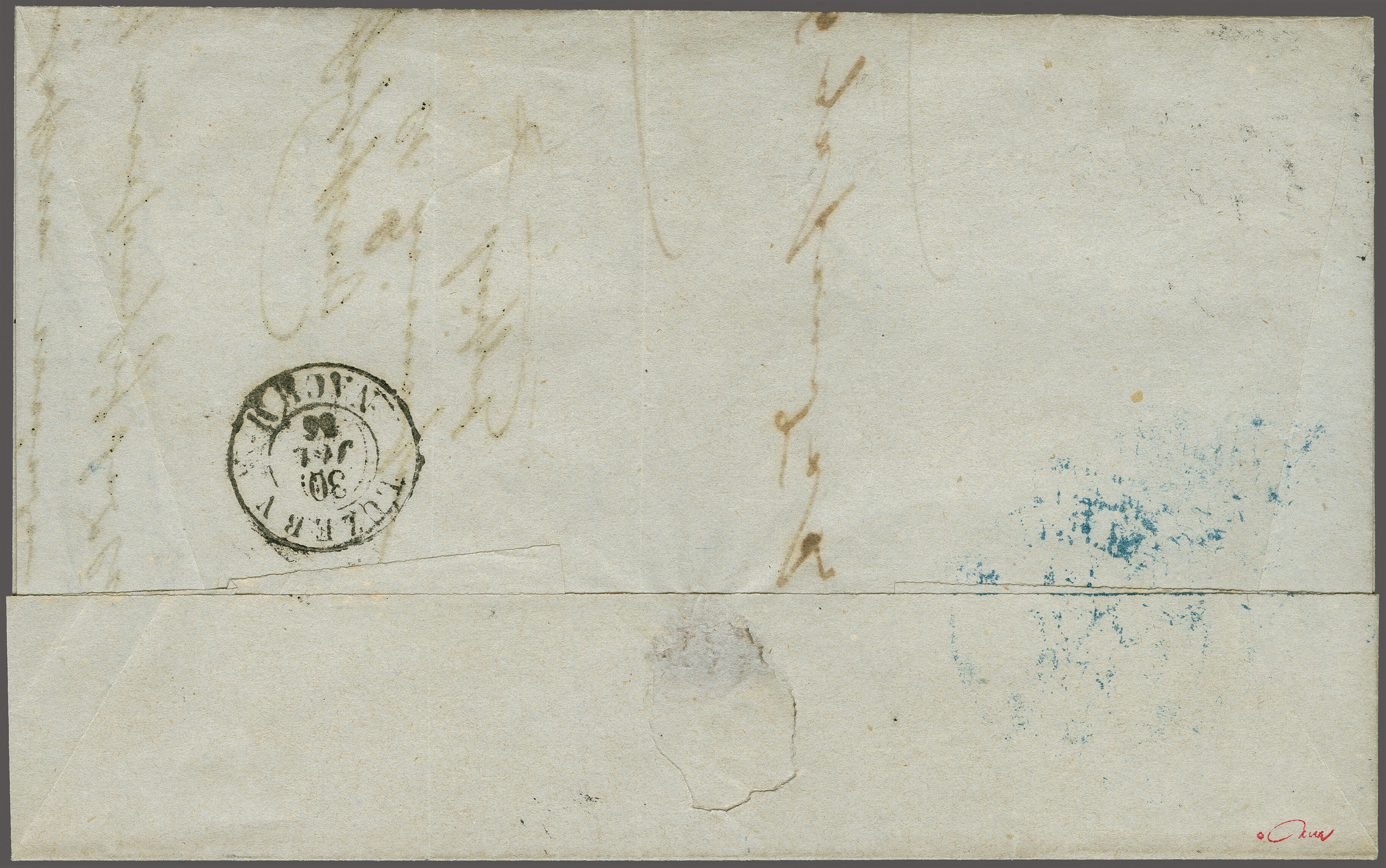 irrtümlich angebracht; die Vorausbezahlung des Portos über Alexandrien hinaus sollte erst 1857 möglich werden. Der erste bekannte frankierte Brief nach China überhaupt und eine spektakuläre Verwendung der Strubelausgabe in ihrer zweiten Woche; ein