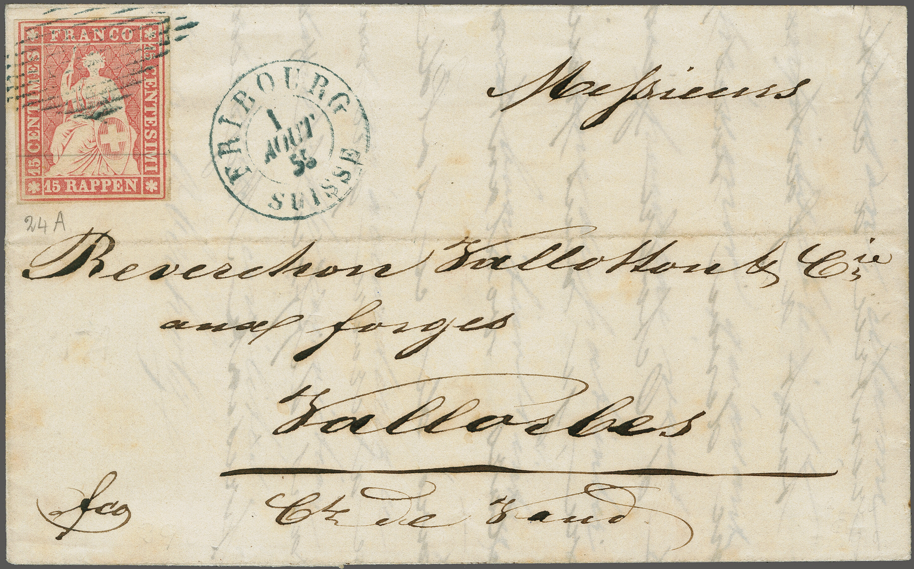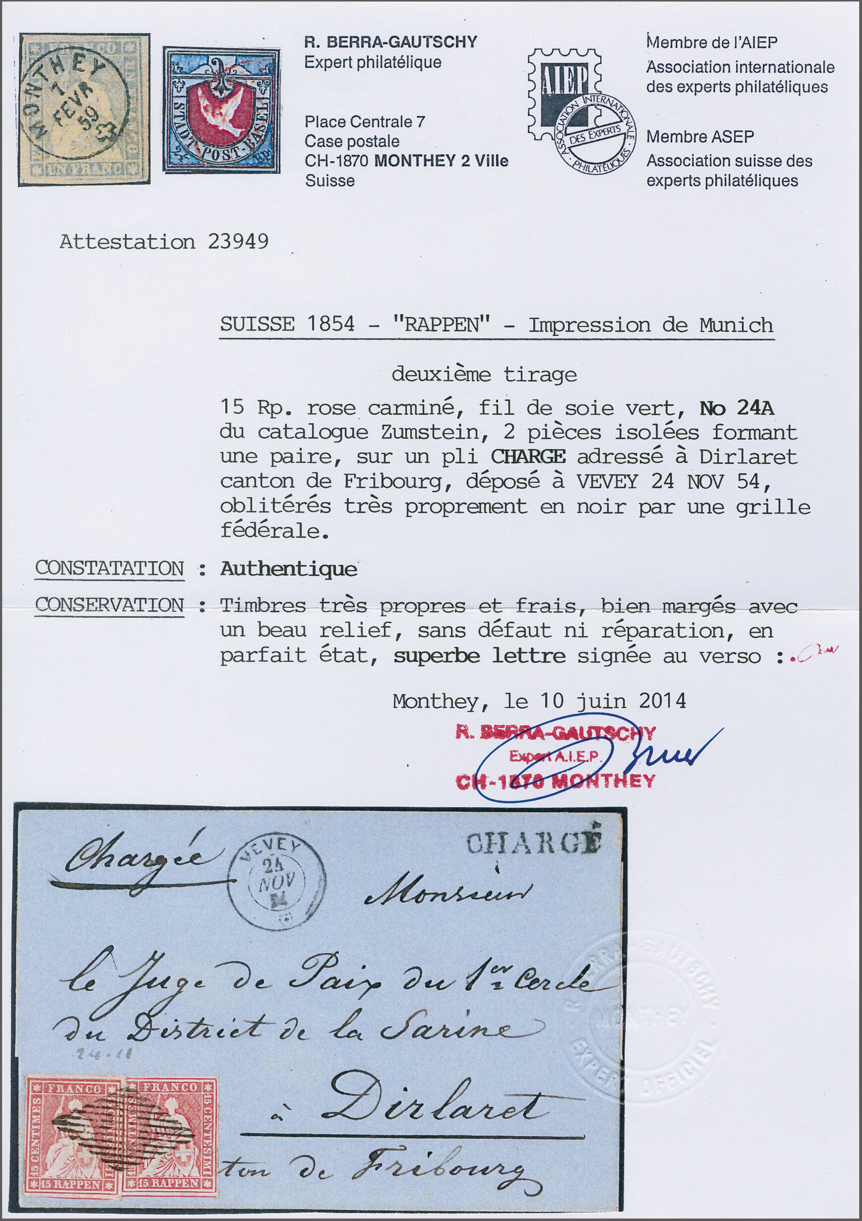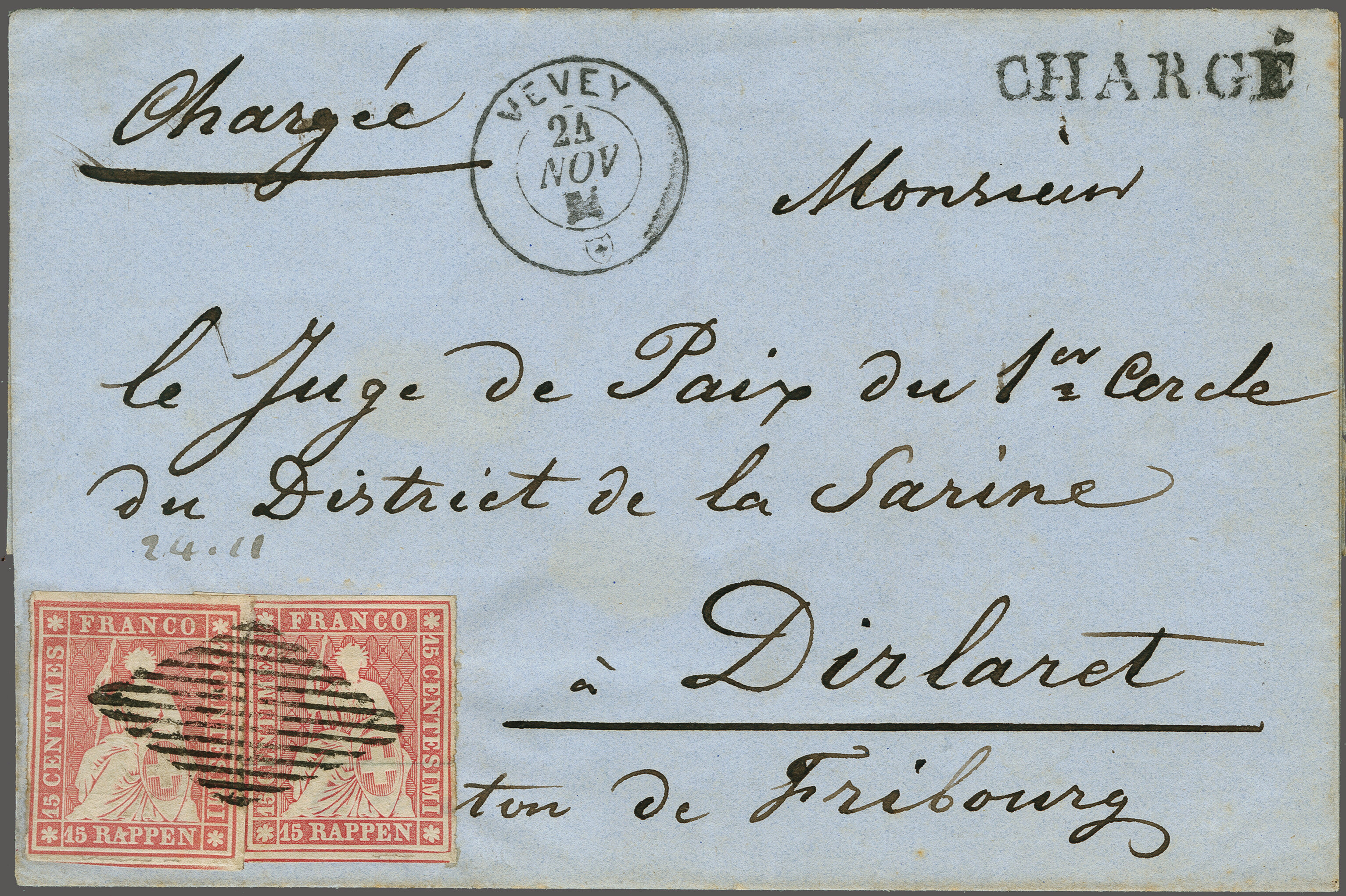 54" und Stabstp. "CHARGÉ" auf eingeschriebener Faltbriefhülle im 3. Briefkreis an den Friedensrichter des Sensebezirks in "Dirlaret" (Rechthalten). Ein schöner Brief mit Portoverdoppelung für das Einschreiben; Attest Berra (2014). (Image 1)