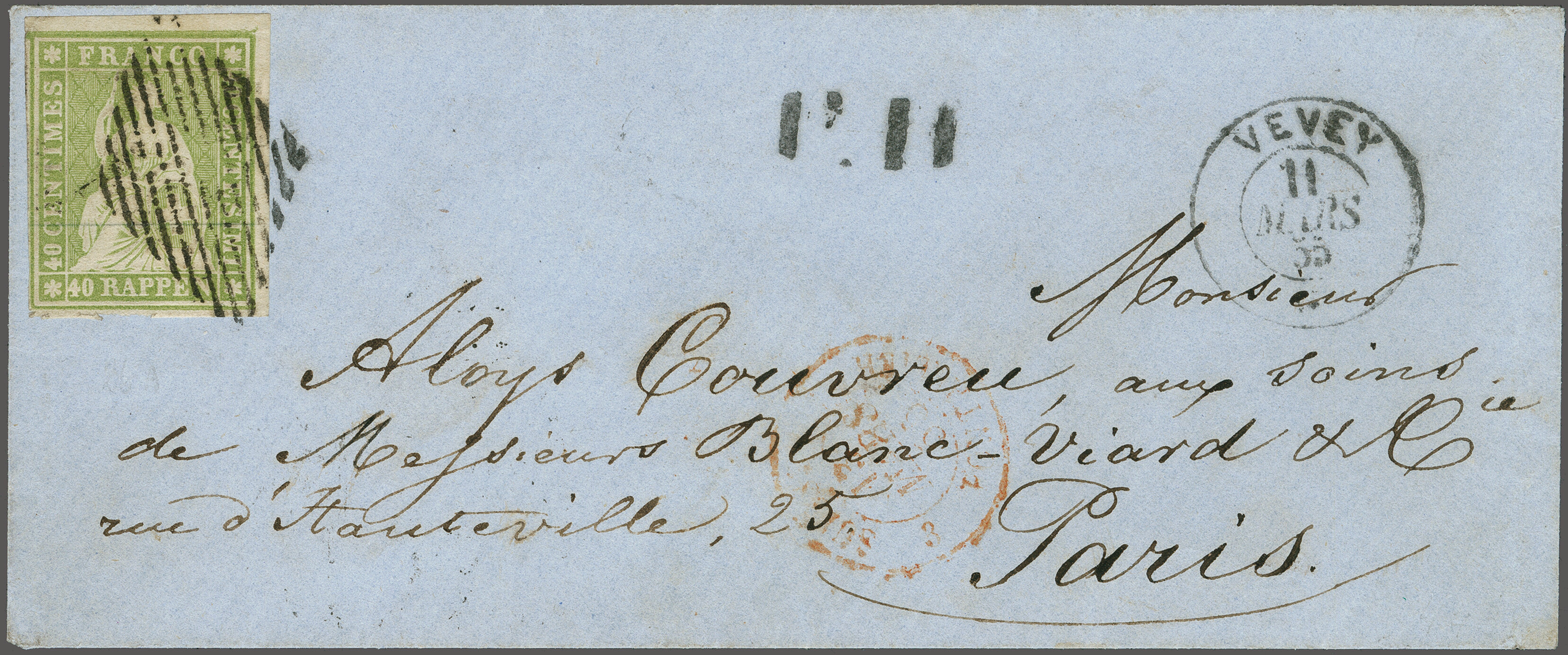 nebenges. "P.D." des II. Postkreises (AW 336) und kl. Zweikreisstp. "VEVEY 11 MARS 55", alle in schwarz, auf dekorativem Damenbriefumschlag nach Paris. Vorders. franz. Grenzübergangsstp. "SUISSE / PONTARLIER 12 MARS 55" in rot und rücks. Ankunftsstp.