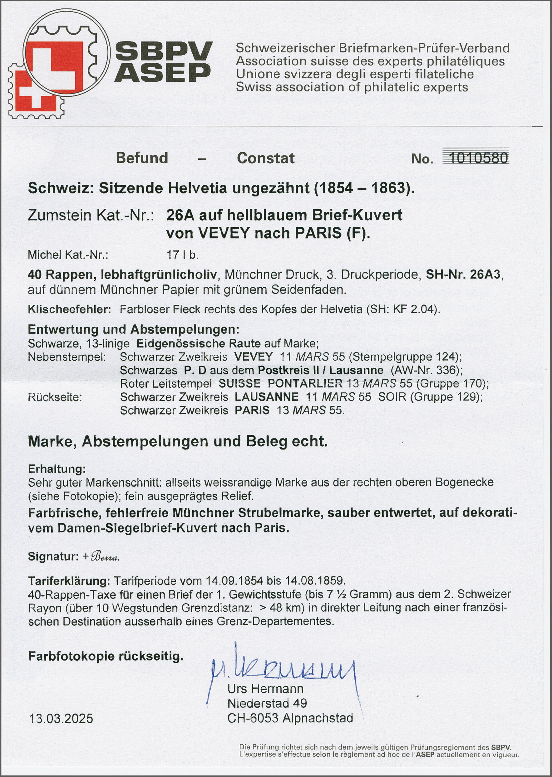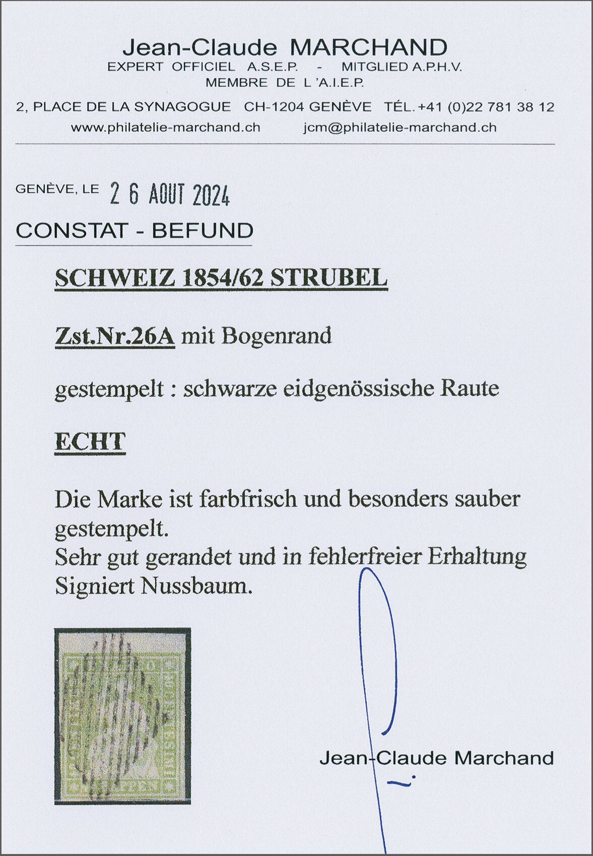 40 Rp. grünlicholiv, farbfr. und allseits weissrandig mit Bogenrand oben, klar und kontrastreich entw. mit schwarzer eidg. Raute. Signiert Nussbaum, Befund Marchand (2024) SBK = CHF 900. (Image 1)