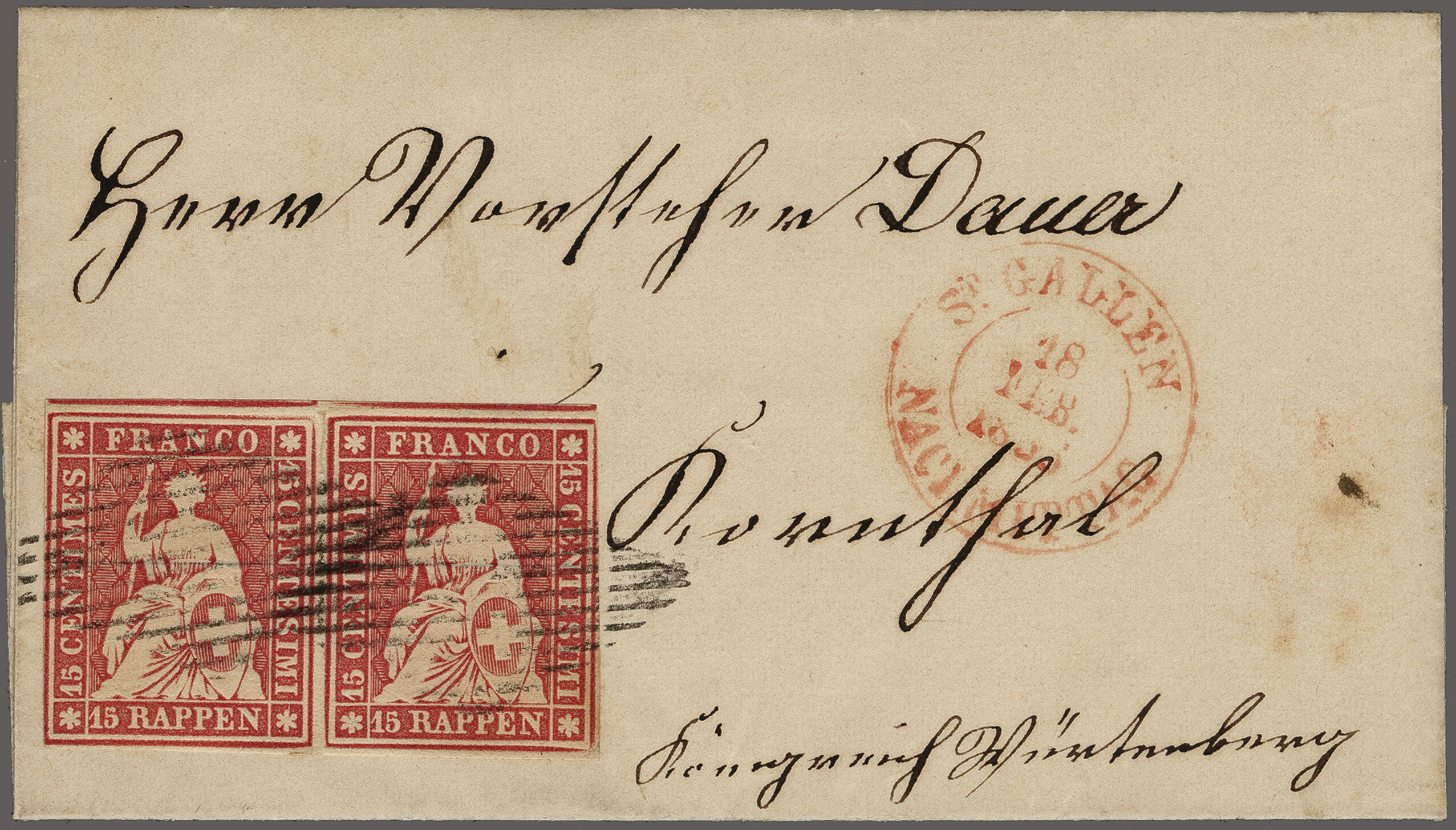 15 Rp. rotkarmin im waagrechten Paar, farbintensiv und breit- bis meist überrandig mit Teilen zweier Nachbarmarken, zart und übergehend entw. mit eidg. Raute, nebenges. roter "St. GALLEN 18 FEB. 1855" auf Faltbrief nach