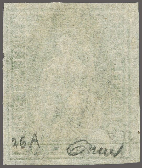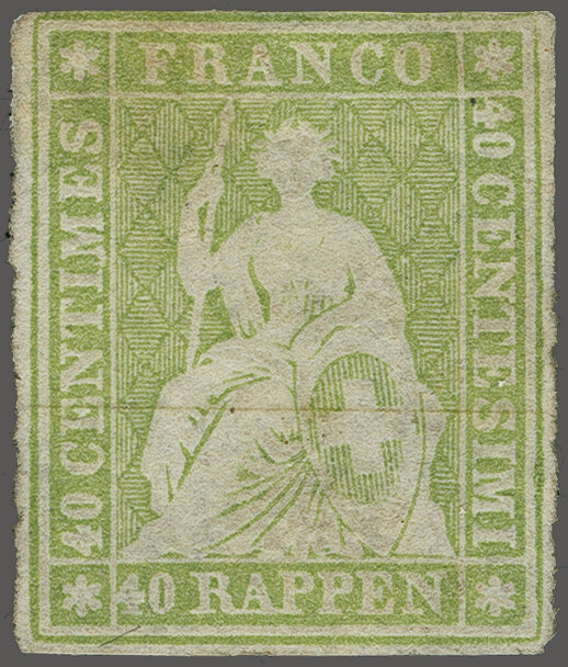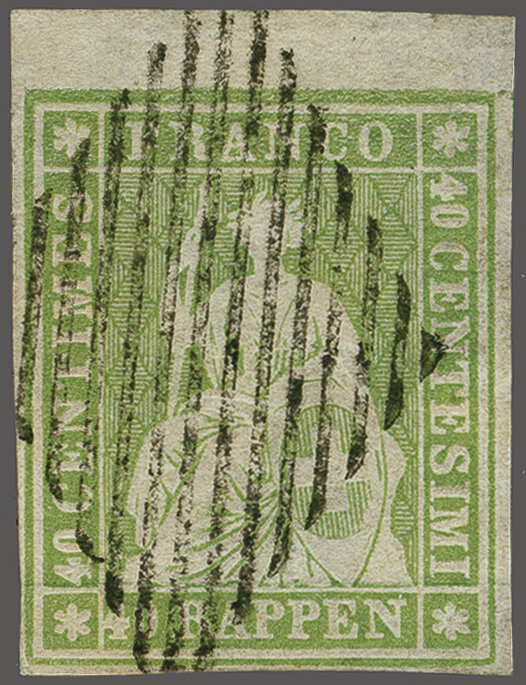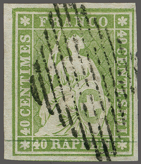 40 Rp. grünlicholiv mit stark nach unten verschobenem Seidenfaden, farbintensives und allseits weissrandiges Luxusstück mit breitem Bogenrand unten und links, schön klar entw. mit schwarzer eidg. Raute. Attest Berra (1999). (Image 1)