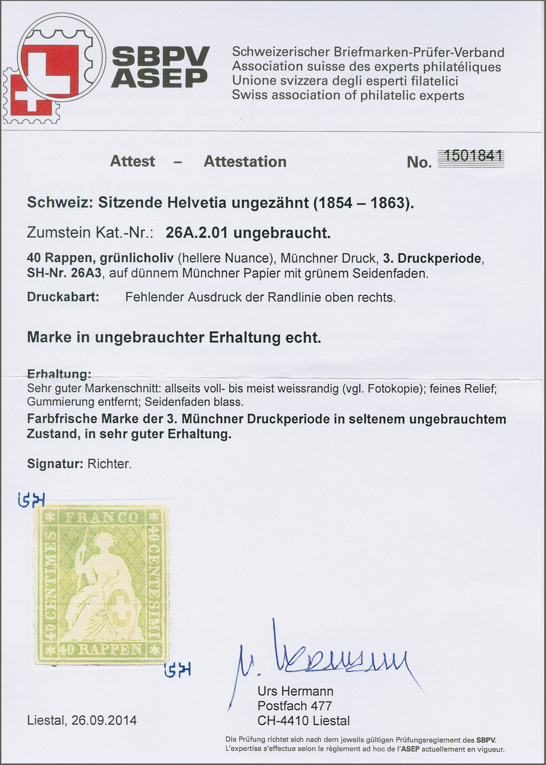 40 Rp. hellgrünlicholiv, farbfr. und voll- bis weissrandig mit fein ausgeprägtem Relief, ungebraucht ohne Gummierung (Seidenfaden blass). Signiert Richter, Attest Hermann (2014). SBK=CHF 2'800. (Image 1)