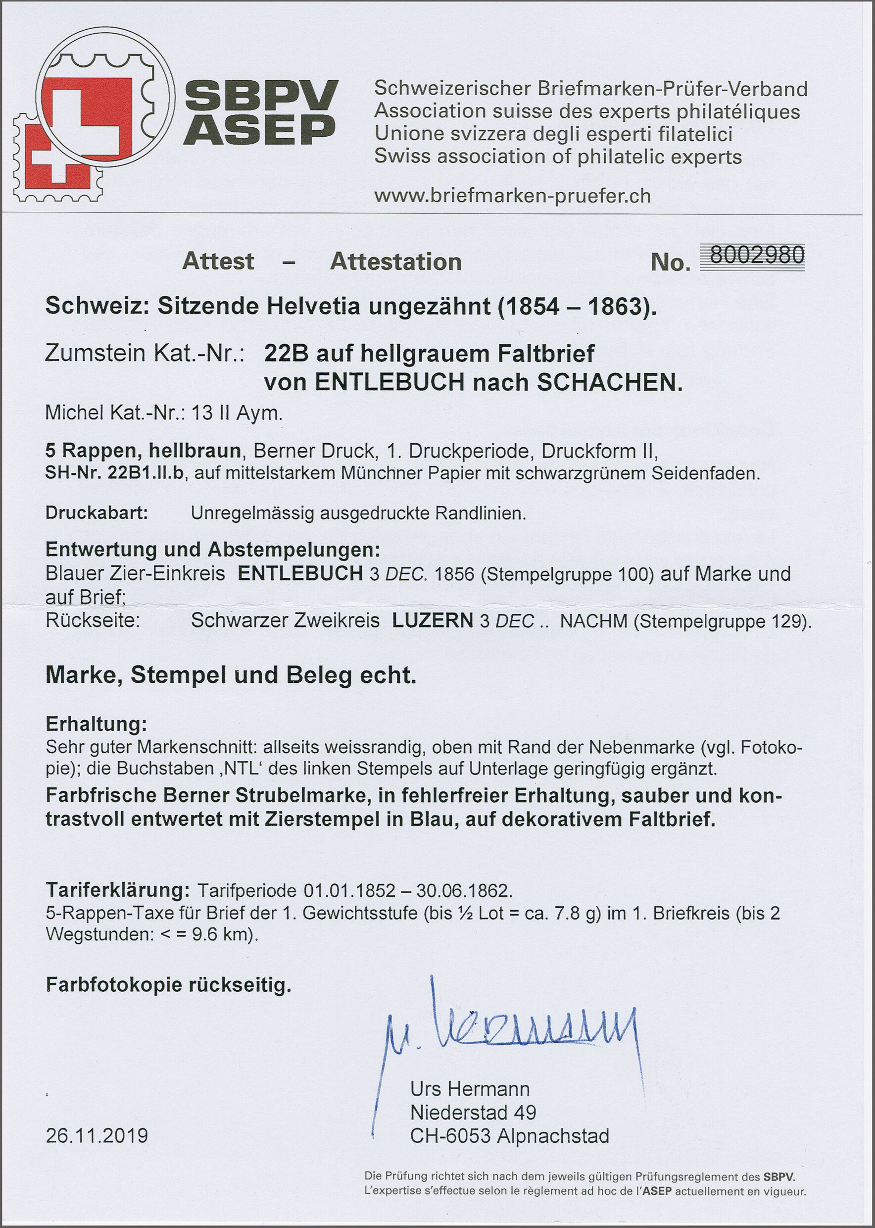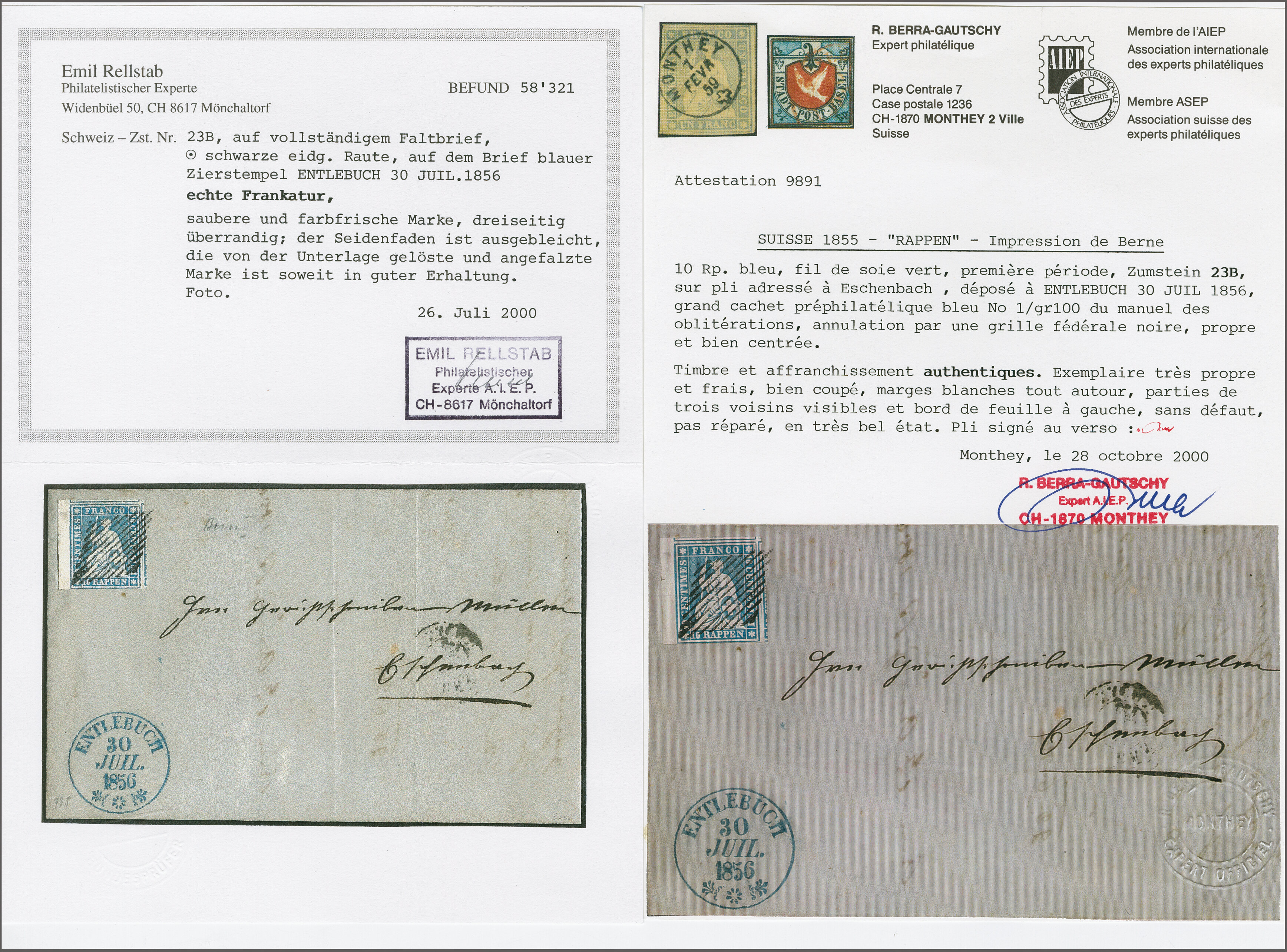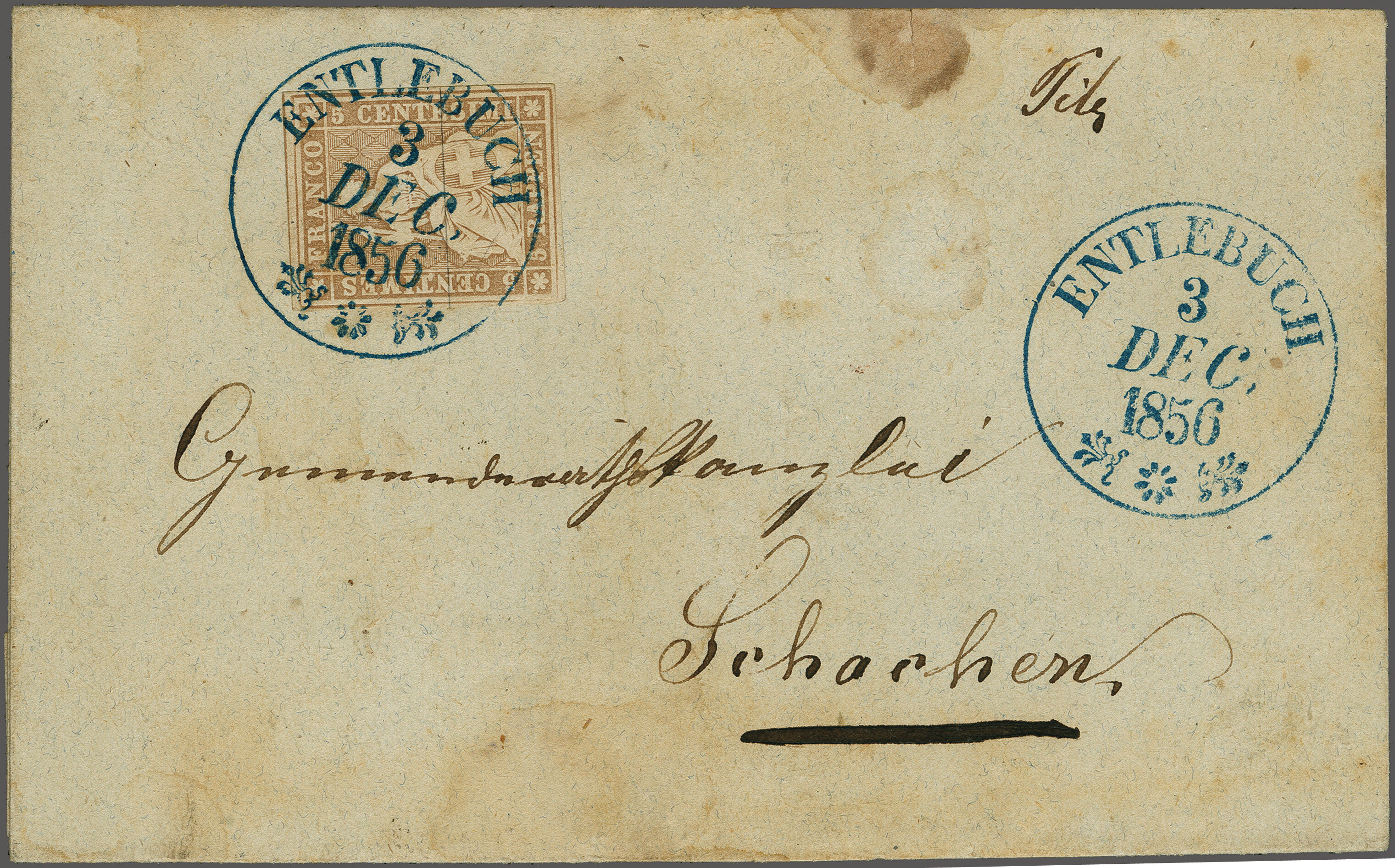 5 Rp. hellbraun, farbfr. und allseits weissrandig, klar, dekorativ, kontrastreich und übergehend entw mit blauem Zierzweikreisstp. "ENTLEBUCH 3 DEC. 1856" mit weiterem Abschlag auf Unterlage (minimal ergänzt) auf Faltbrief