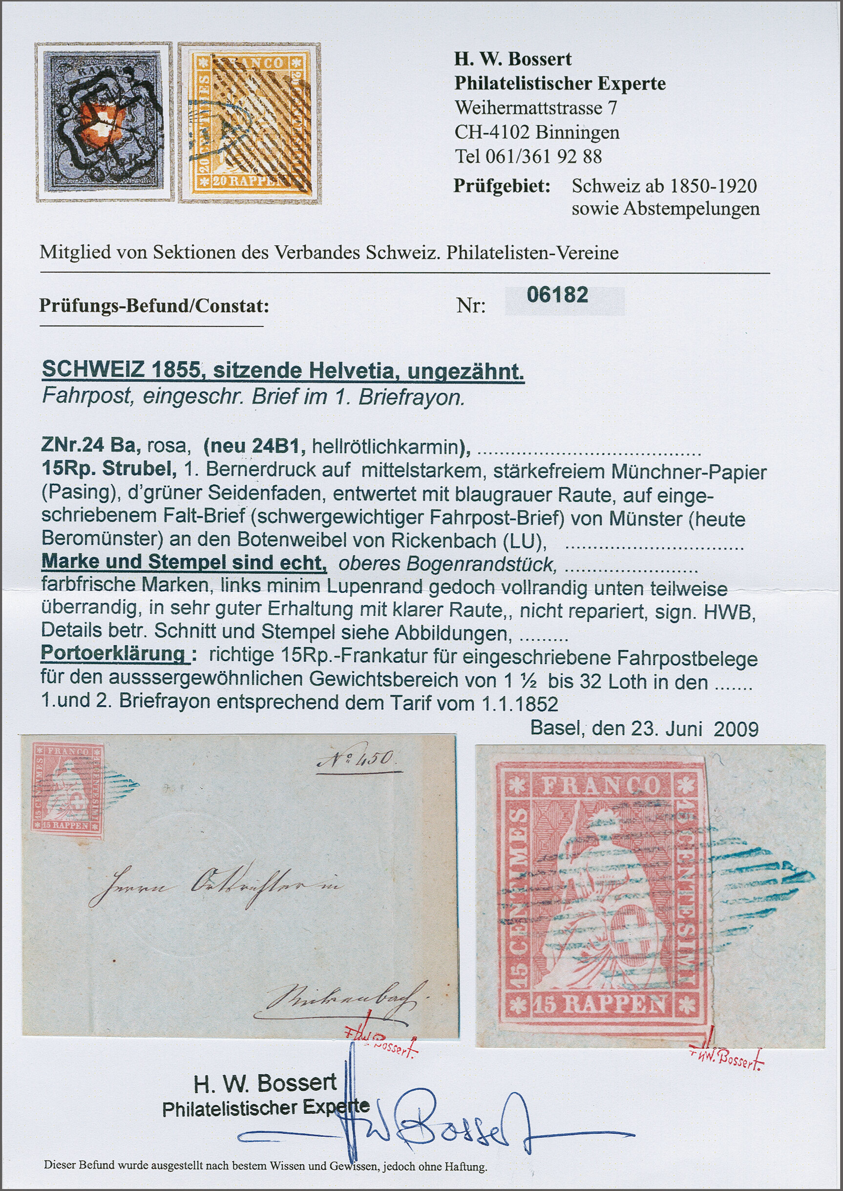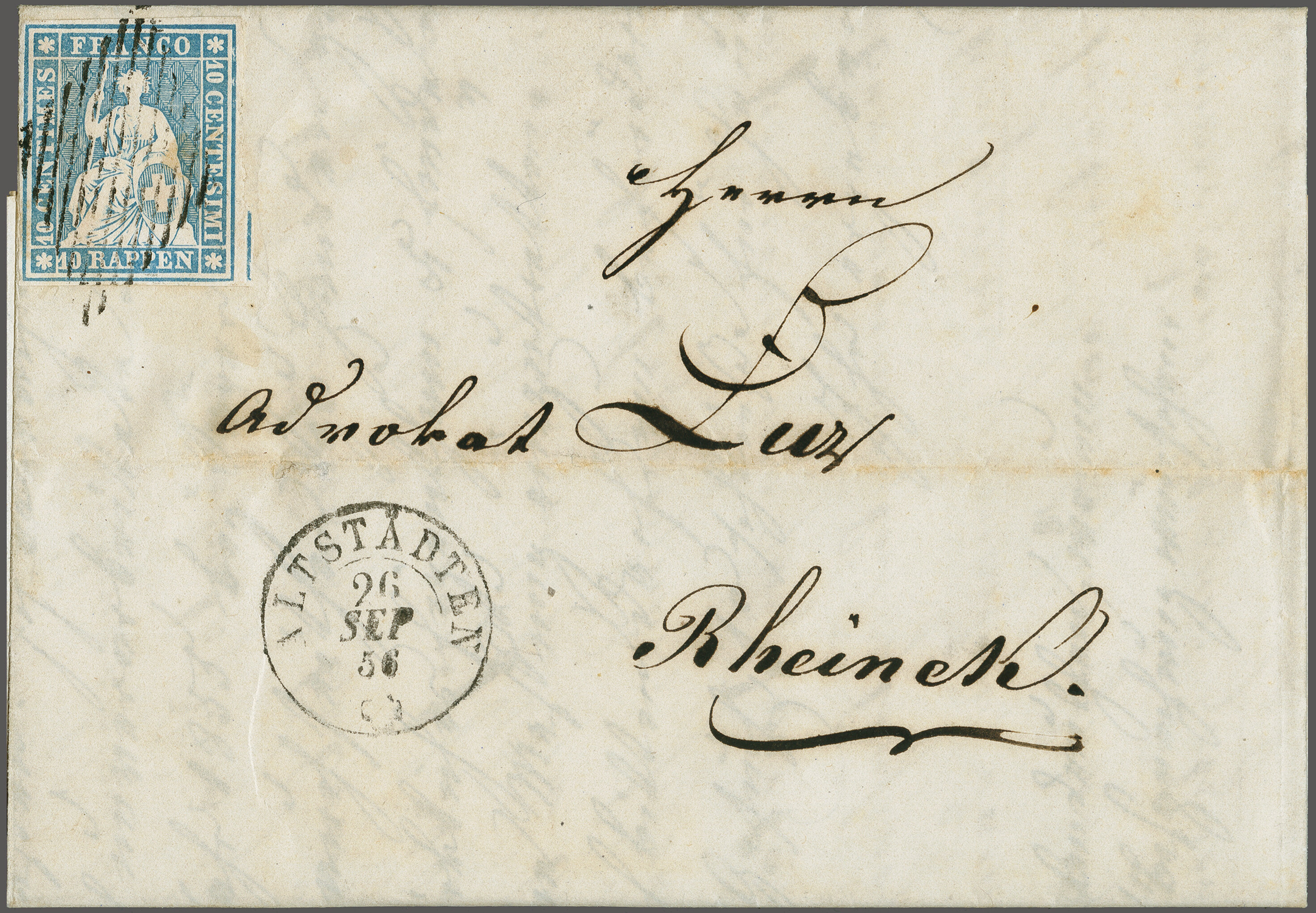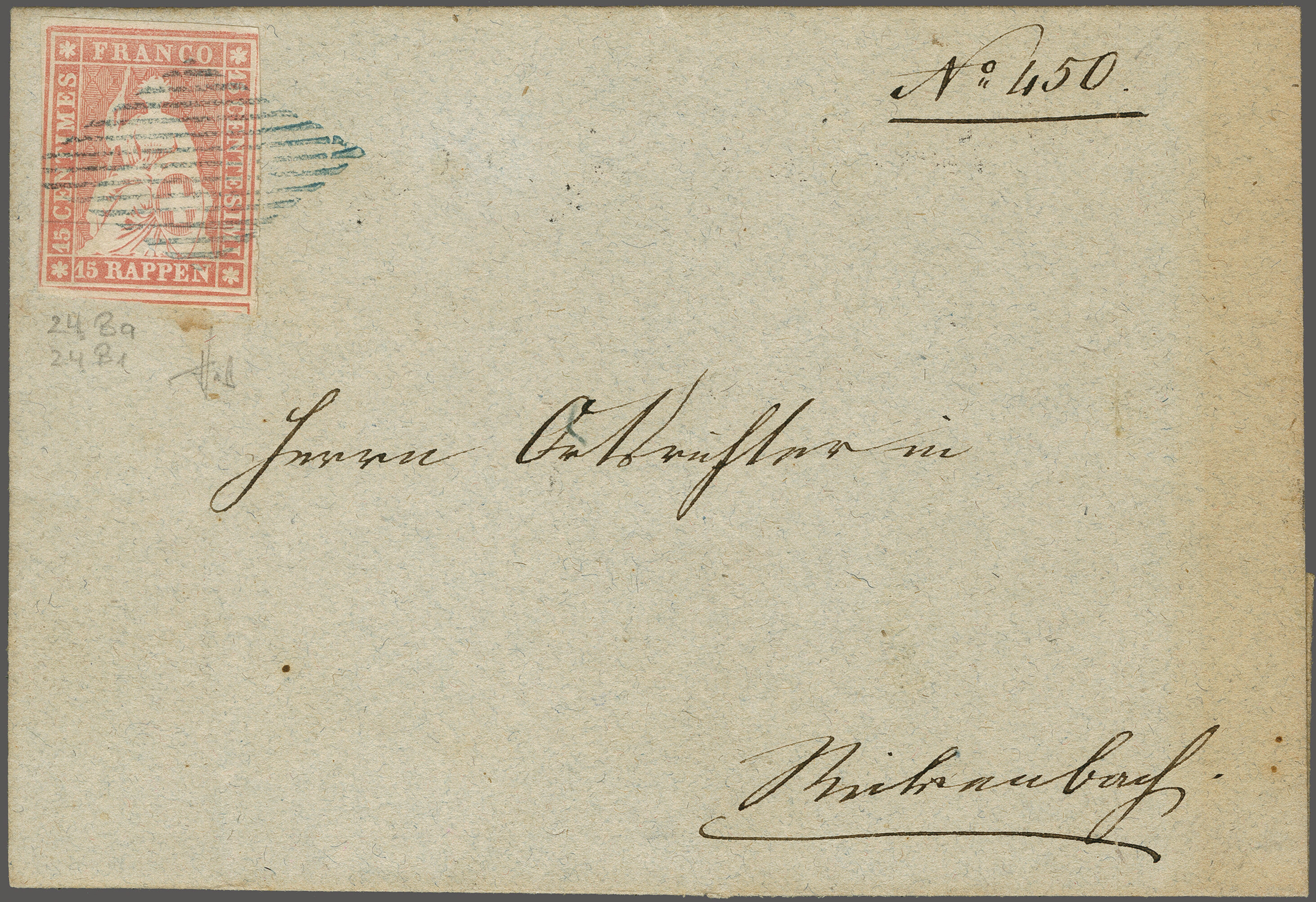 15 Rp. hellrötlichkarmin vom oberen Bogenrand, farbfr. und voll- bis überrandig mit Teilen der unteren Nachbarmarke, zartklar, dekorativ und übergehend entw. mit blaugrauer Raute auf eingeschriebenem Faltbrief inwendig datiert