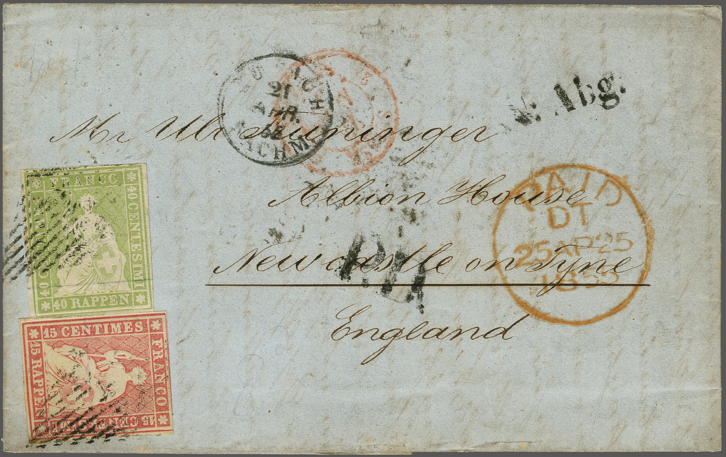 nebenges. "ZÜRICH 21 PR. 58 NACHM:" sowie "P.D.", "N: Abg.", franz. Grenzübergangsstp. "SUISSE St. LOUIS" und Londoner Transitstp (25 AP 1855), beide in Rot, rückseitig Ankunftsstp. "NEWCASTLE-ON-TYNE AP 25 1855". Brief aus dem zweiten
