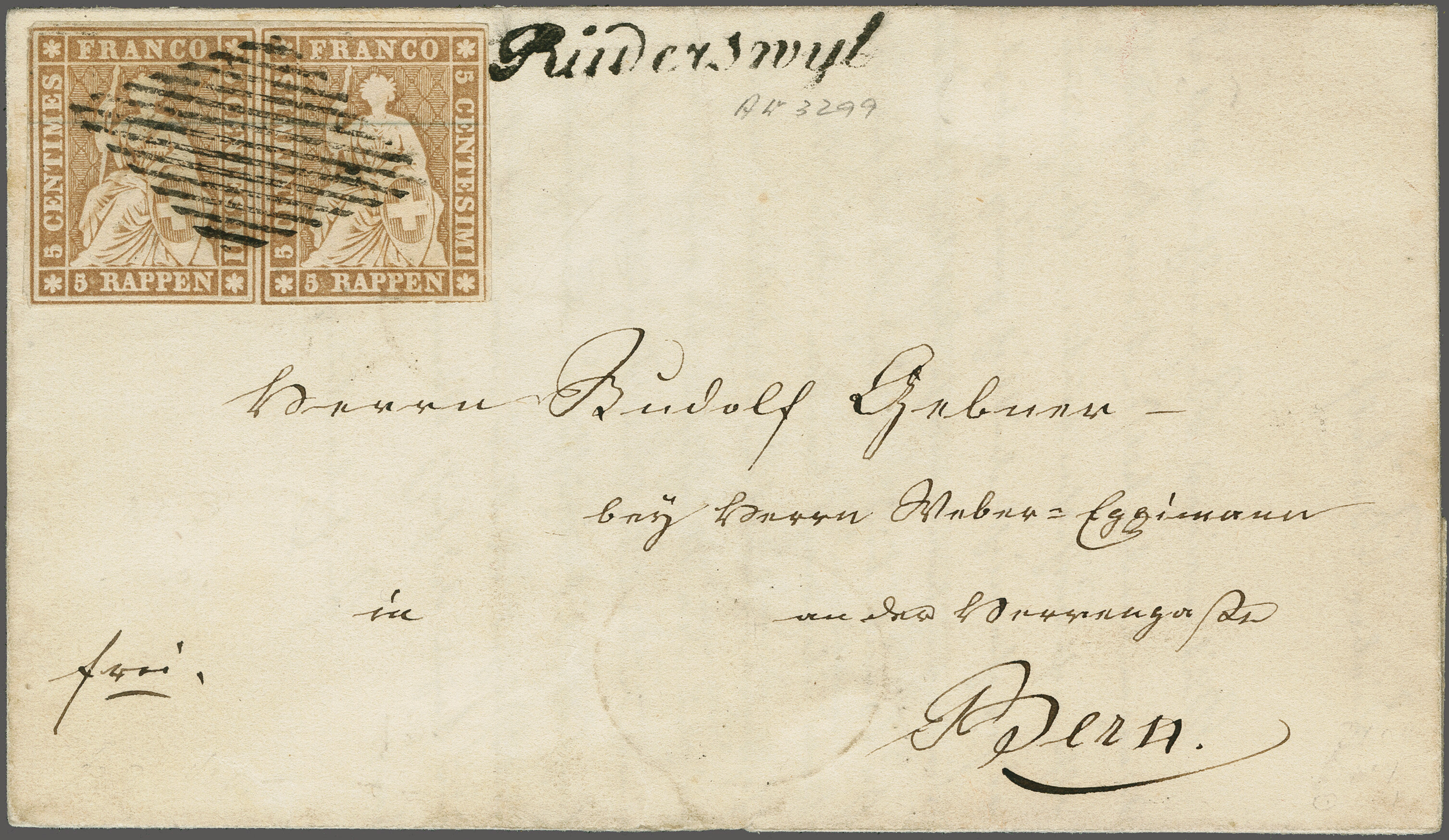 5 Rp. braun im waagr. Paar, farbfr. und voll- bis dreiseitig weissrandig, klar und voll aufges. entw. mit schwarzer eidg. Raute mit nebenges. Schreibschriftstp. "Rüderswyl" (AW 3299) auf schönem Faltbrief im 2. Briefkreis nach