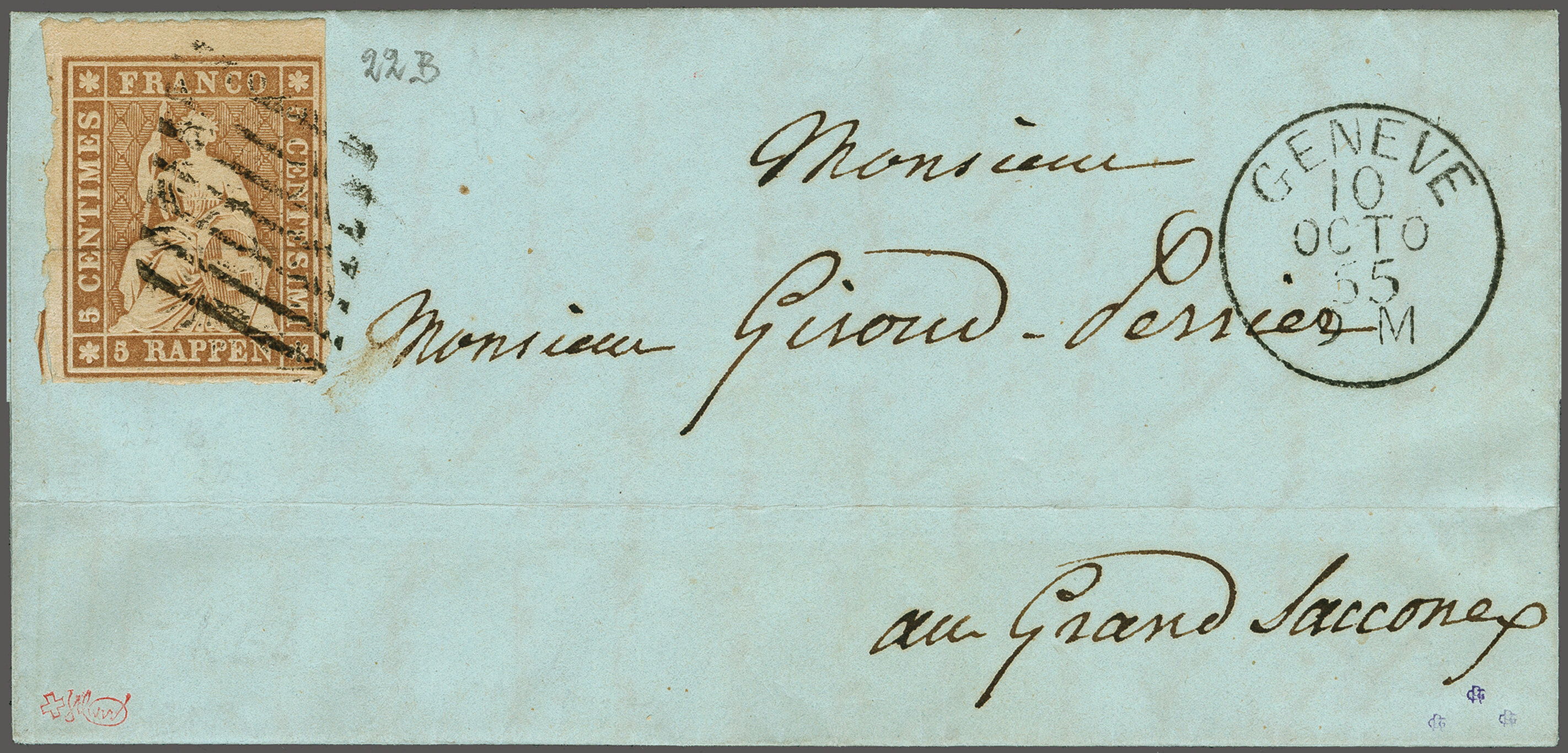 5 Rp. braun, farbintensiv und allseits weissrandig mit Bogenrand oben, klar und übergehend entw. mit steiler 7-liniger Genfer Raute (AW 19) in schwarz mit nebenges. Einkreisstp. "GENEVE 10 OCTO 55 9M" auf hübschem,