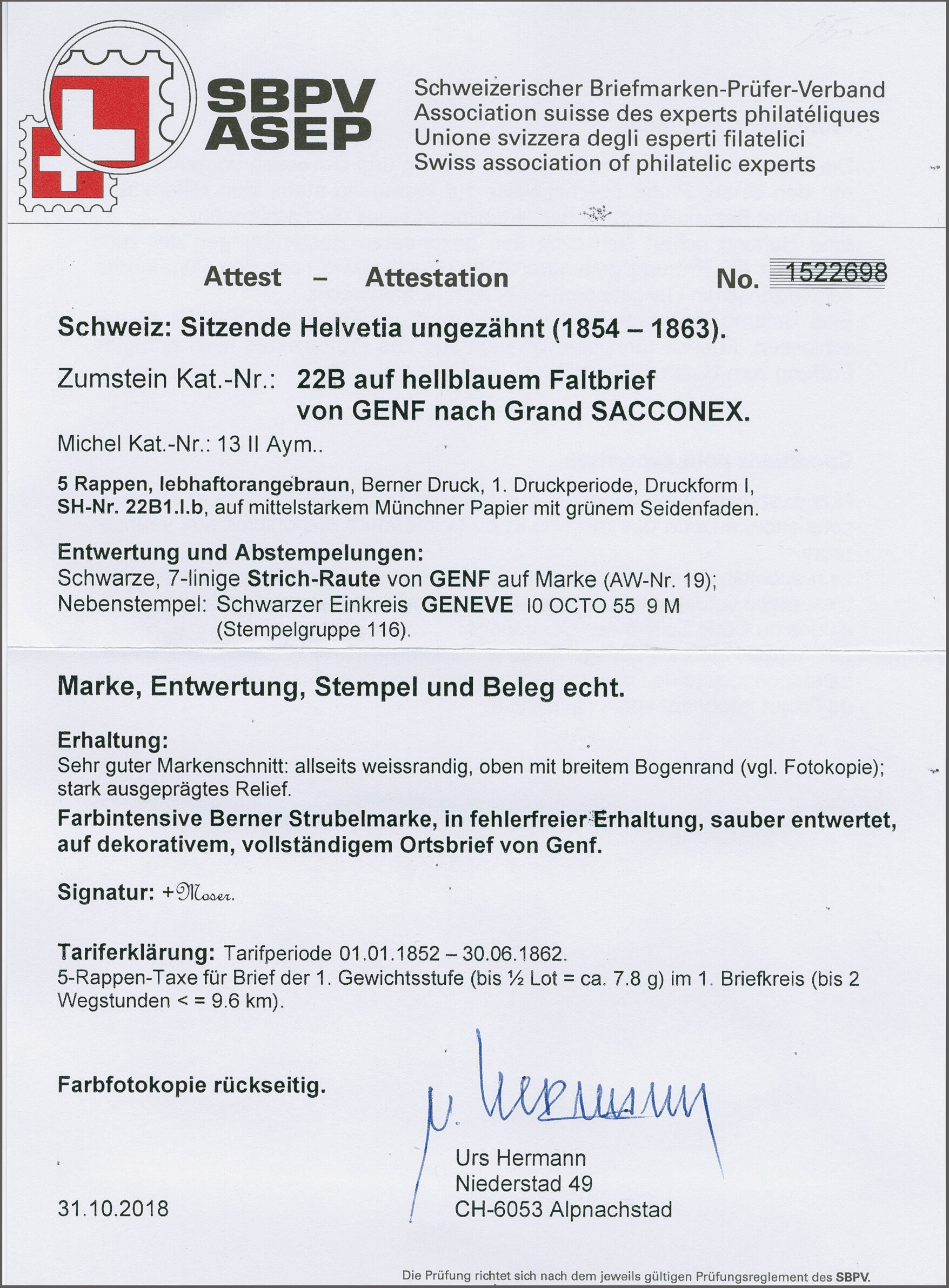 "Münster, den 19 Augst 1855", versandt im niedrigsten Fahrposttarif an den Ortsrichter in Rickenbach. Ein attraktiver Beleg aus Beromünster, Attest Bossert (2009). (Image 1)