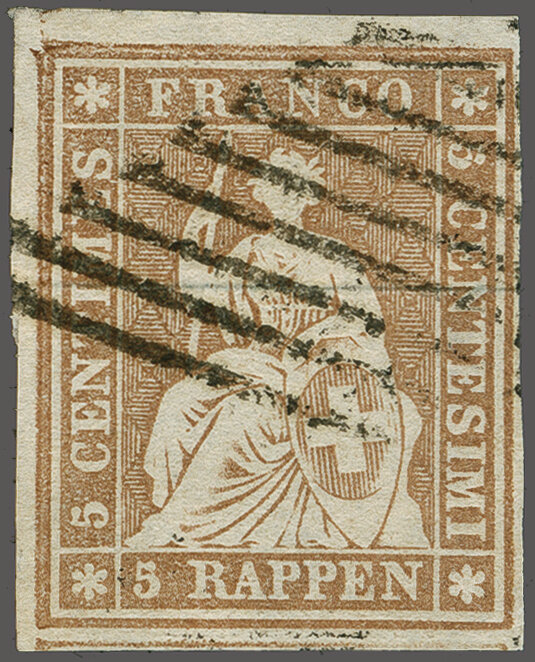 5 Rp. graubraun mit leichtem Schmitzdruck der linken und oberen Randlinie, farbfr. und allseits weissrandig mit Bogenrand links und oben sowie Ansatz der unteren Nebenmarke, feines Relief, klar entw. mit schwarzer Genfer