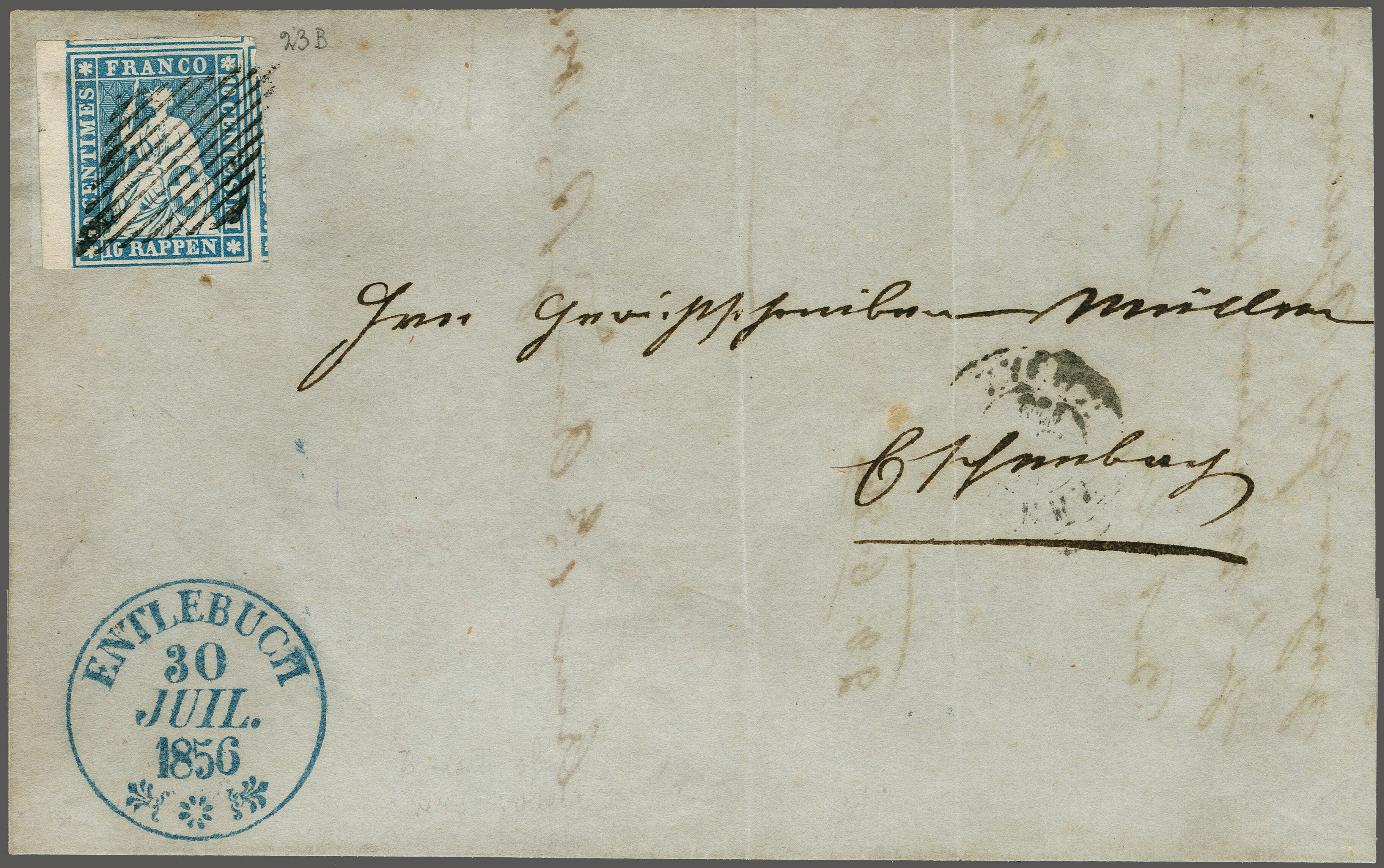 "ENTLEBUCH 30 JUIL 1856" in blau auf vollst. Faltbrief im 2. Briefkreis nach Eschenbach (Marke zur Kontrolle gelöst und zurückgeklebt). Rücks. Transitstp. "LUZERN 30 JUL. 56 NACHM". Attest Berra (2000). (Image 1)
