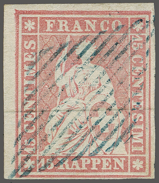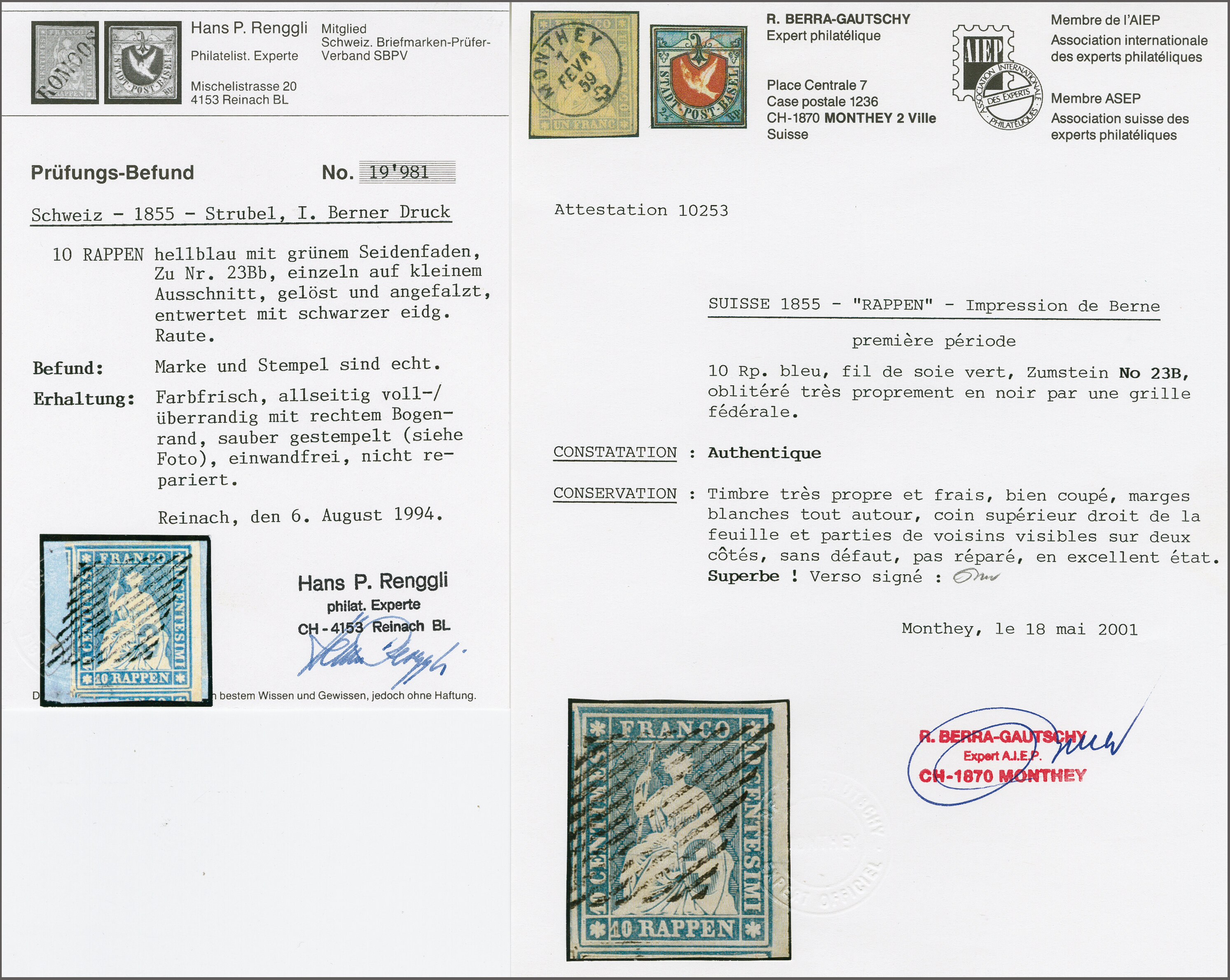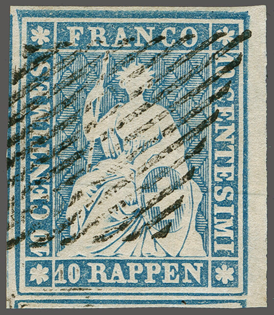 10 Rp. grauultramarin, farbfrisches und allseits weissrandiges Luxusstück mit breitem Bogenrand rechts und Teilen dreier Nebenmarken, fein ausgeprägtes Relief, zartklar entw. mit schwarzer eidg. Raute. Befund Renggli (1994),