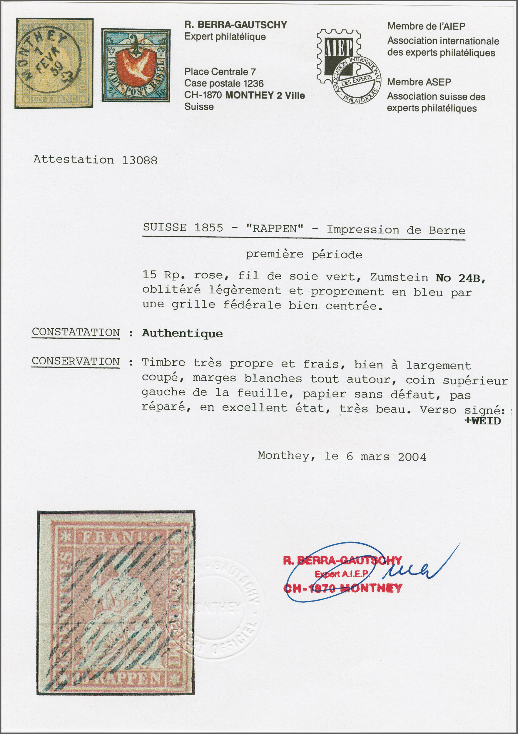 15 Rp. rötlichkarmin aus der linken oberen Bogenecke, farbfr. und weissrandig mit fein ausgeprägtem Relief (Seidenfadenkanal kurz gerauht), zartklar entw. mit diagonla aufgesetzter blauer eidg. Raute. Attest Berra (2004). (Image 1)