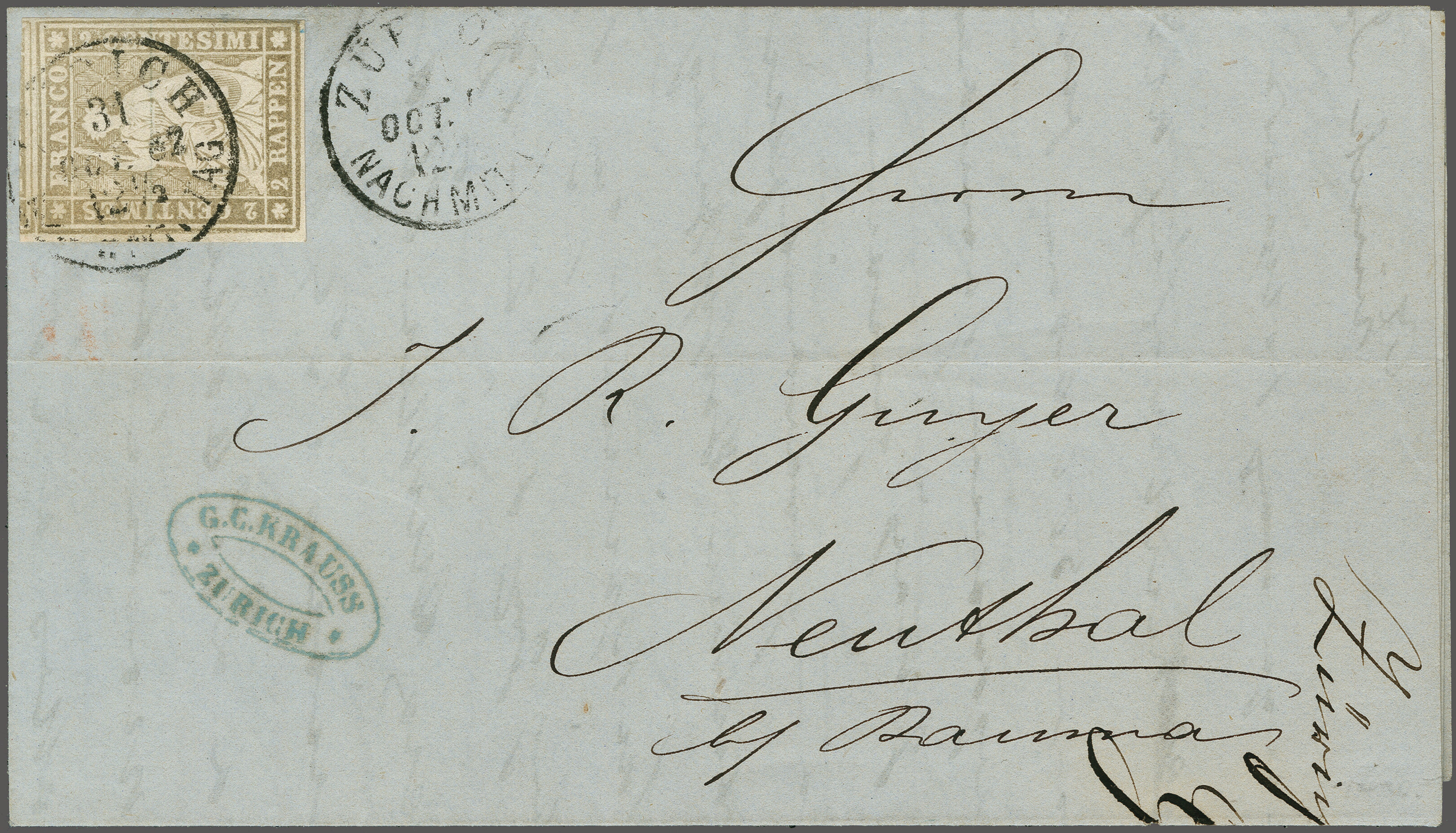 2 Rp. grau, farbfrisch und gut- bis fast durchweg weissrandig, klar und übergehend entw. mit schwarzem Einkreisstp. "ZÜRICH 31 OCT. 62 12½ NACHMITTAG" in schwarz, nebenges. zus. mit blauem Firmen-Ovalstp. "G. C. KRAUSS /