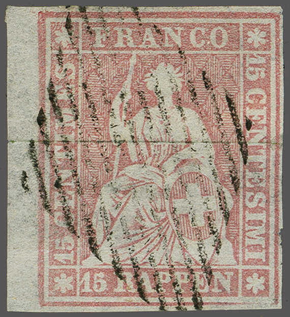 15 Rp. rötlichkarmin auf dünnem Münchner Papier, farbfrisches und weissrandiges Luxusstück mit Bogenrand links, zart entw. mit schwarzer eidg. Raute. Dekorativ; Attest Berra (1984). (Image 1)