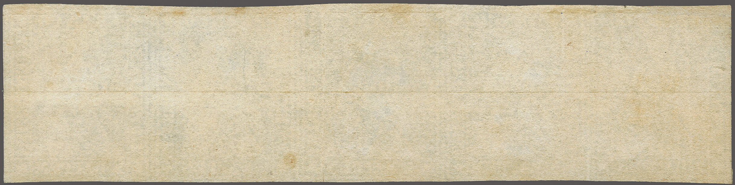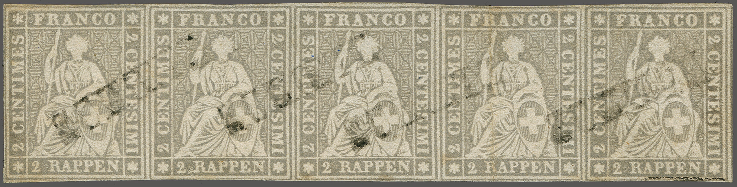 2 Rp. grau im waagr. Fünferstreifen mit auffällig sattem Druckbild, farbfr. und voll- bis weissrandig mit Teilen der linken Nebenmarke (linke obere Ecke leicht repariert, zwei gepresste senkr. Bugspuren), zart entw. mit vier
