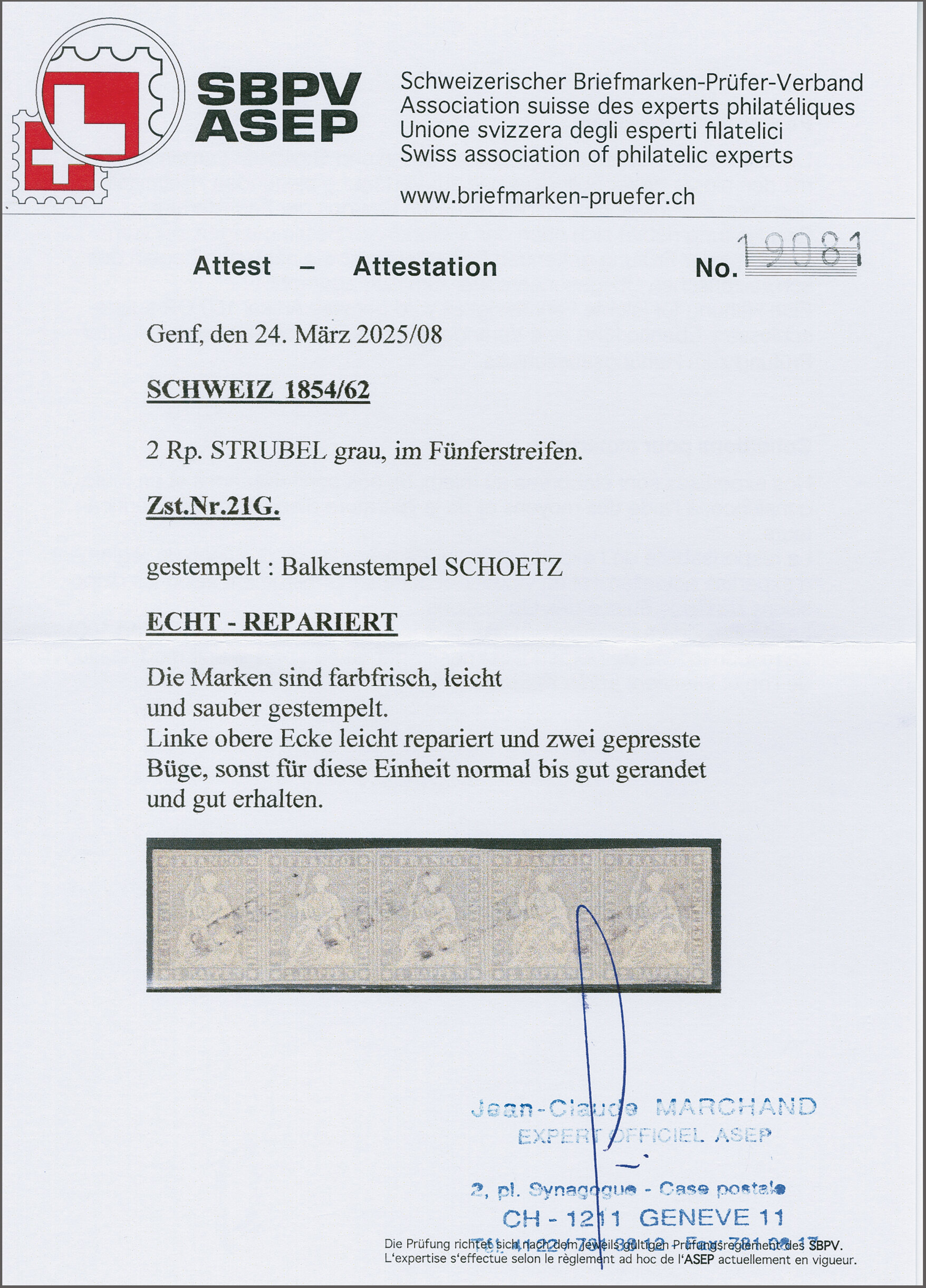 schön diagonal aufgesetzten Abschlägen des Stabstp. "SCHOETZ" (AW 1845) in schwarz. Eine seltene Einheit; Attest Marchand (2025). SBK=CHF 8'000. (Image