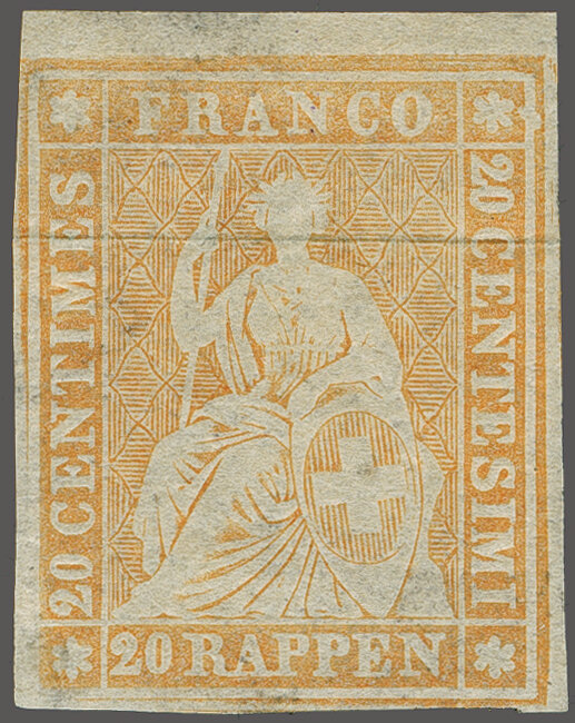 20 Rp. gelblichorange mit Schmitzdruck der oberen Randlinie, farbfr. und voll- bis meist weissrandig mit Bogenrand oben, fein ausgeprägtes Relief, ungebraucht mit grossen Teilen der Originalgummierung. Ein frisches und