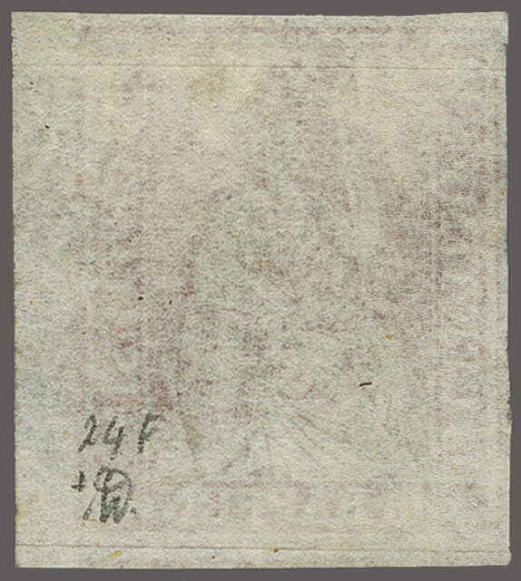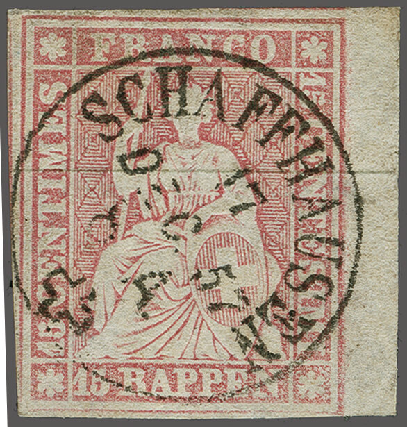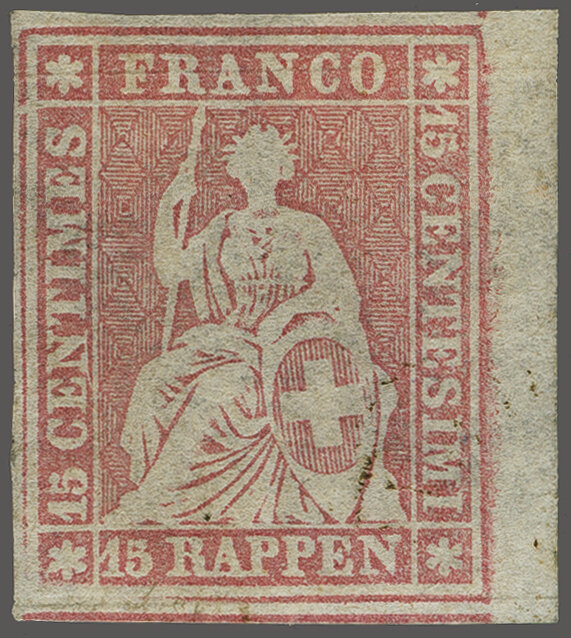 15 Rp. rötlichkarmin auf dünnem Münchner Papier, farbfrisches und allseits weissrandiges Luxusstück mit breitem Bogenrand rechts und kleinen Teilen dreier Nebenmarken, fein ausgeprägtes Relief, zart und übergehend entw. mit