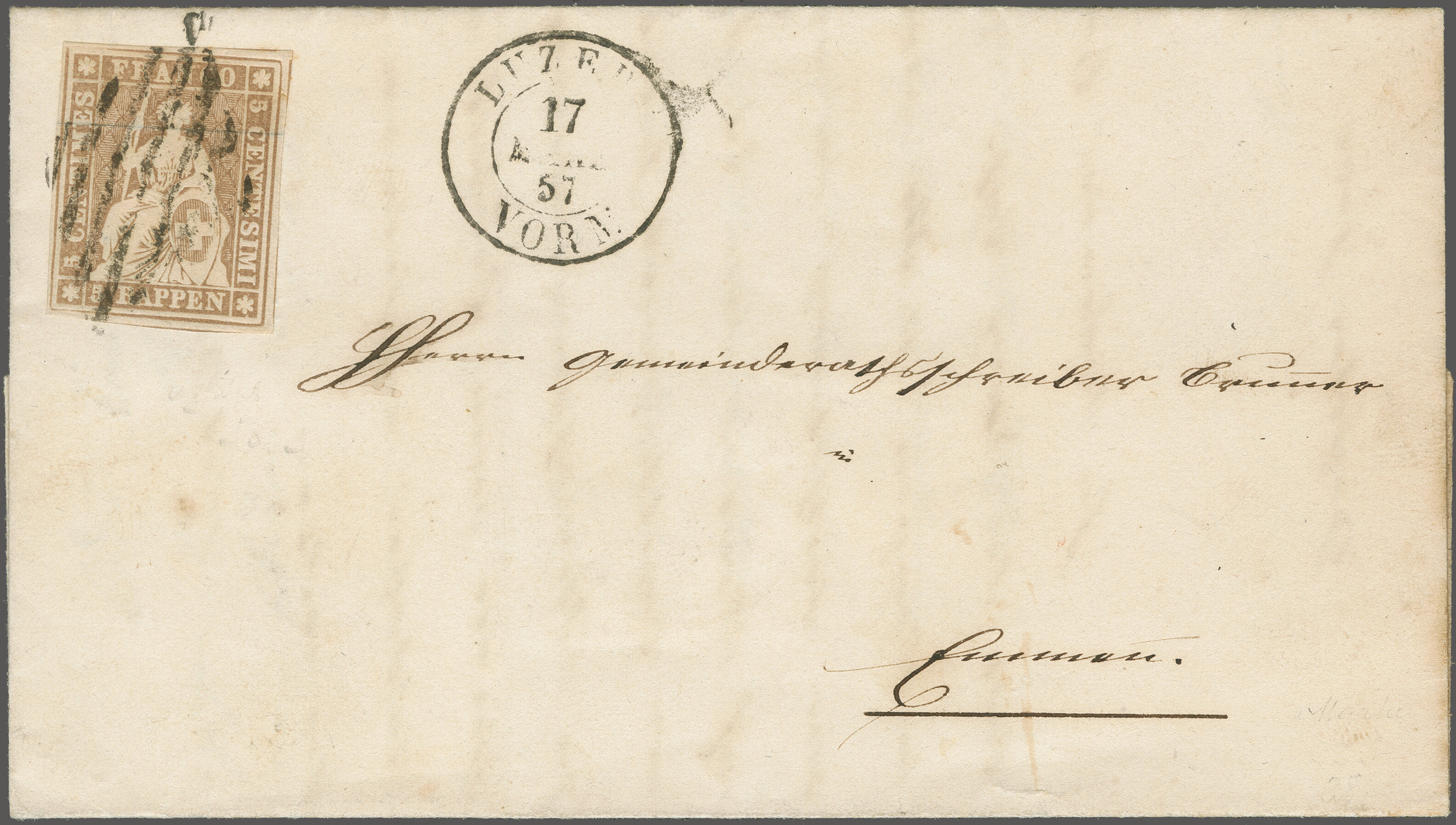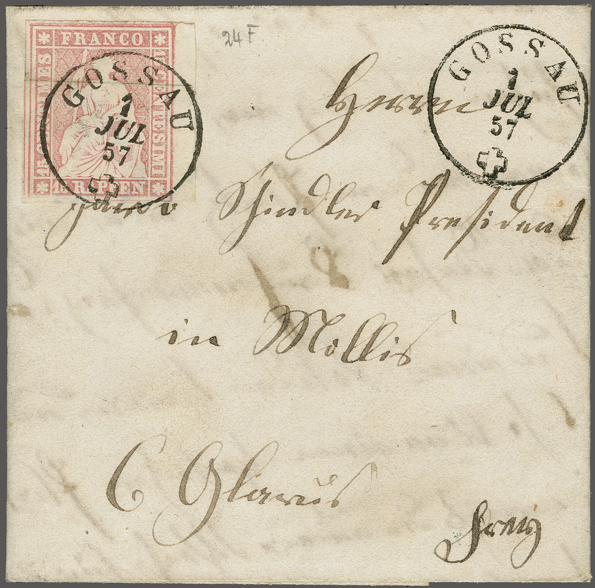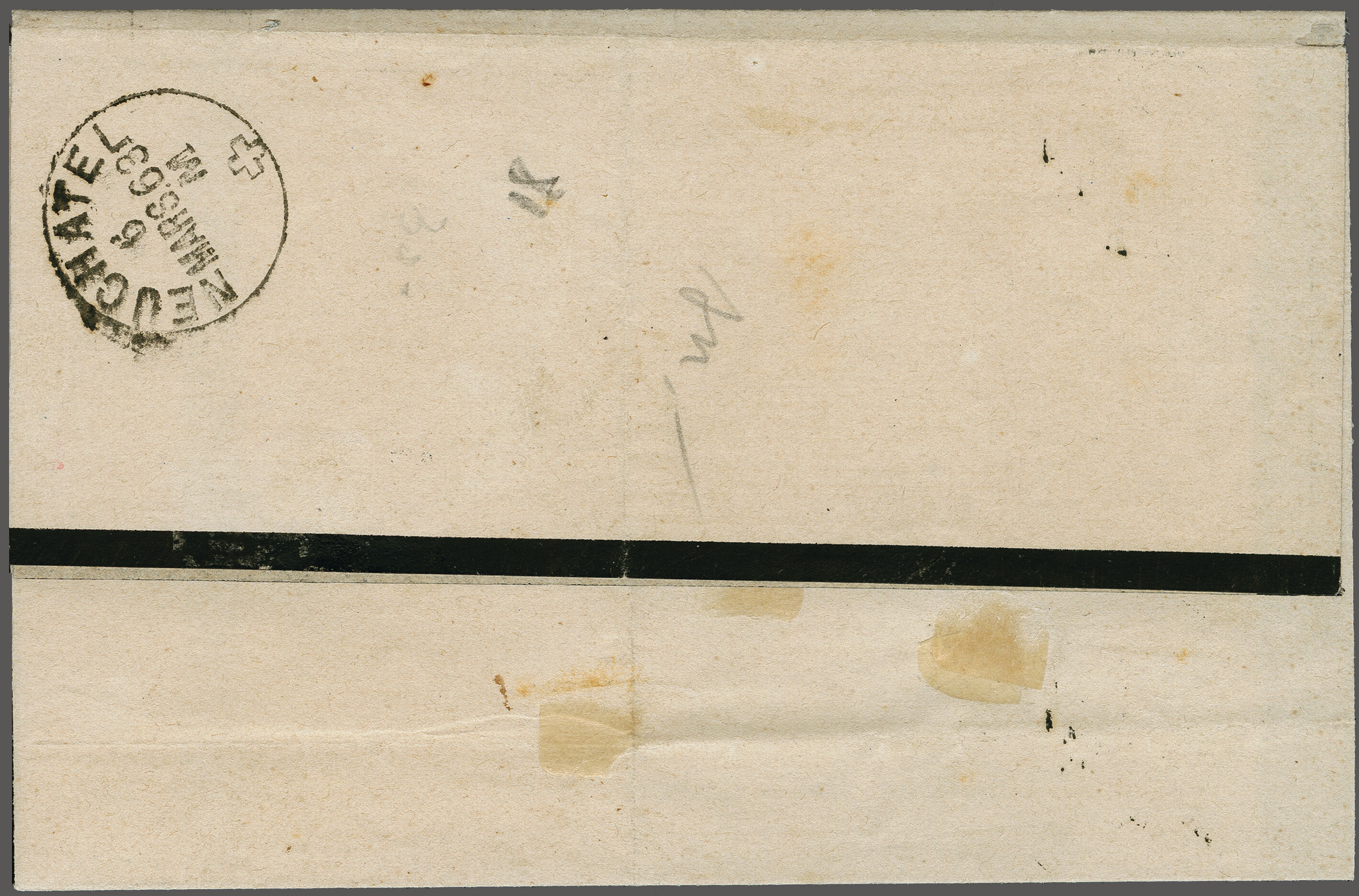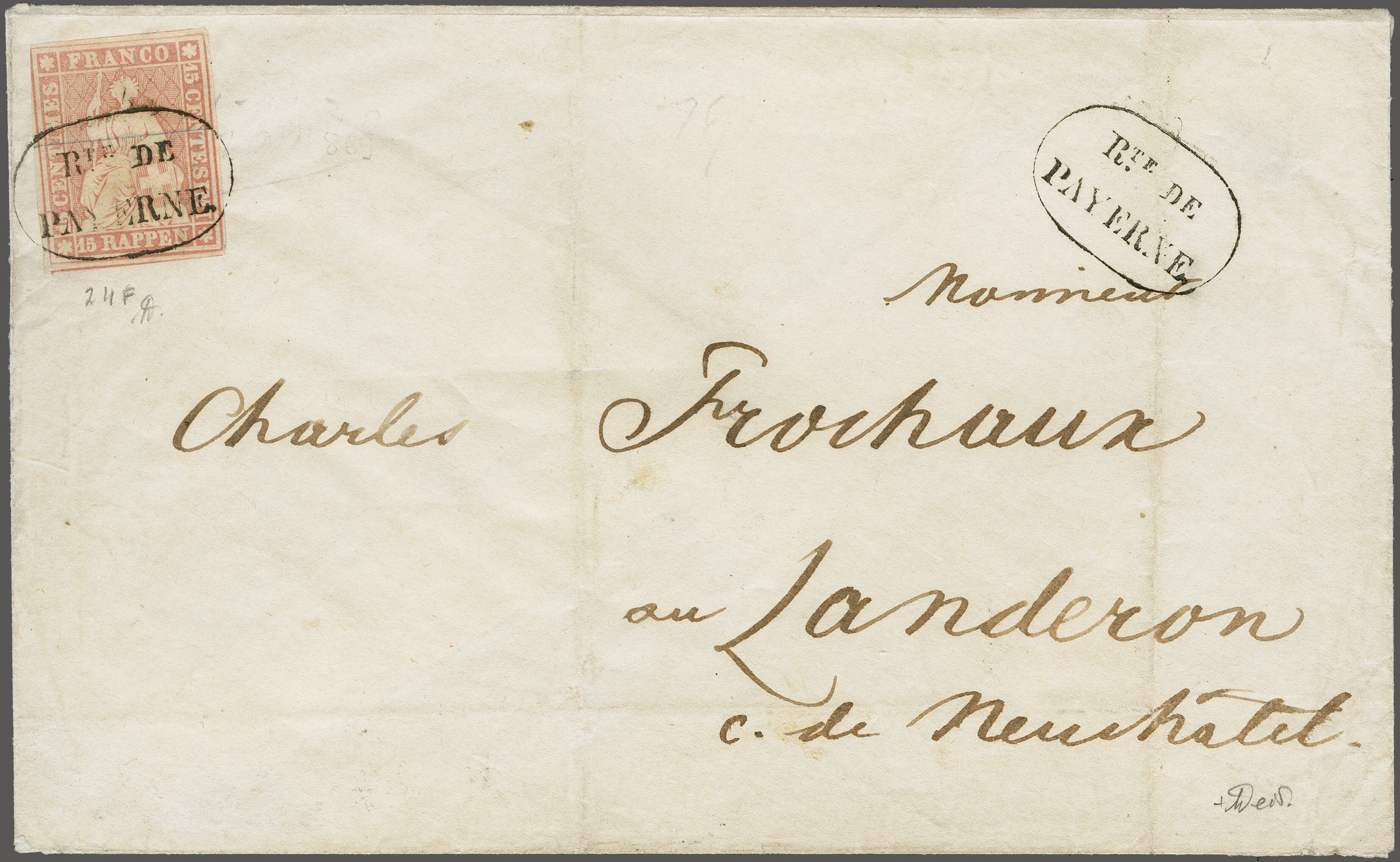 Umschlag im 3. Briefkreis nach Le Landeron (NE). Rücks. Transitstp. "FRIBOURG" und "BERN" sowie gr. Zierkreisstp. "LANDERON 17 AOUT 1857". Attest von der Weid (1996). Provenienz: Sammlung "Rüschlikon", 212. Corinphila-Auktion, November 2016, Los