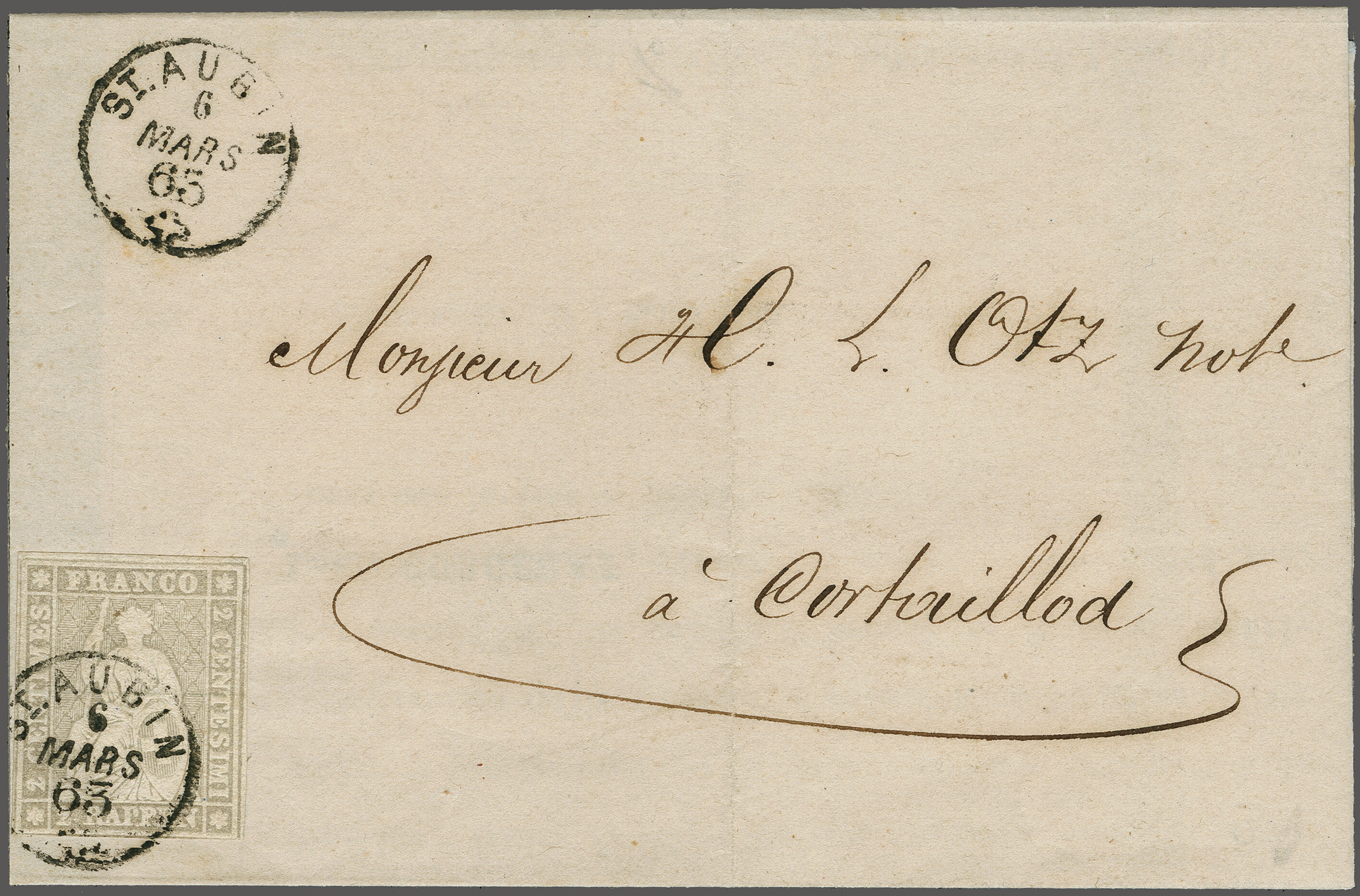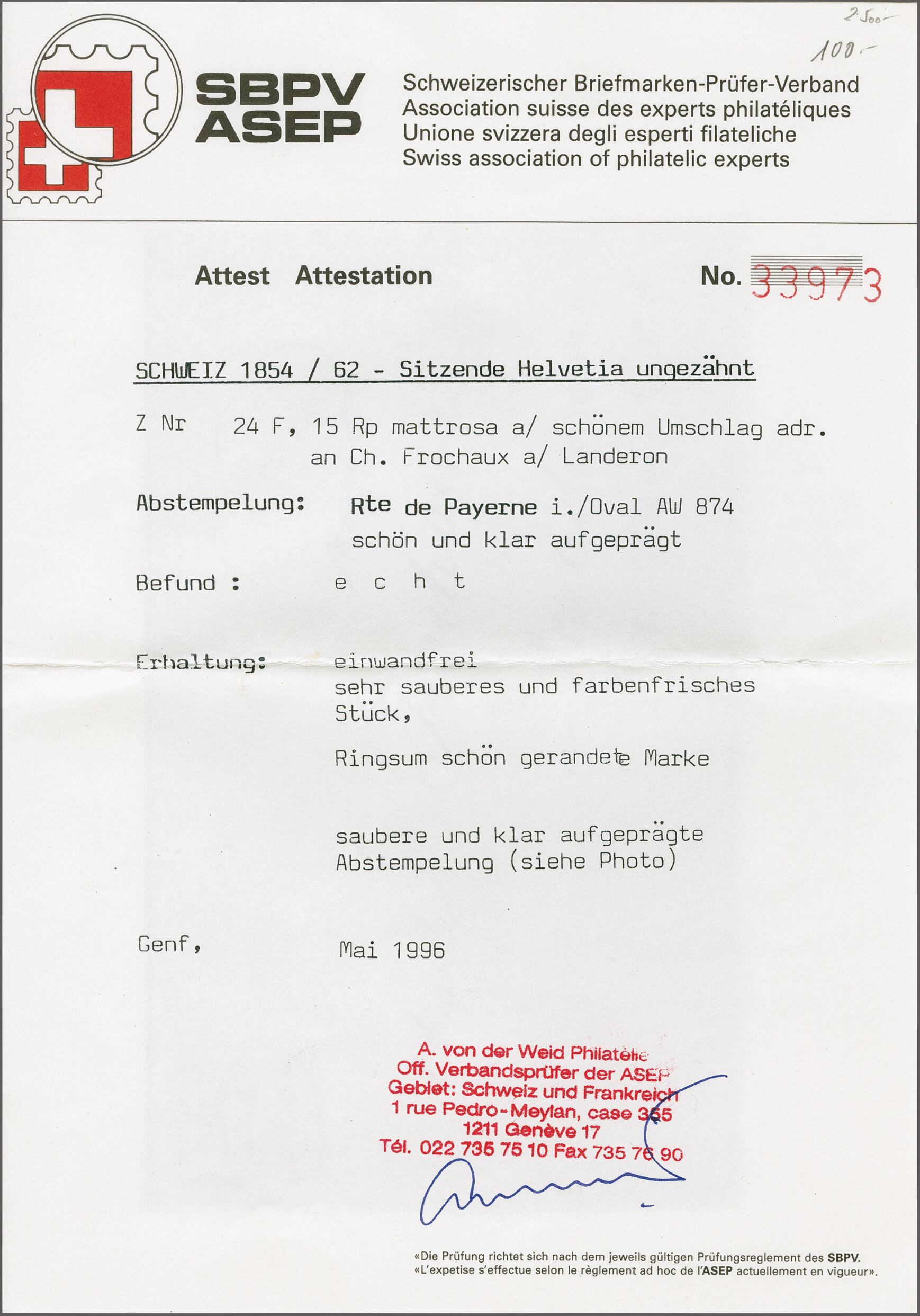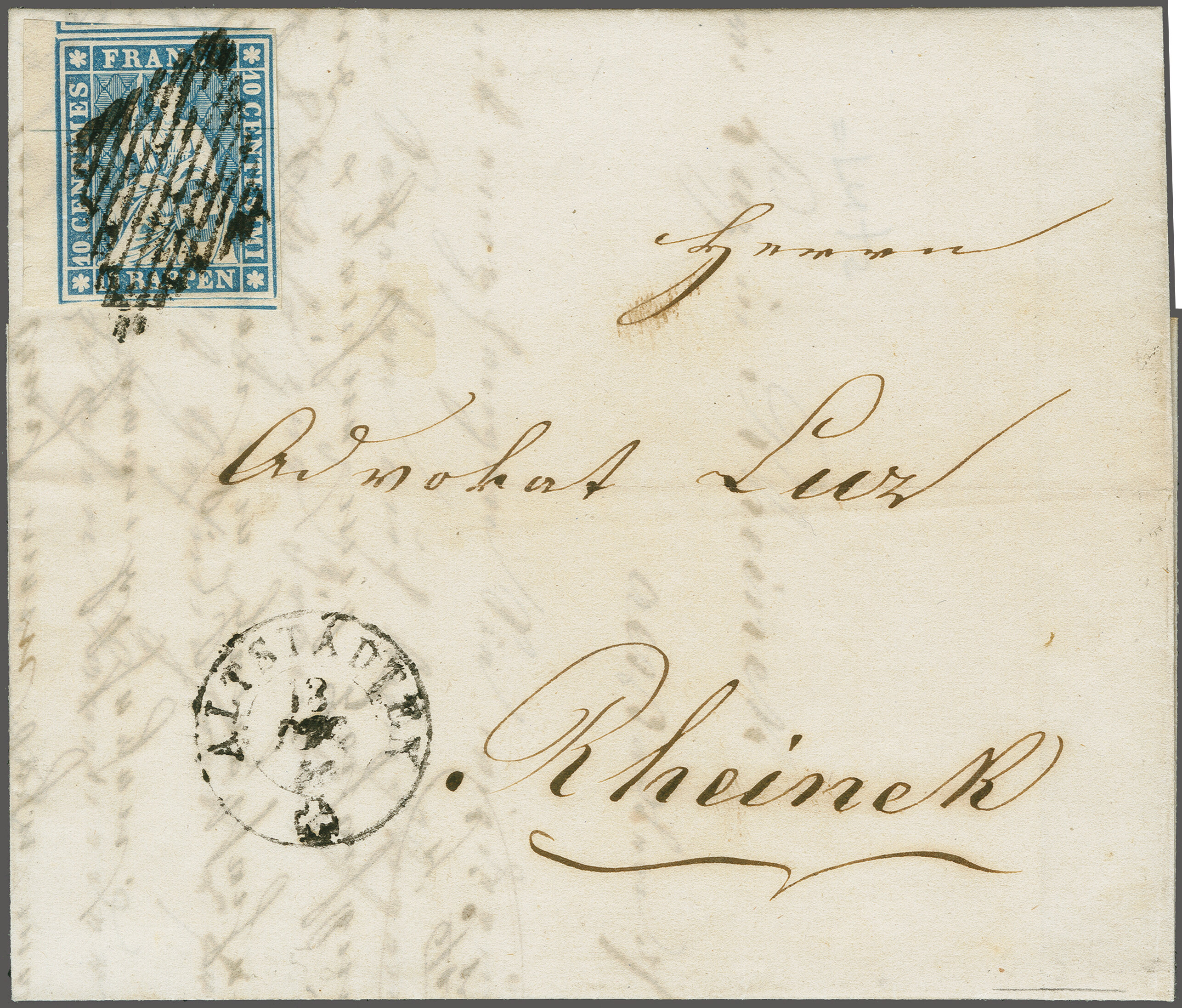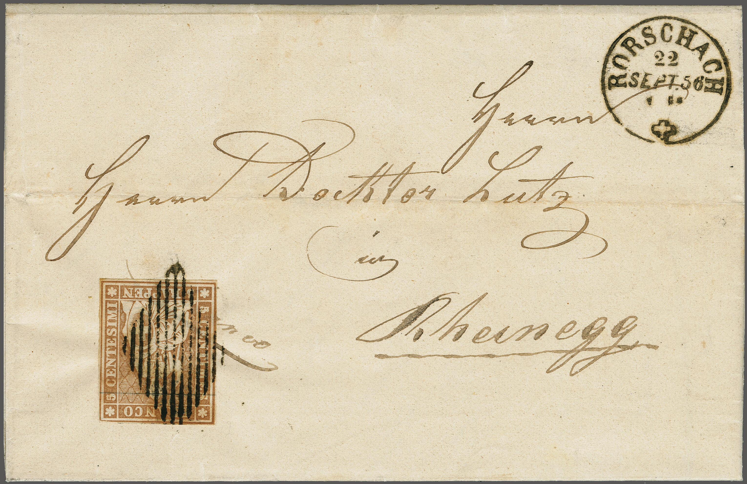 Umschlag im 3. Briefkreis nach Le Landeron (NE). Rücks. Transitstp. "FRIBOURG" und "BERN" sowie gr. Zierkreisstp. "LANDERON 17 AOUT 1857". Attest von der Weid (1996). Provenienz: Sammlung "Rüschlikon", 212. Corinphila-Auktion, November 2016, Los