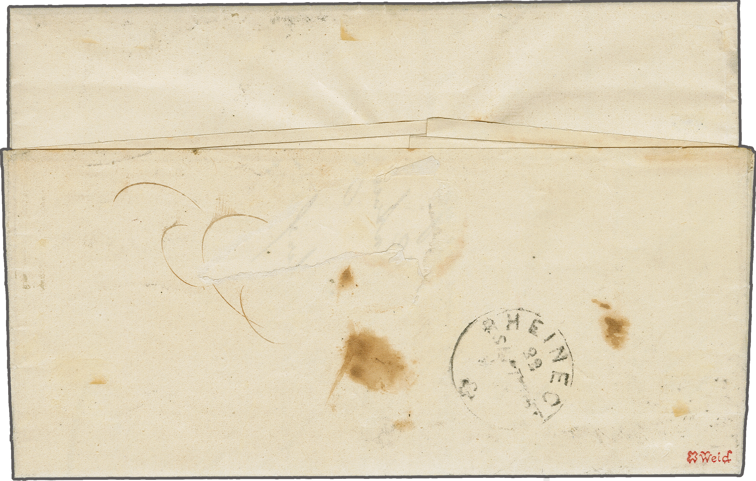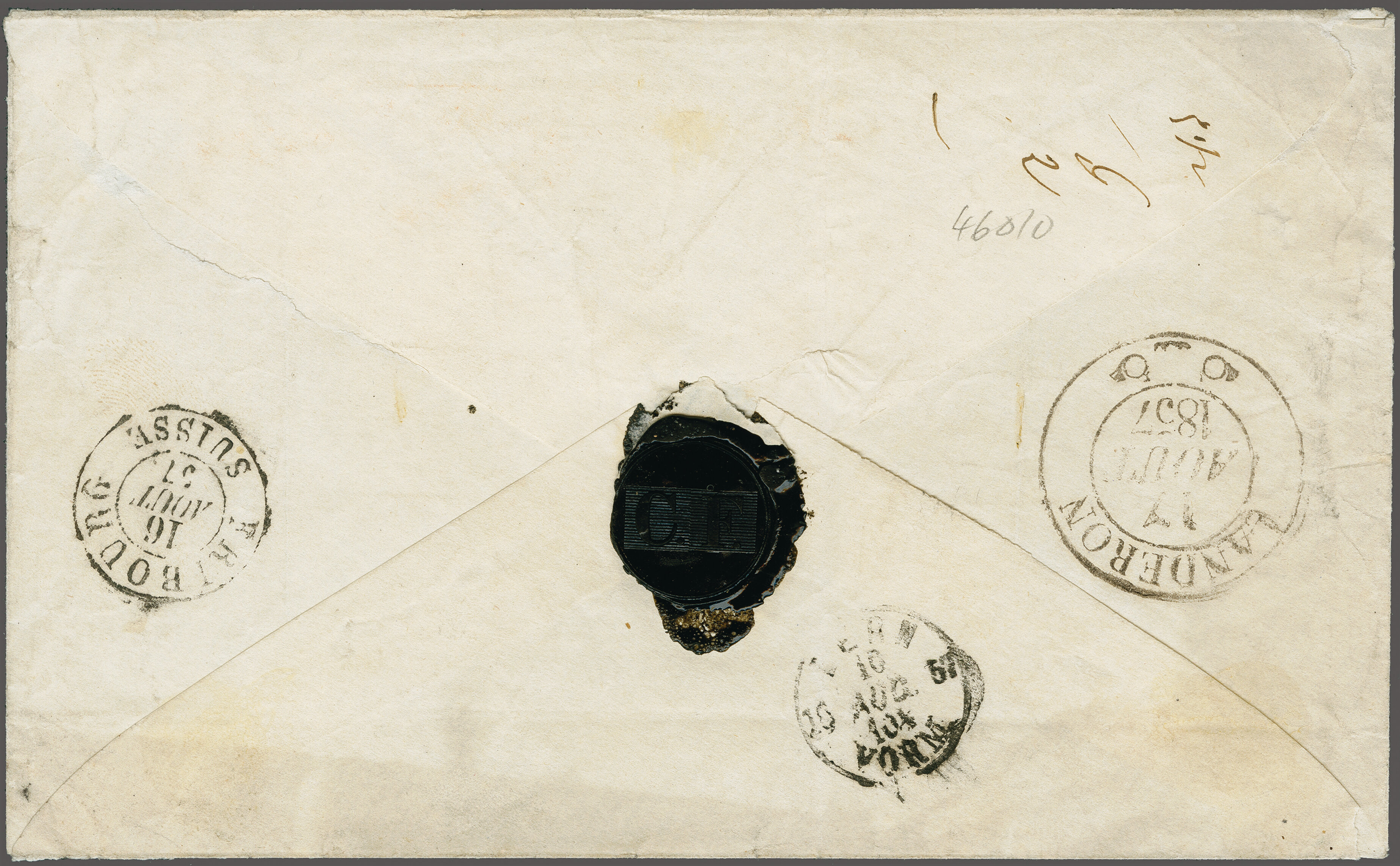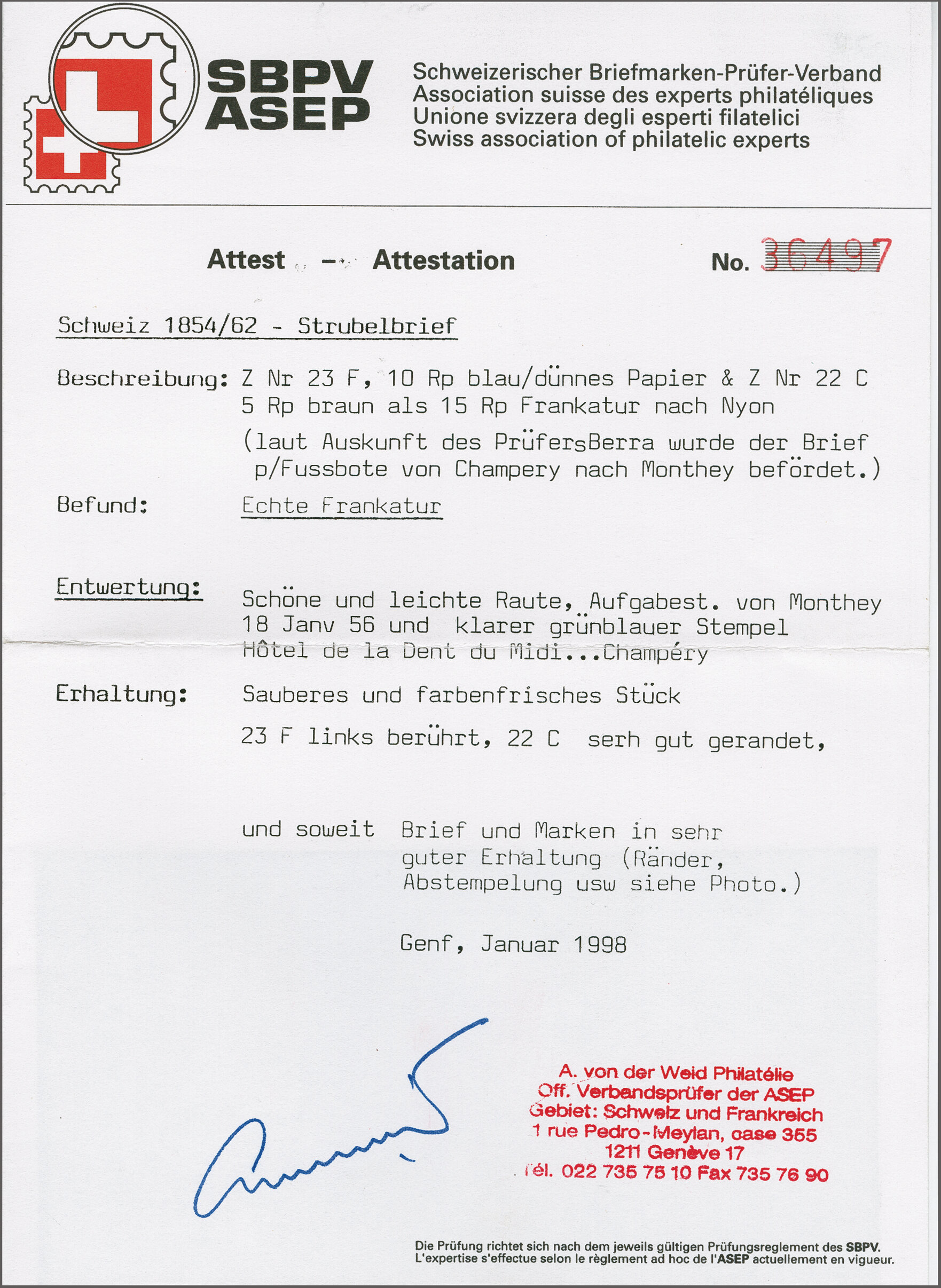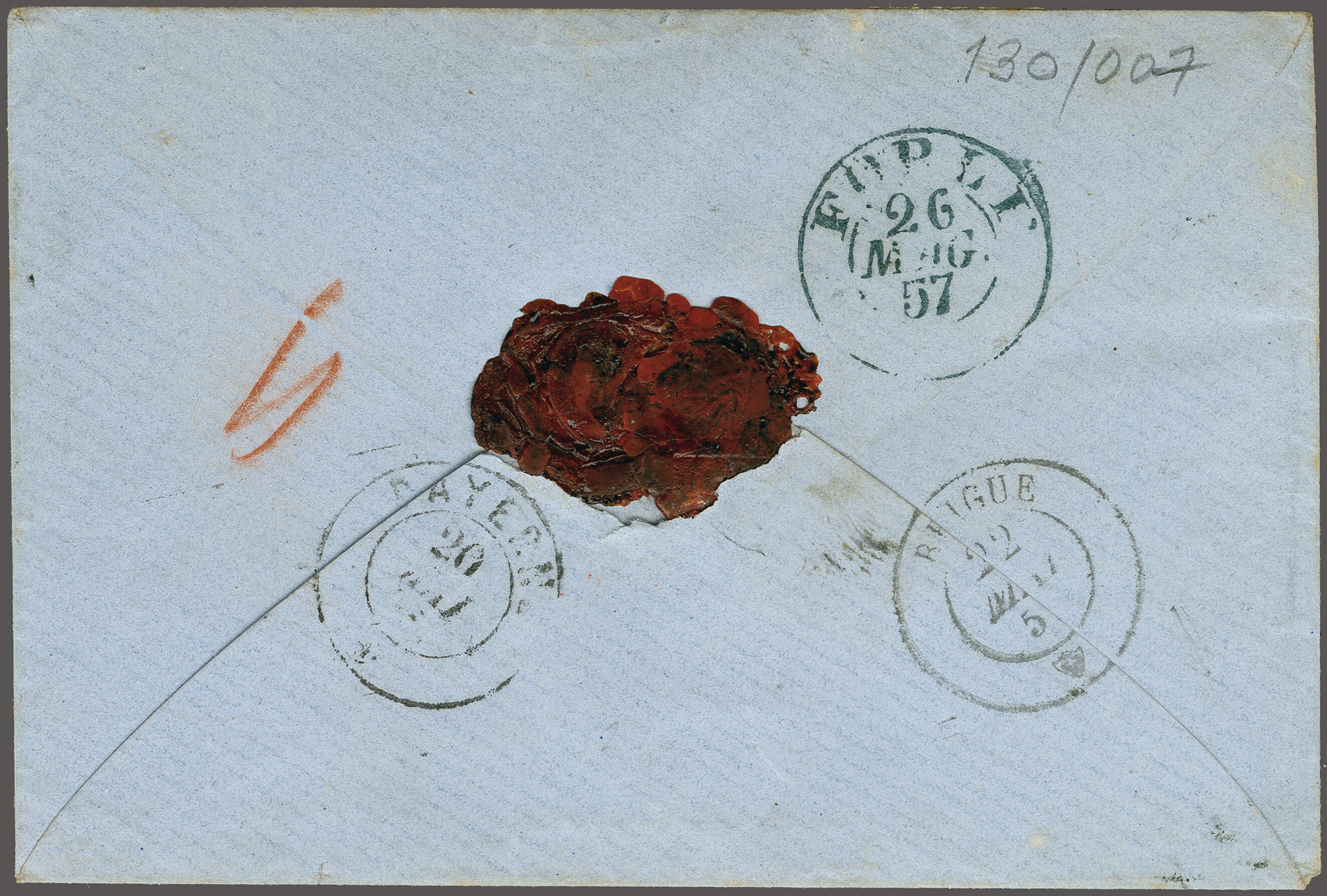 Umschlag im 3. Briefkreis nach Le Landeron (NE). Rücks. Transitstp. "FRIBOURG" und "BERN" sowie gr. Zierkreisstp. "LANDERON 17 AOUT 1857". Attest von der Weid (1996). Provenienz: Sammlung "Rüschlikon", 212. Corinphila-Auktion, November 2016, Los