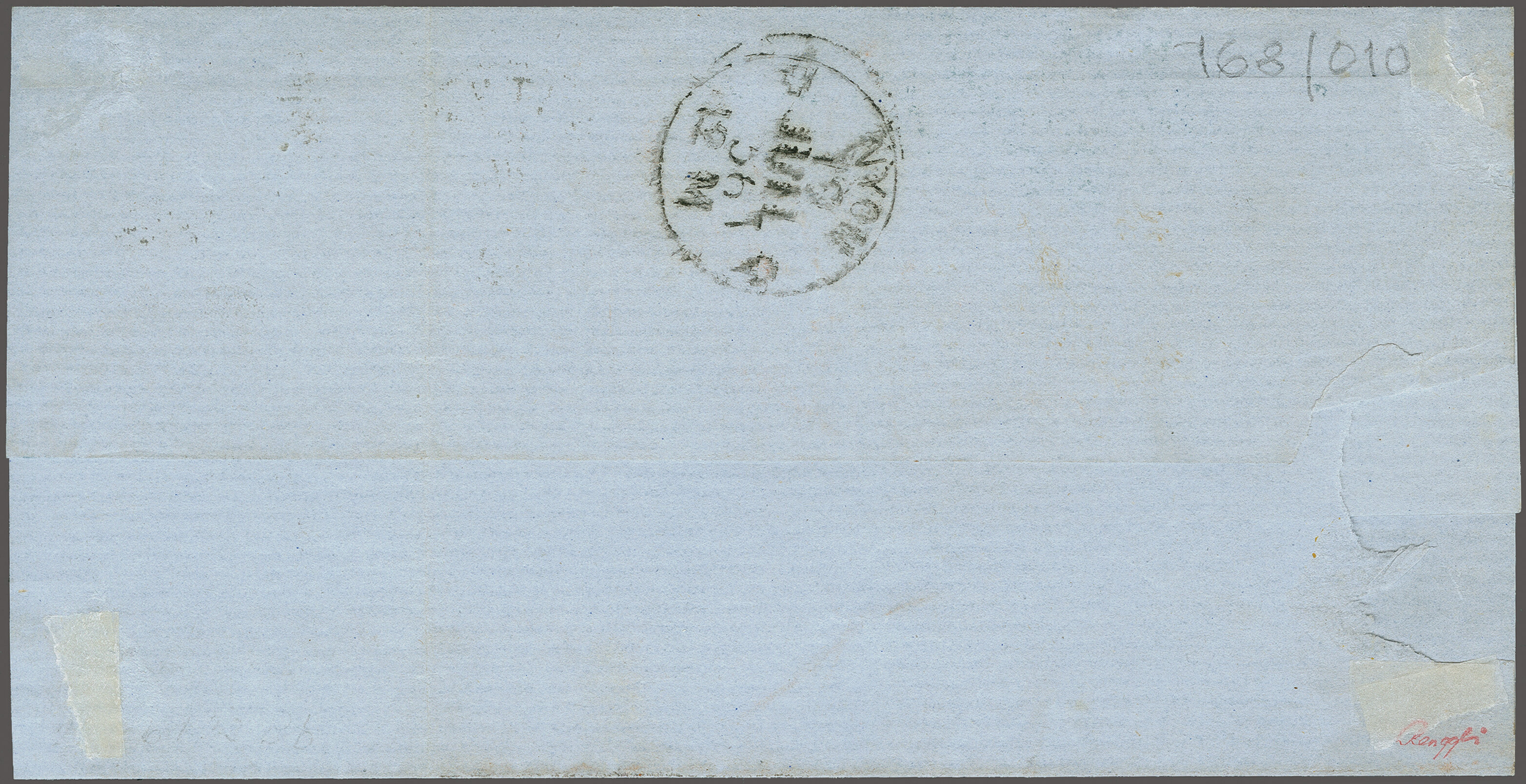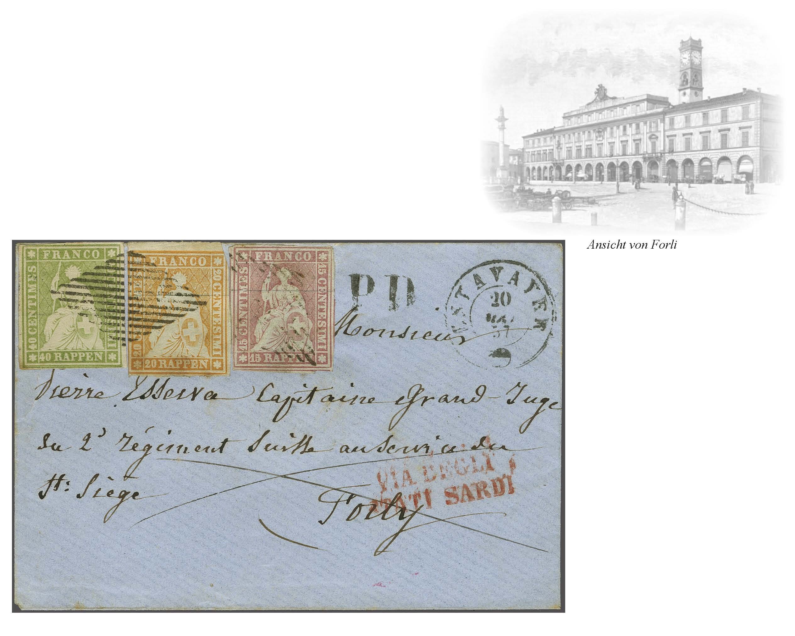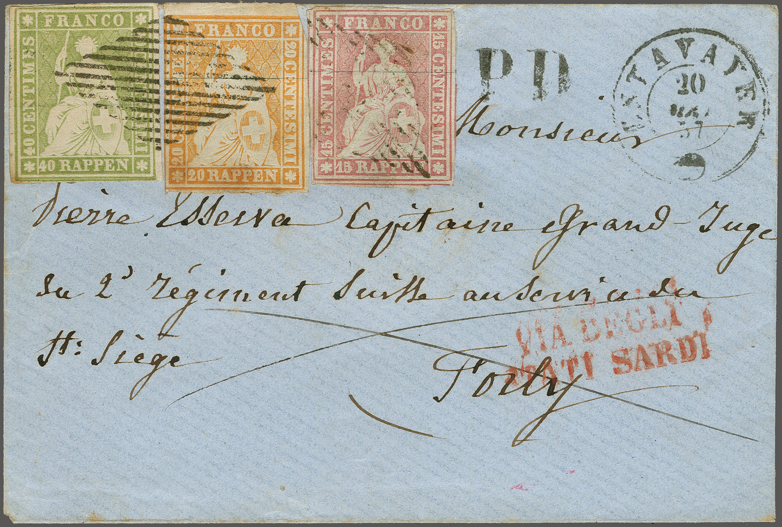 "VIA DEGLI / STATI SARDI" in rot; rücks. Transitstp. "PAYERNE" und "BRIGUE" sowie Ankunftsstp. vom 26. Mai. Obwohl mit 75 Rappen für den teureren Transit über Frankreich gemäss Postvertrag vom Januar 1857 korrekt und bis zum Bestimmungsort