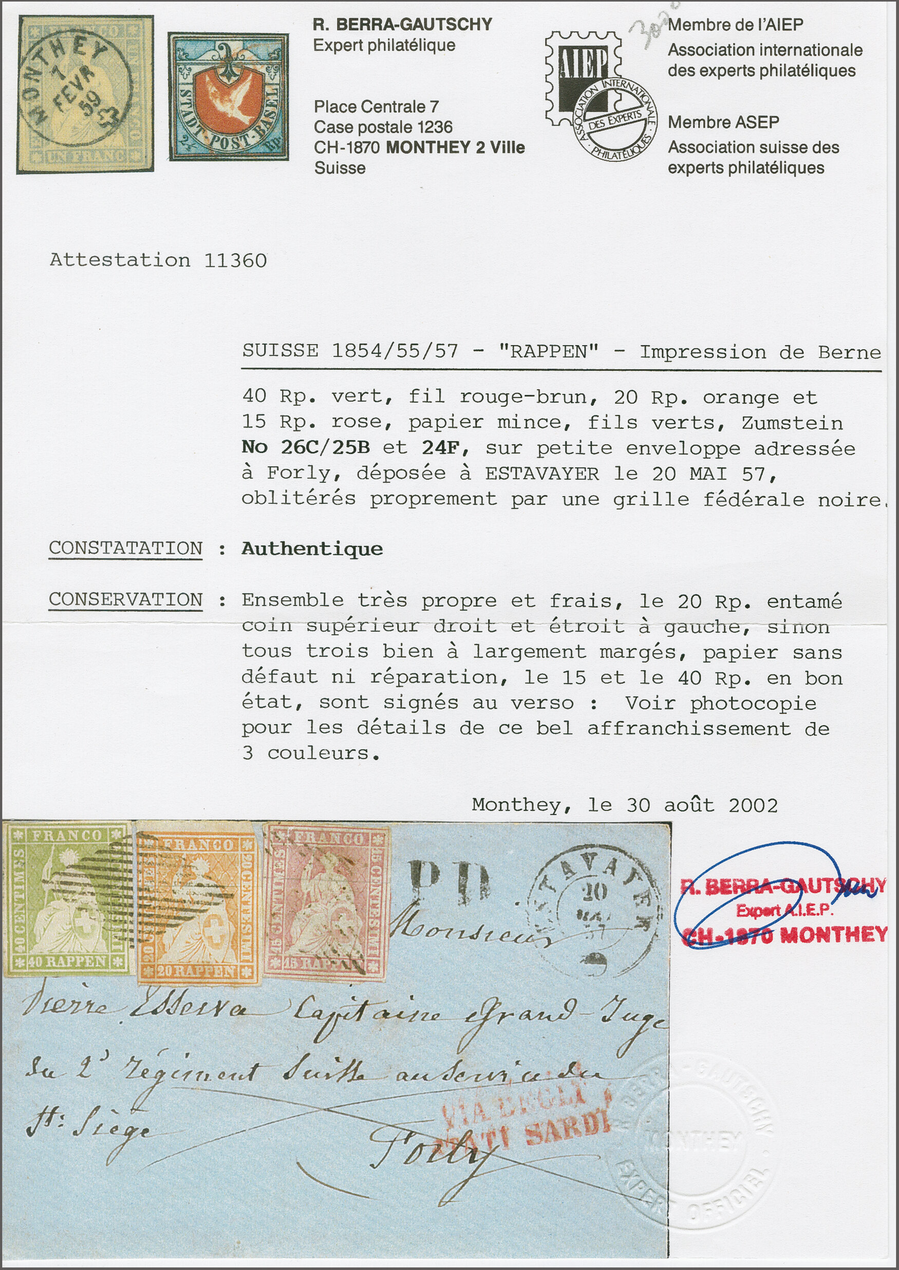 eigentlich nur 55 Rappen zu entrichten gewesen wären. Eine attraktive und postgeschichtlich interessante Dreifarbenfrankatur an einen Schweizer Offizier in fremden Diensten; Attest Berra (2002). (Image 1)