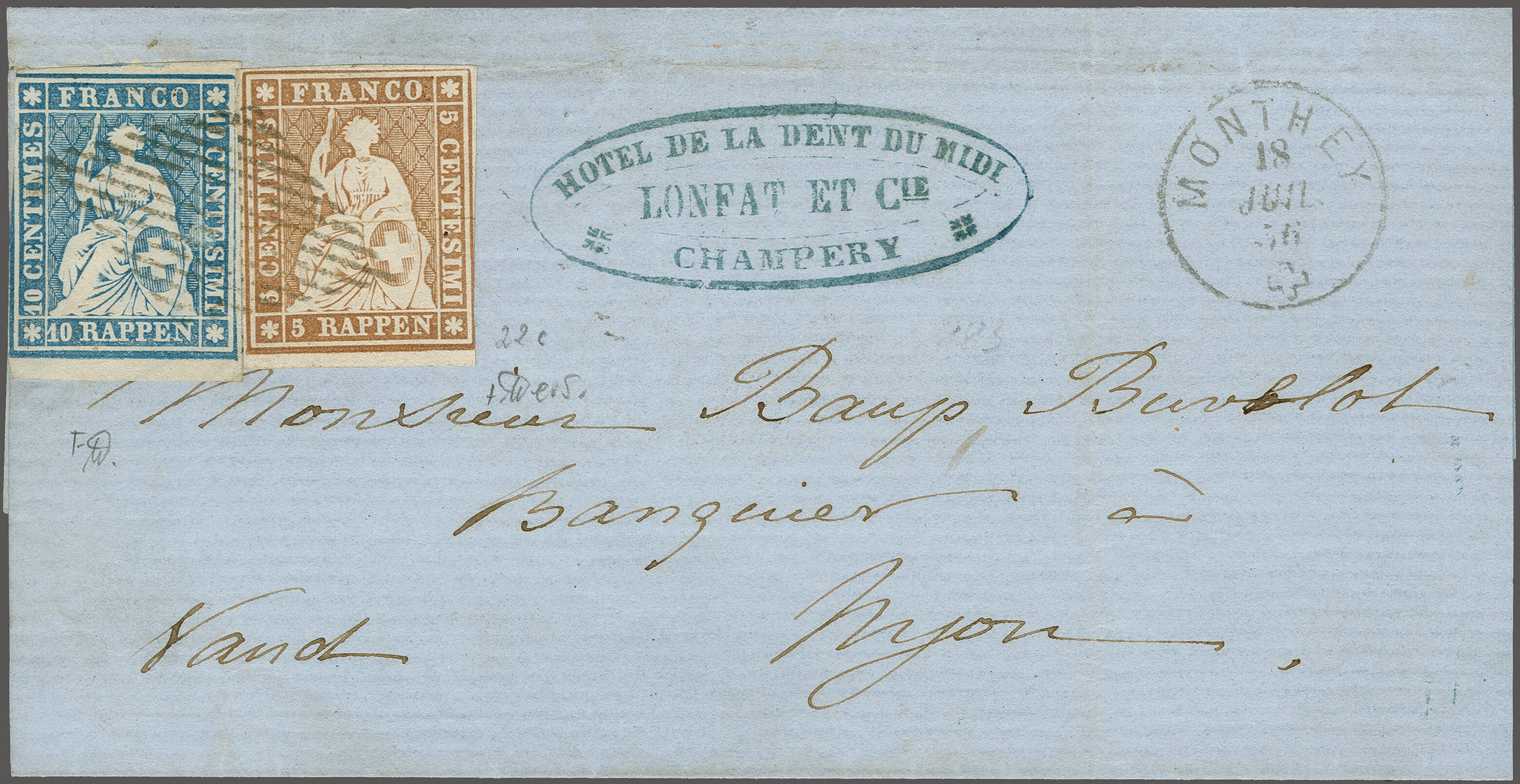 nebenges. Fingerhutstp. "MONTHEY 18 JUIL 56" sowie privatem Ovalstempel "HOTEL DE LA DENT DU MIDI / LONFAT ET CIE. / CHAMPÉRY" in blau auf Faltbriefhülle im 3. Briefkreis nach Nyon mit rücks. Ankunftsstp. vom Folgetag. Ein historisch interessanter