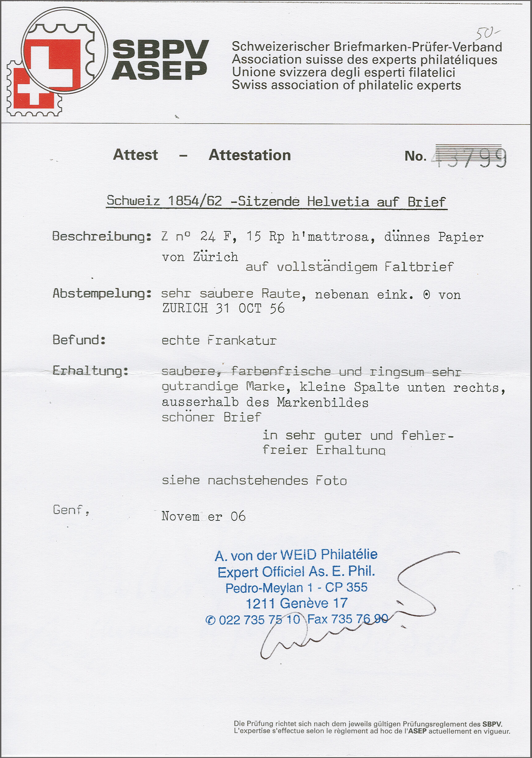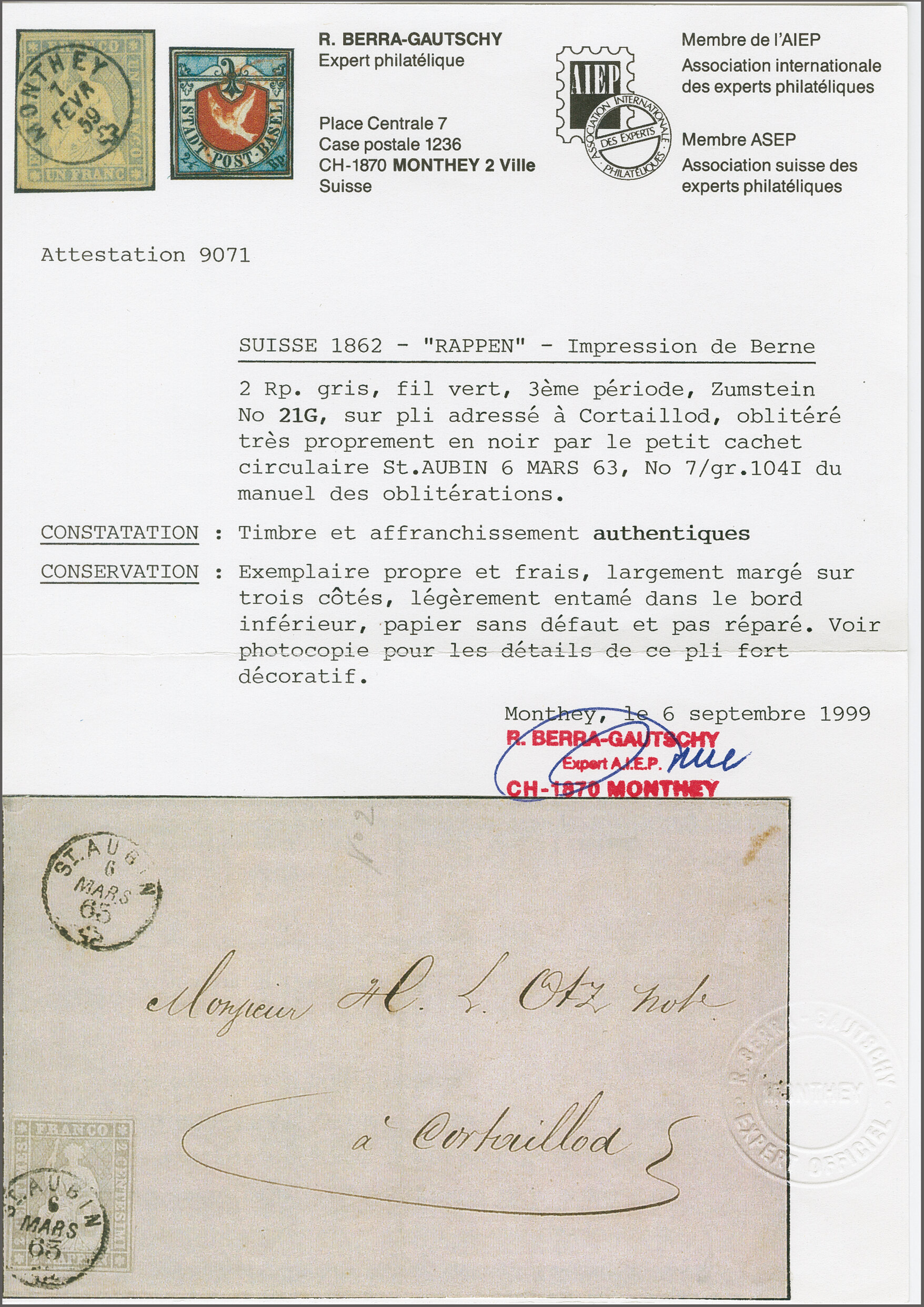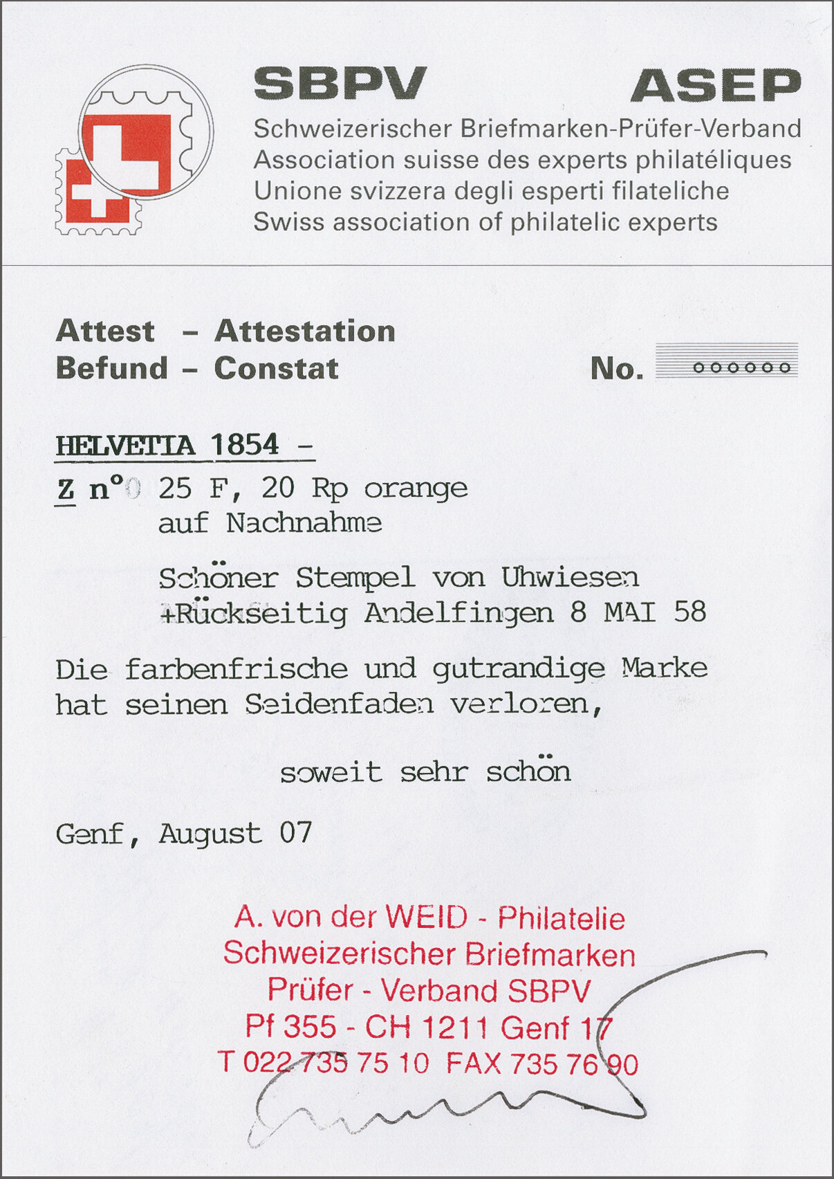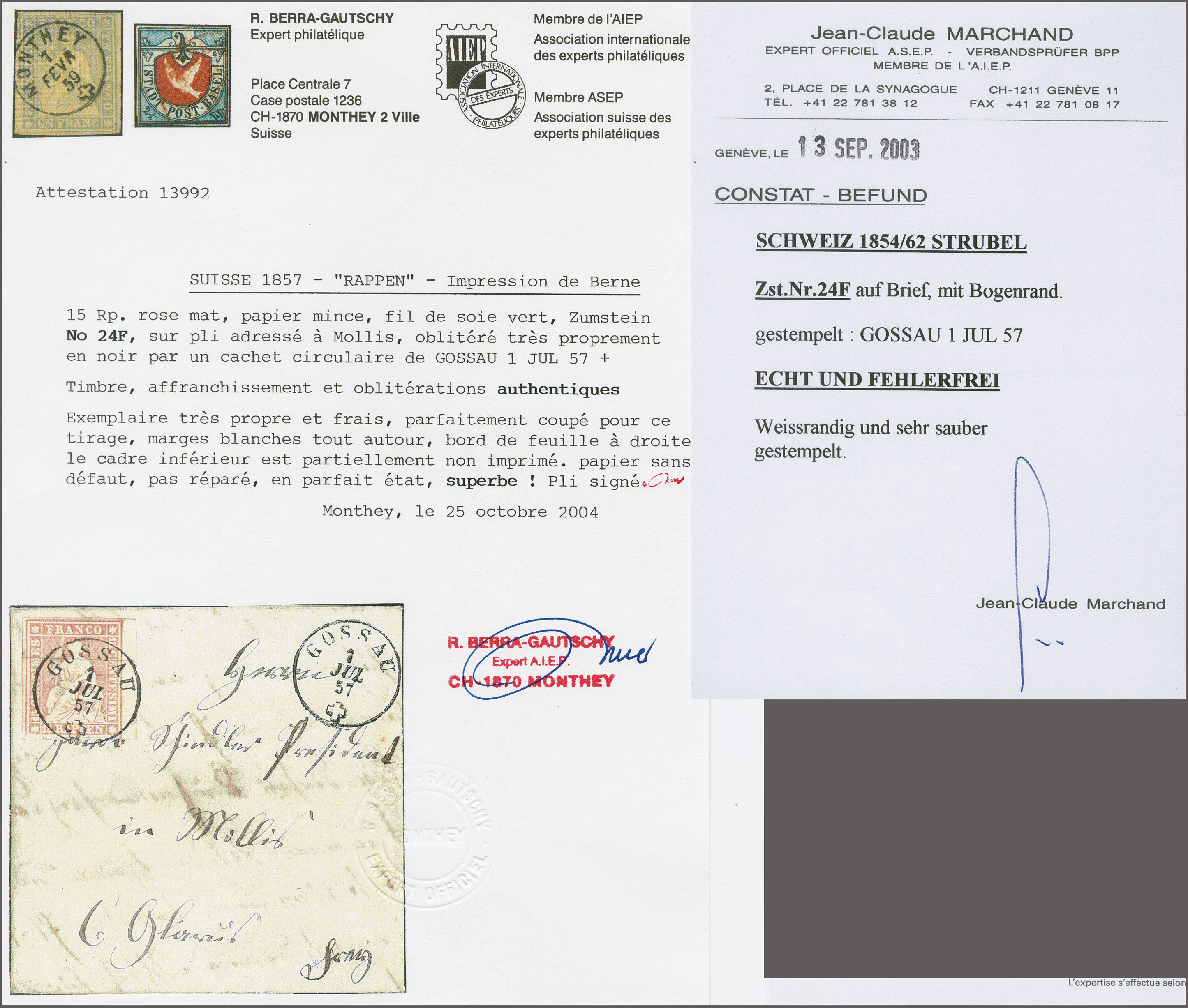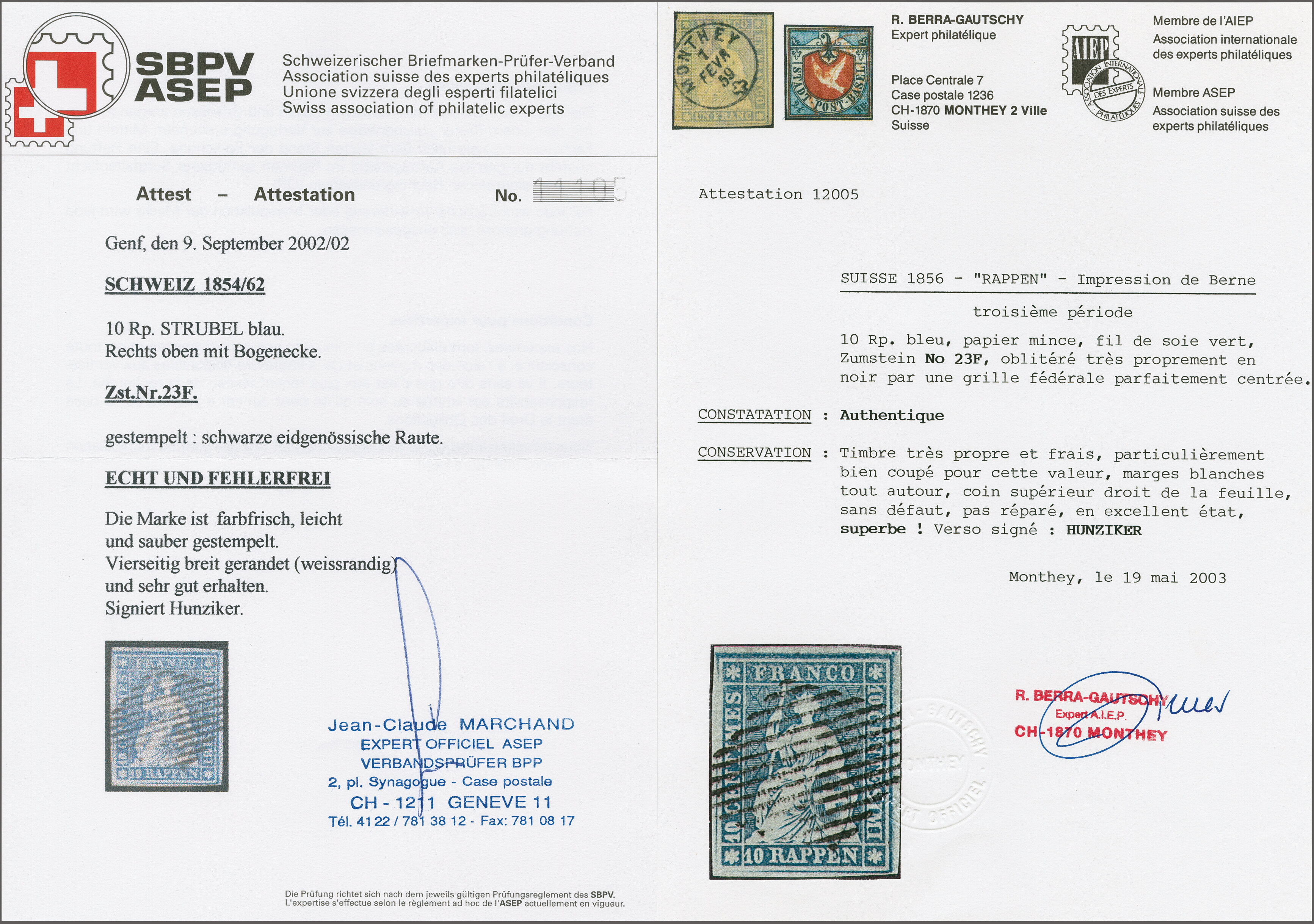 entw. mit schwarzer eidg. Raute. Signiert Hunziker, Atteste Marchand (2002) und Hunziker (2003). SBK=CHF 1'300. (Image 1)