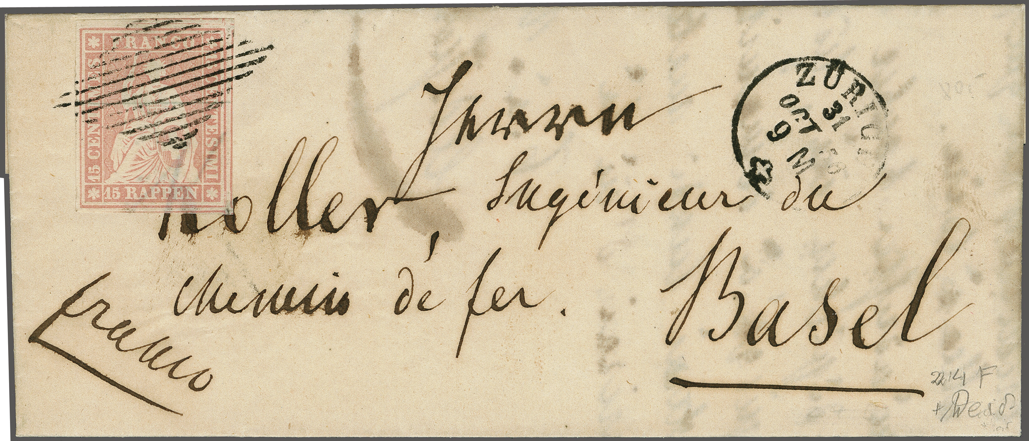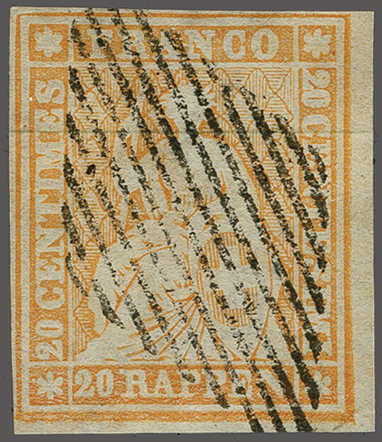 20 Rp. gelblichorange auf dünnem Münchner Papier, farbfr. und allseits weissrandig mit Bogenrand unten und links, klar entw. mit diagonal aufgesetzter 14-liniger Raute von Basel (AW 73). Eine attraktive Marke mit dieser