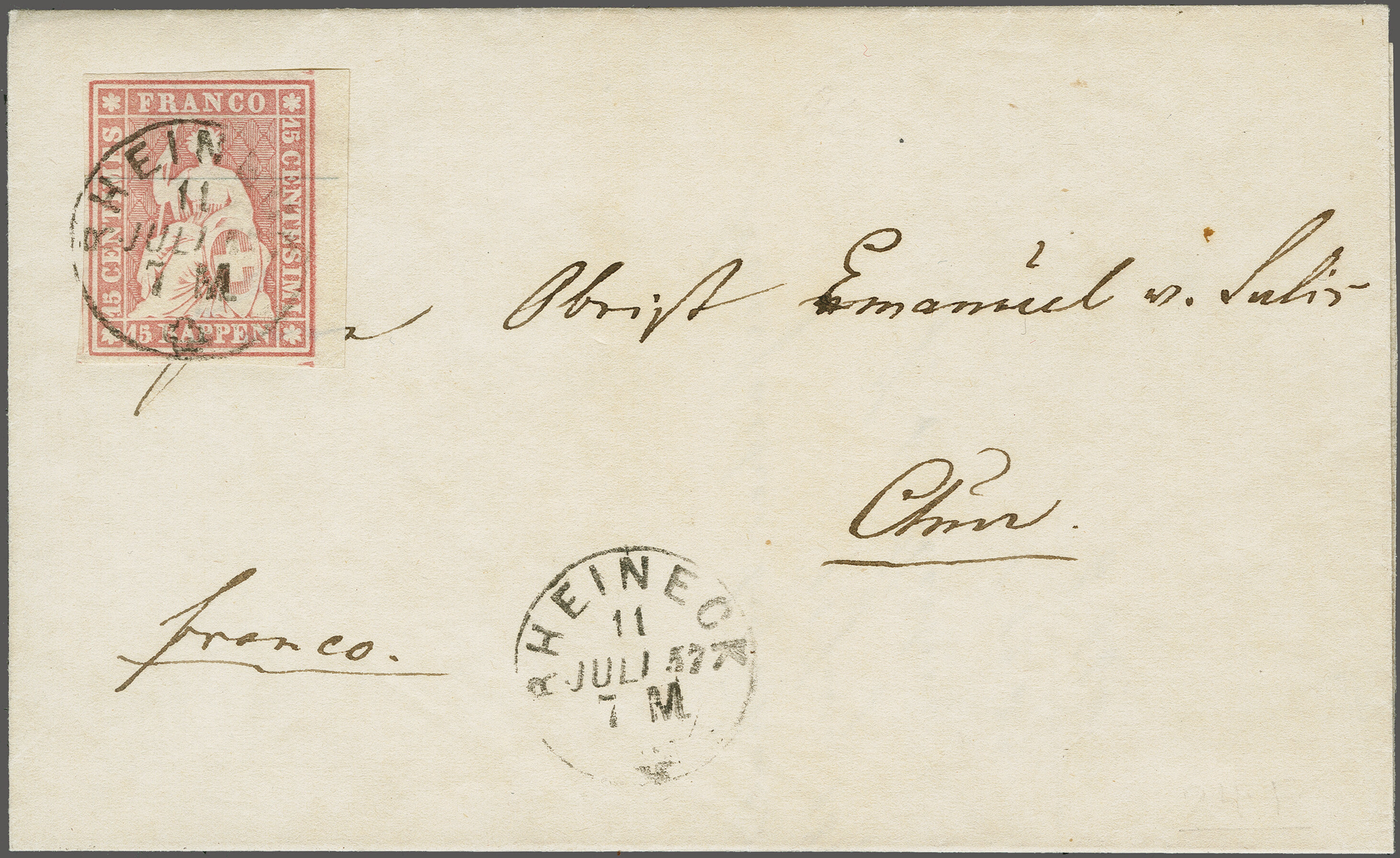 Einkreisstp. "RHEINECK 11 JULI 57 7M" (AW 5080) in schwarz, nebenges. nochmals wiederholt, auf Faltbriefhülle im 3. Briefkreis adressiert an "Obrist Emanuel v. Salis" in Chur (Marke zur Kontrolle gelöst und zurückgefalzt). Rücks. Ankunftsstp. selben