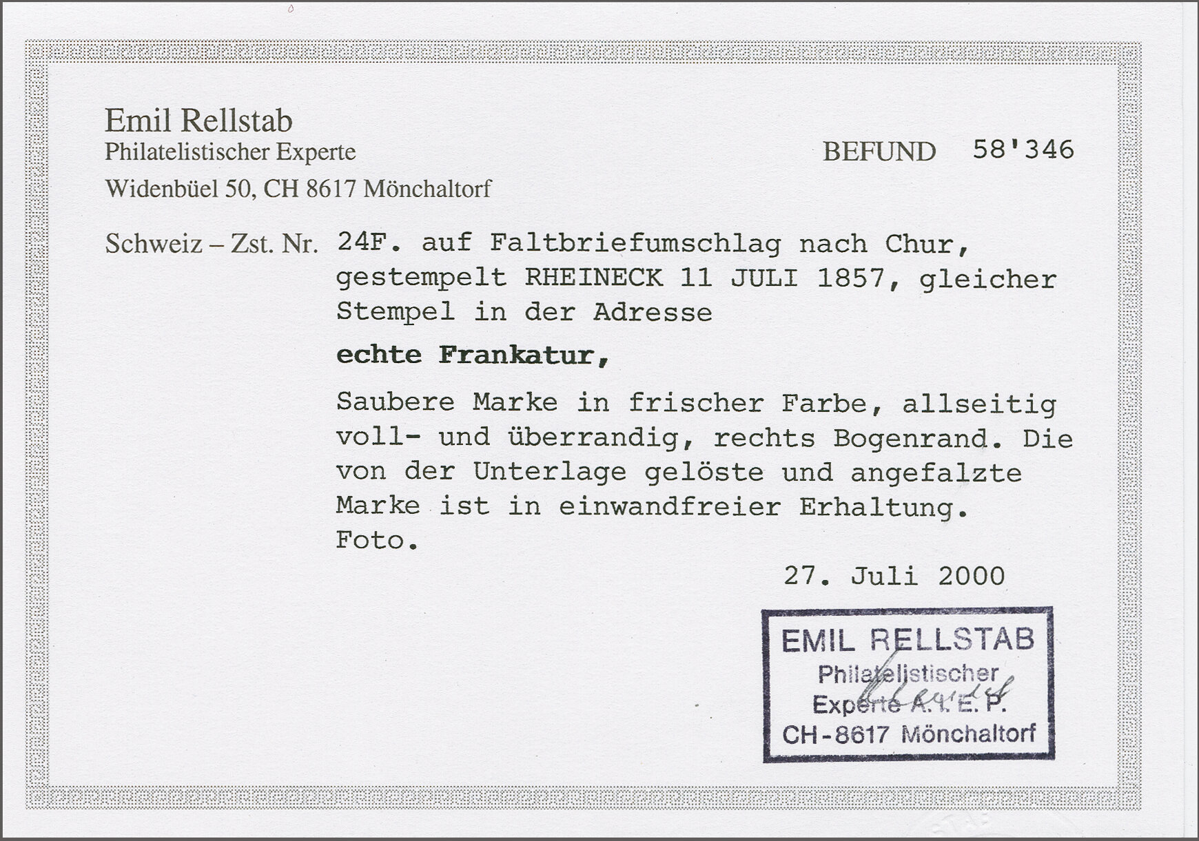 Datums. Befund Rellstab (2000). SBK=CHF 850. Provenienz: Sammlung "Bellerive", 122. Corinphila-Auktion, Zürich 21.-22. Oktober 2000, Los 1012. (Image