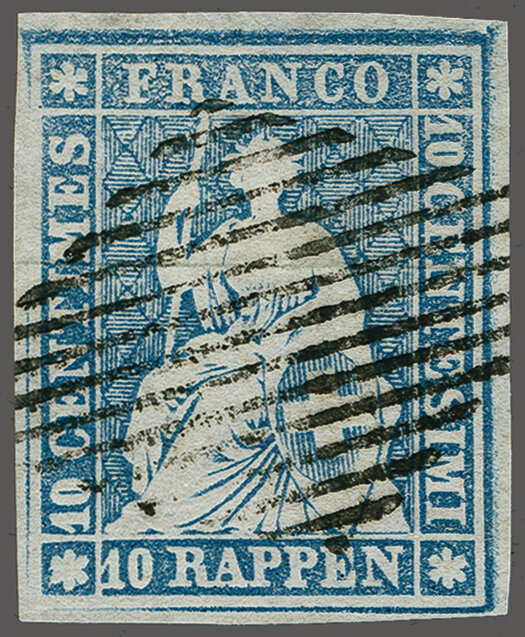 10 Rp. grauultramarin, farbfrisches und allseits weissrandiges Luxusstück mit breitem Bogenrand links und Teilen der oberen und unteren Nebenmarken, fein ausgeprägtes Relief, klar und übergehend entw. mit schwarzer eidg. Raute