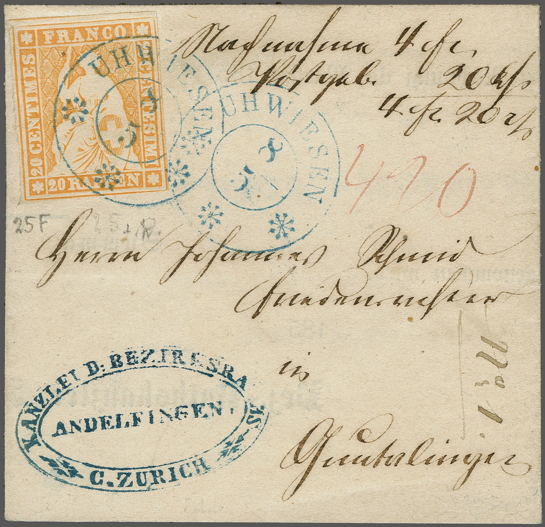 20 Rp. gelblichorange auf dünnem Münchner Papier, farbintensiv und voll- bis weissrandig, klar und übergehend entw. mit Bruchstempel "UHWIESEN 8 / 5" (AW 5855) in blau auf frischer und vollständiger "Kosten-Nota" mit blauem