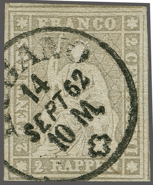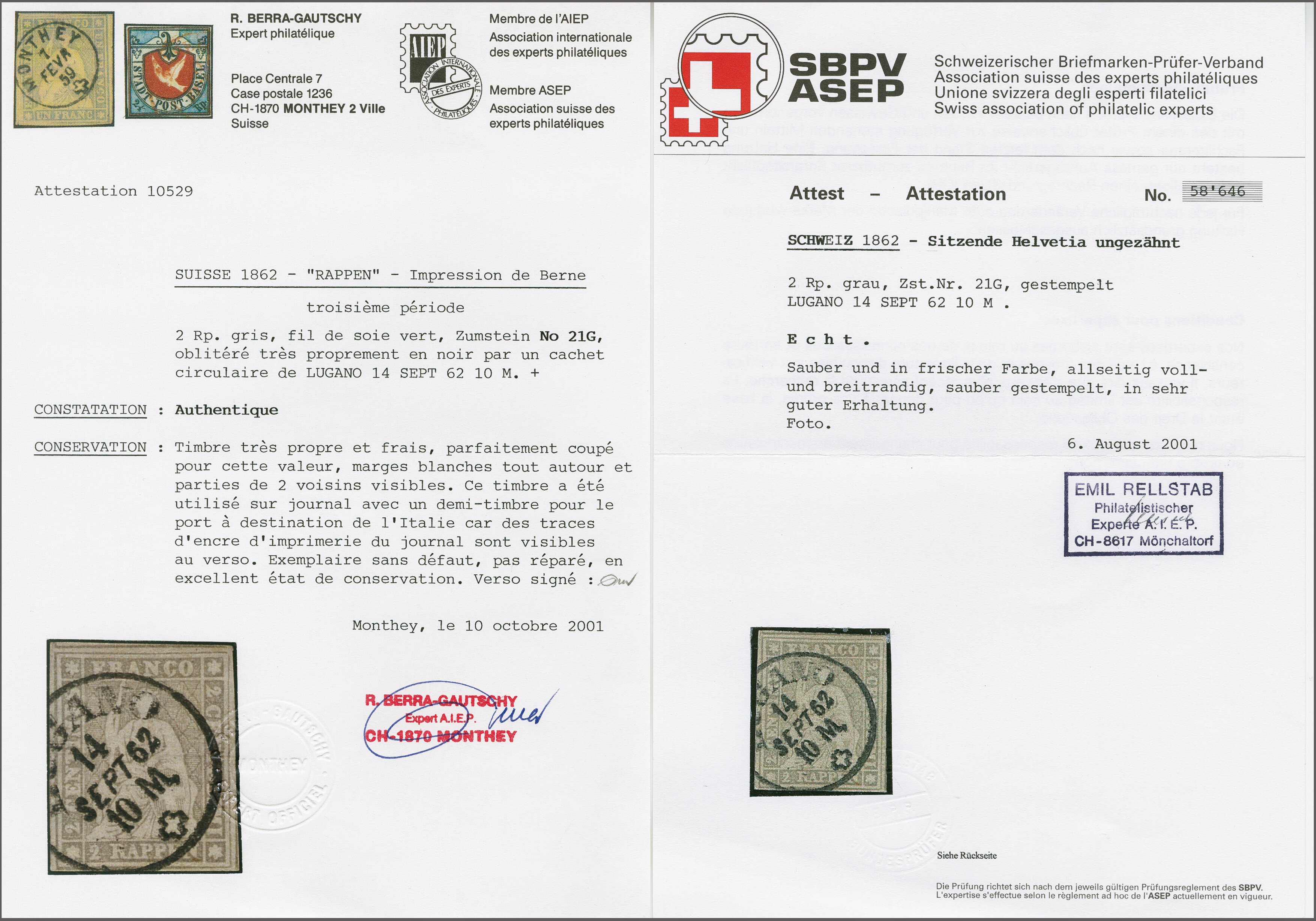 2 Rp. grau, farbfr. und allseits weissrandig mit Teilen zweier Nebenmarken, klar entw. mit Elzevir-Einkreisstp. "LUGANO 14 SEPT. 62 10M". Atteste Rellstab und Berra (2001). SBK=CHF 680. (Image 1)