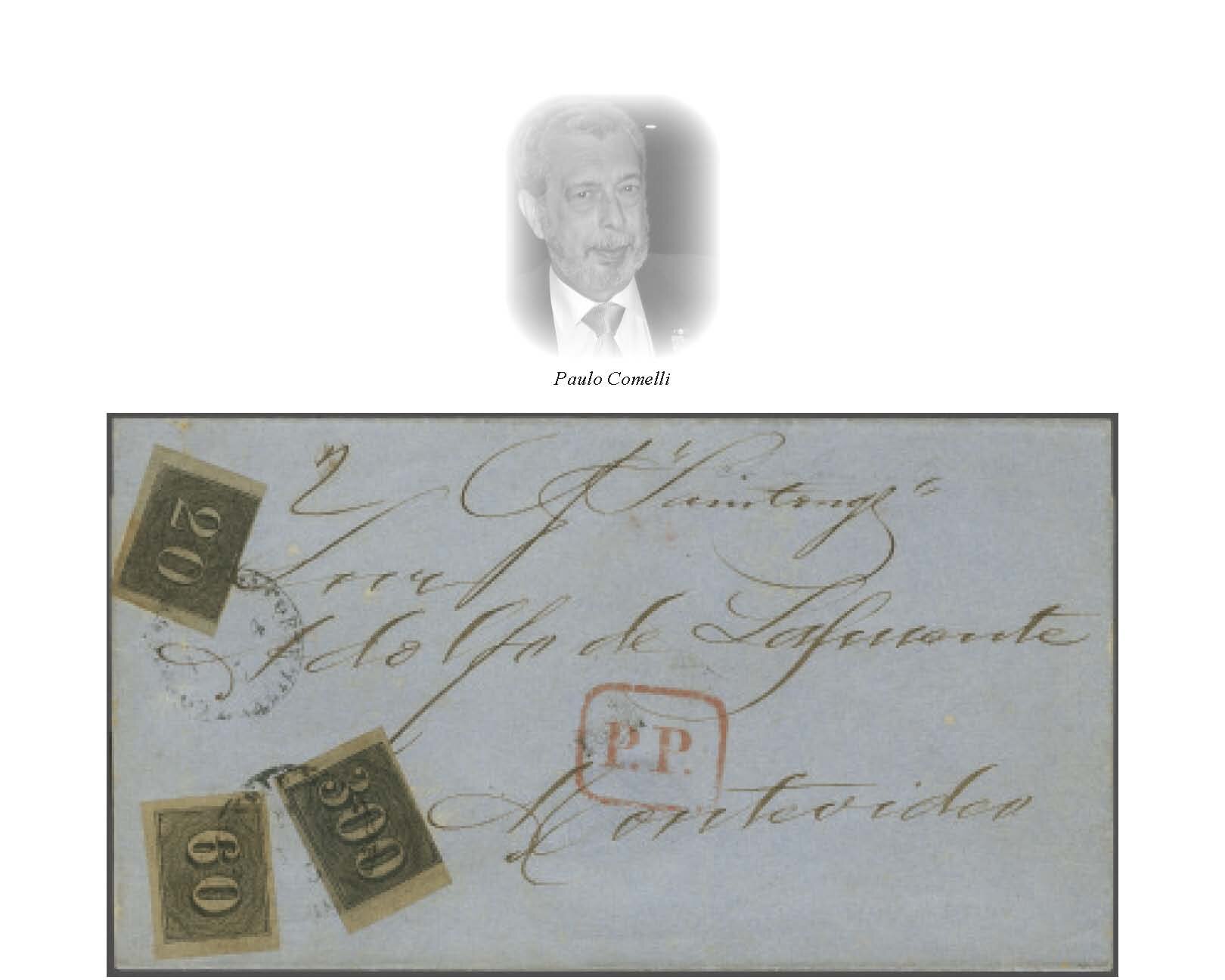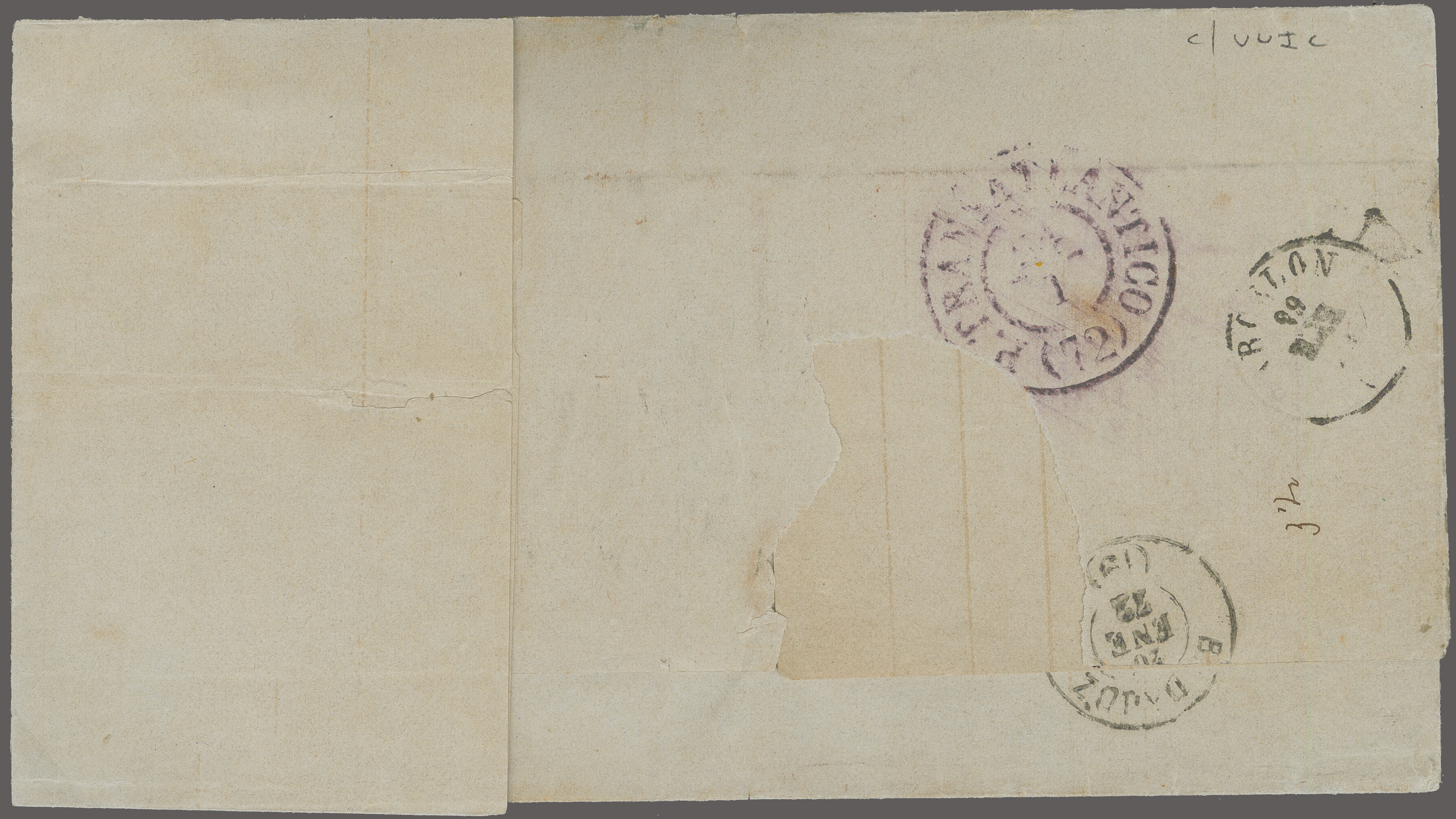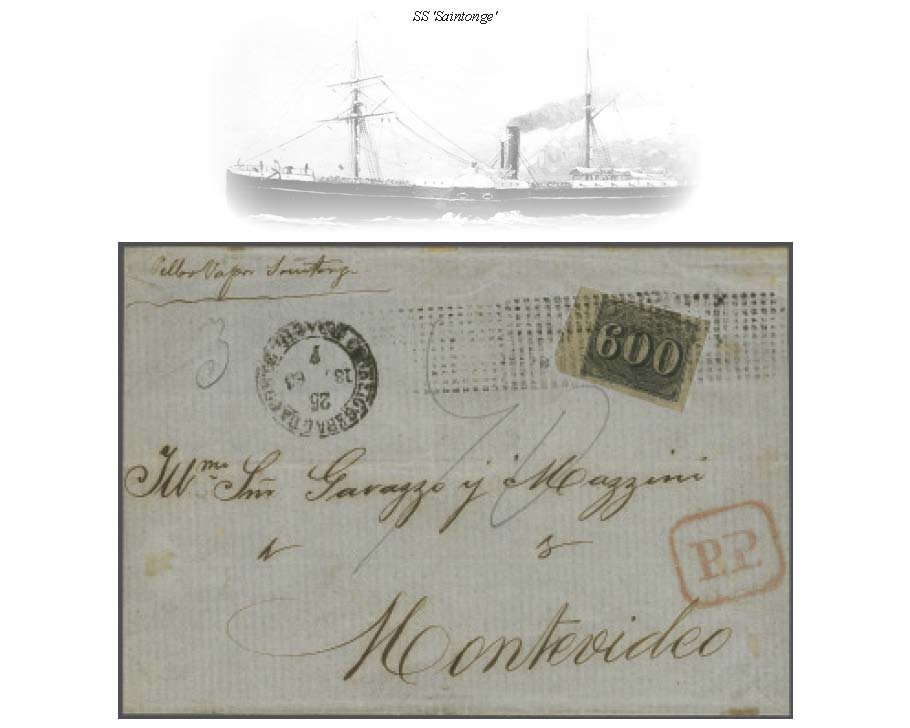 10092 cover imageVerticais 1850: 600 r. black on greyish thin paper, a used example, marginal from left of sheet with large margins all round; on 1863 cover from Rio de Janeiro to Montevideo, Uruguay at triple rate (overpaid 30 reis), carried by French steamer and endorsed "Pelo Vapor Saintonge", tied by dotted roller obliterator of Rio de Janeiro with "Correio Geral da Corte" cds alongside (July 25) and framed "P.P." below in red. Small piece of cover missing from the reverse, but an exceptional single usage of this stamp on letter with just two examples recorded, the other, ex Koester, June 1985, lot 2170 is altogether less attractive with the addressee's name inked out. Rare Scott = $ 1'500+. (Image 1) (Image 2)