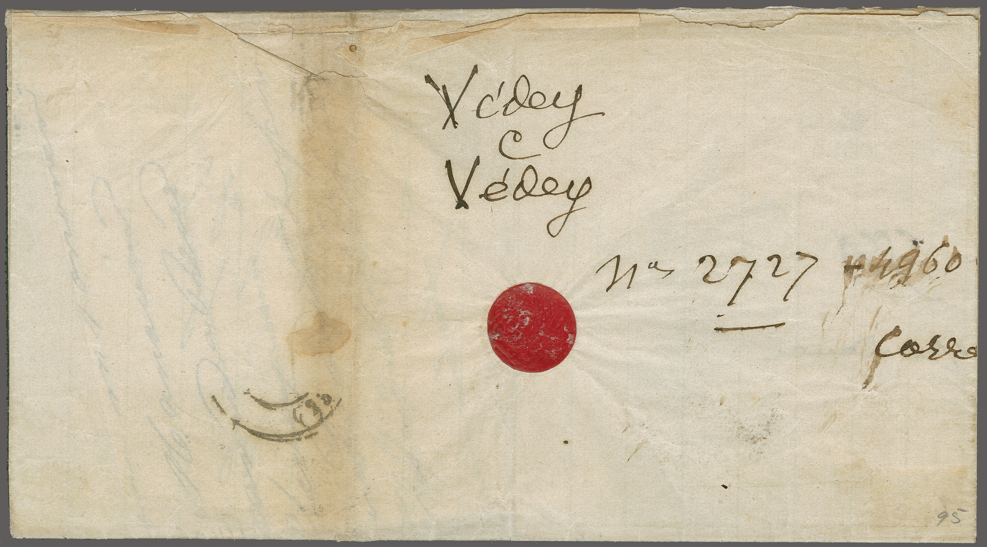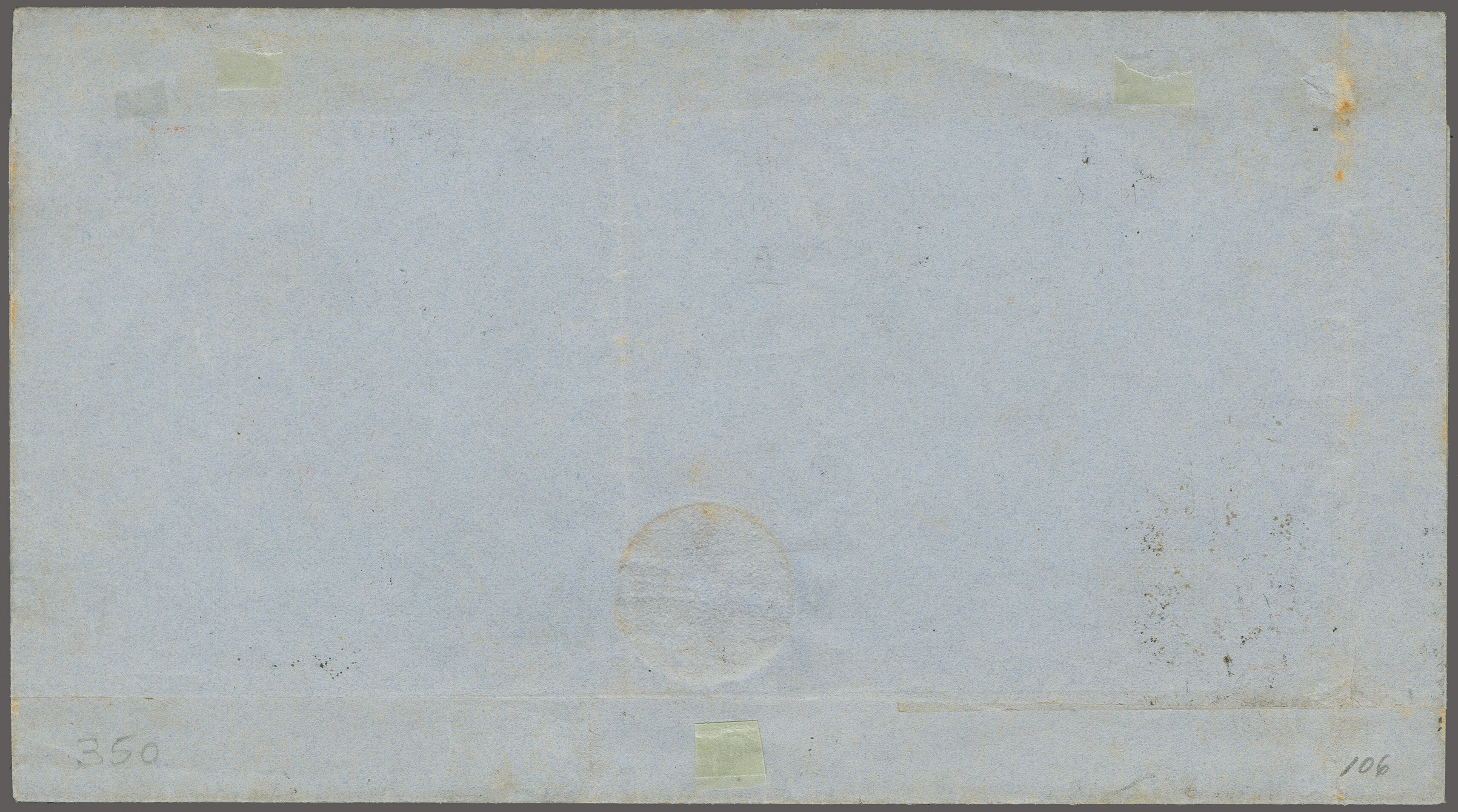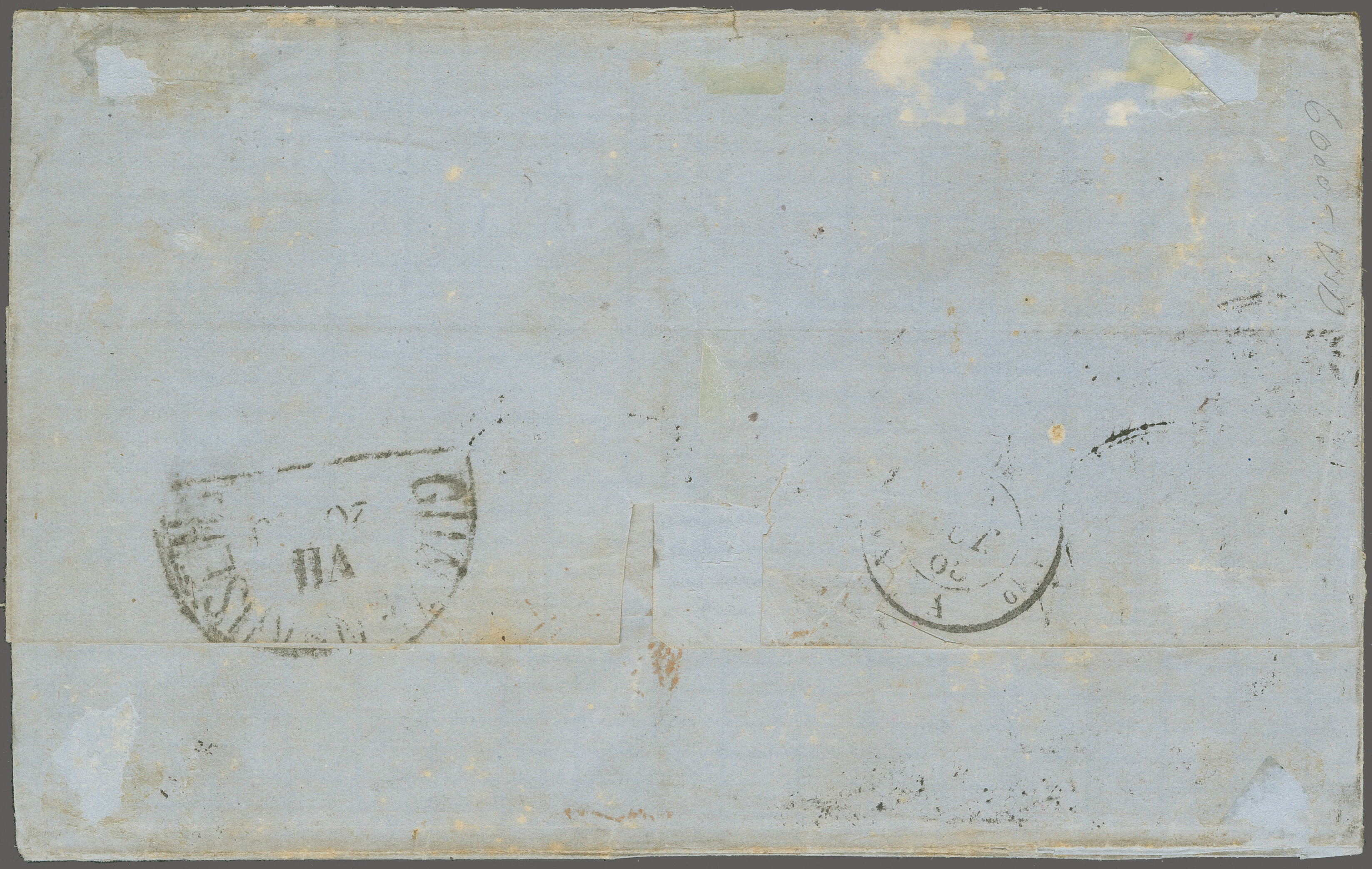 10092 cover imageVerticais 1850: 600 r. black on greyish thin paper, a used example, marginal from left of sheet with large margins all round; on 1863 cover from Rio de Janeiro to Montevideo, Uruguay at triple rate (overpaid 30 reis), carried by French steamer and endorsed "Pelo Vapor Saintonge", tied by dotted roller obliterator of Rio de Janeiro with "Correio Geral da Corte" cds alongside (July 25) and framed "P.P." below in red. Small piece of cover missing from the reverse, but an exceptional single usage of this stamp on letter with just two examples recorded, the other, ex Koester, June 1985, lot 2170 is altogether less attractive with the addressee's name inked out. Rare Scott = $ 1'500+. (Image 1) (Image 2)