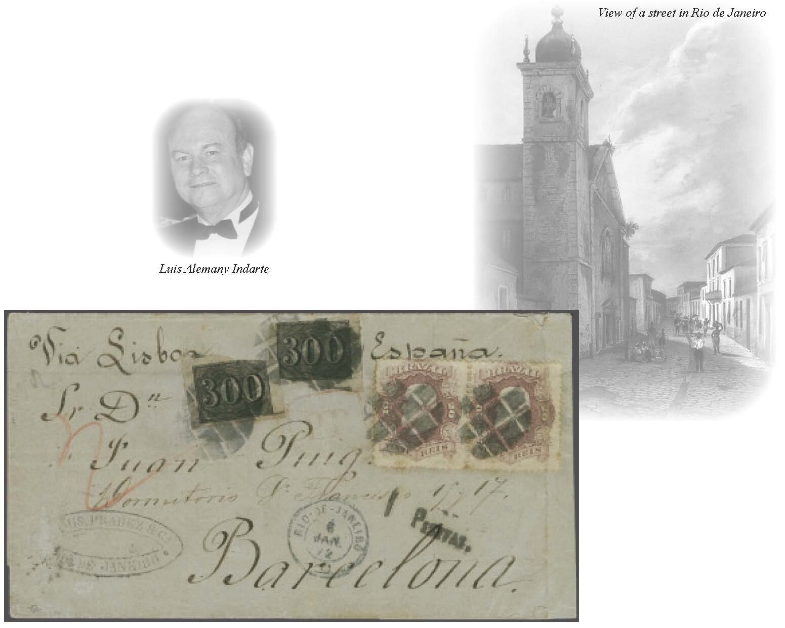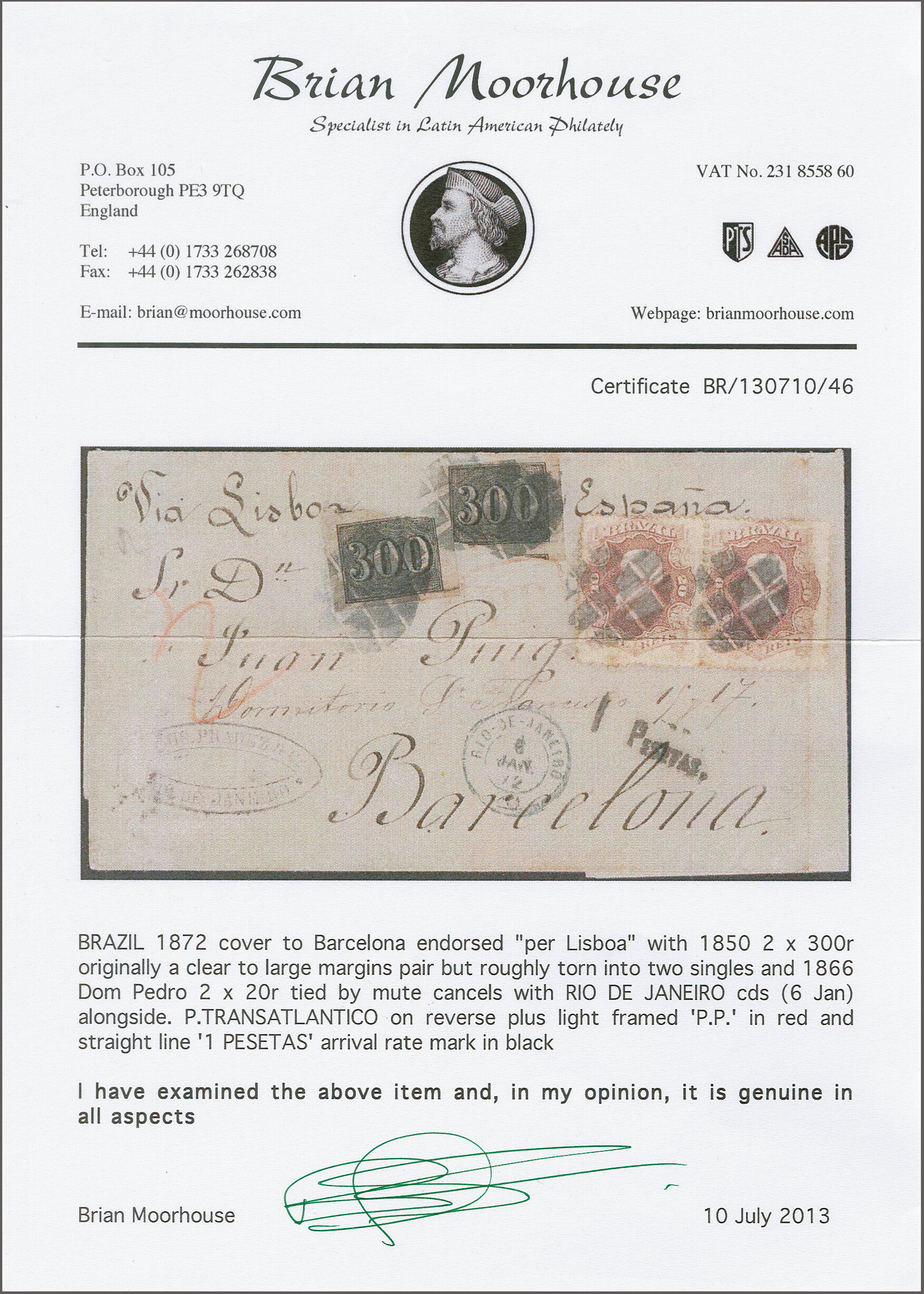 10091 cover imageVerticais 1850: 300 r. black (2, both with enormous margins but touched at corners) in combination with Dom Pedro 1866 20 r. reddish lilac, a creased horizontal pair used on 1872 cover to Barcelona, Spain via Lisbon. The adhesives tied by segmented cork cancellations in black, pre-paying the double rate of 640 reis. French type 'Rio De Janeiro' cds of despatch at base (Jan 6) and reverse with 'P. Transatlantico' in violet alongside arrival cds (Jan 22). Handstruck '1 Pesetas' due marking in black on front of a scarce cover. Cert. Moorhouse (2013). Provenance: Collection Luis Alemany Indarte, Corinphila sale 185, Sept 2013, lot 5027. (Image 1) (Image 2) (Image 3)