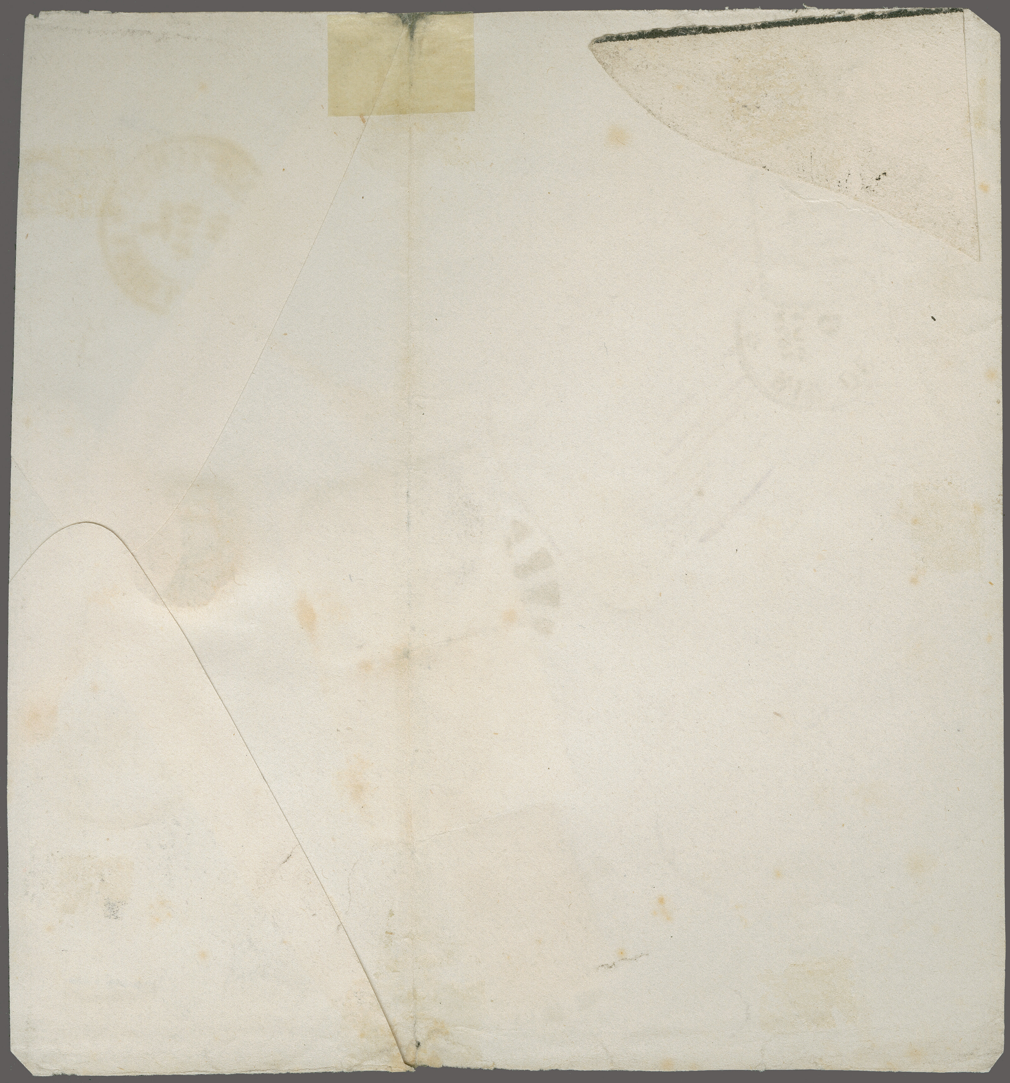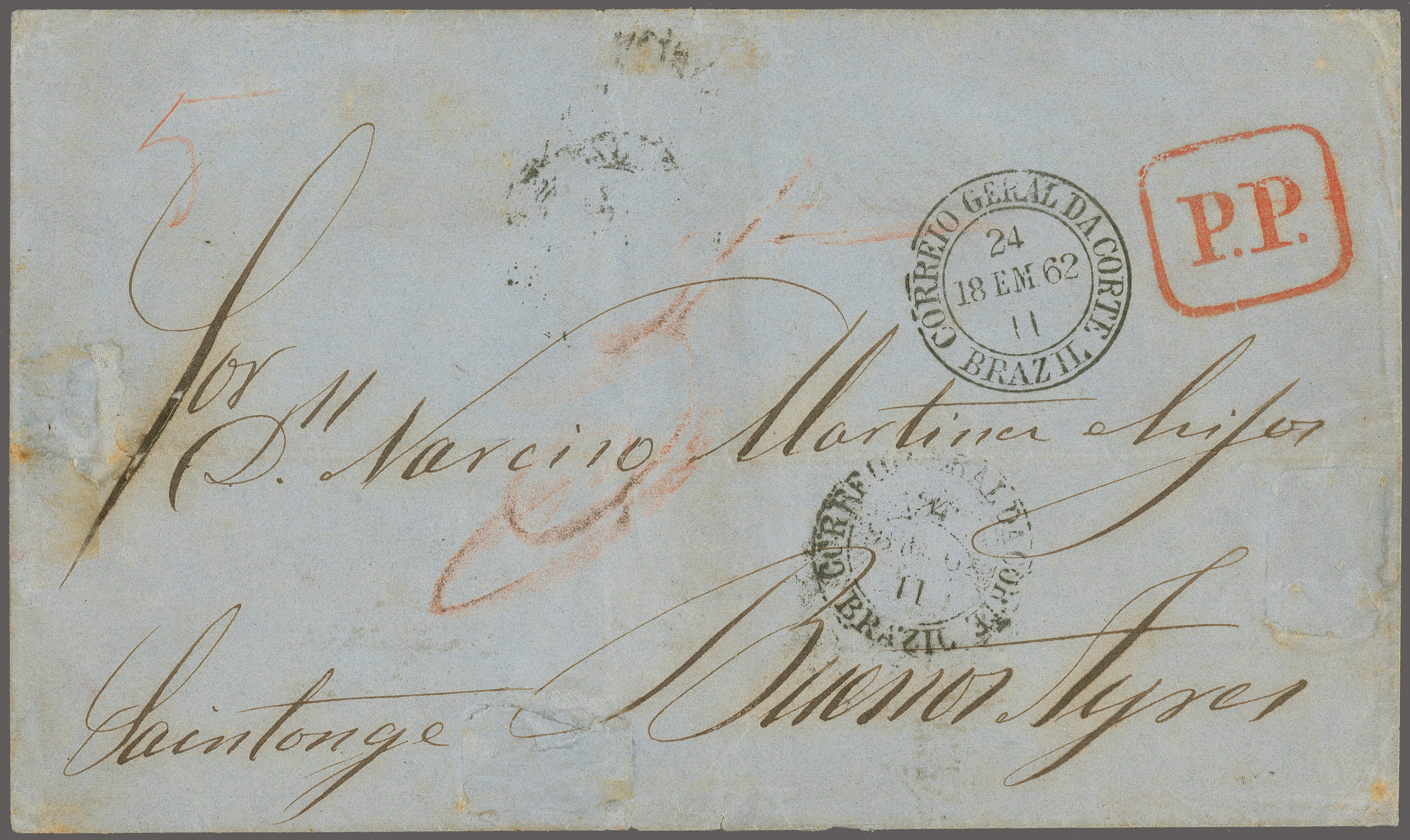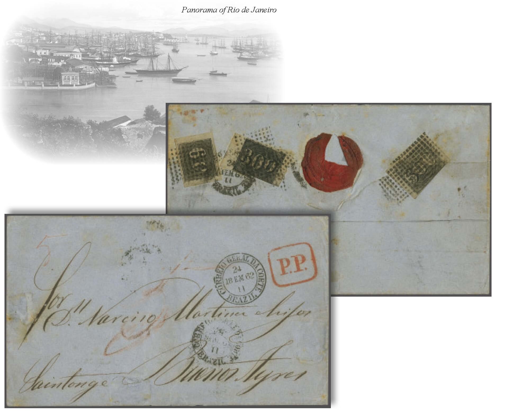 10093 cover imageVerticals 1850: 600 r. black on greyish thin paper, 300 r. deep black and 60 r. black on 1862 cover from Rio de Janeiro to Buenos Aires, Argentina at quintuple rate (overpaid 10 reis), carried by French steamer and endorsed per "Saintonge", the adhesives with mostly large margins, the 60 r. with closed tear at base, with each tied by Rio roller of dots and by "Correio Geral da Corte" cds (Nov 24). Obverse with further Rio dispatch cds's and framed "P.P." in red. Small faults to the obverse where hinged in three places, but a remarkable and rare franking - the sole cover known bearing the top two values of the issue. (Image 1) (Image 2)