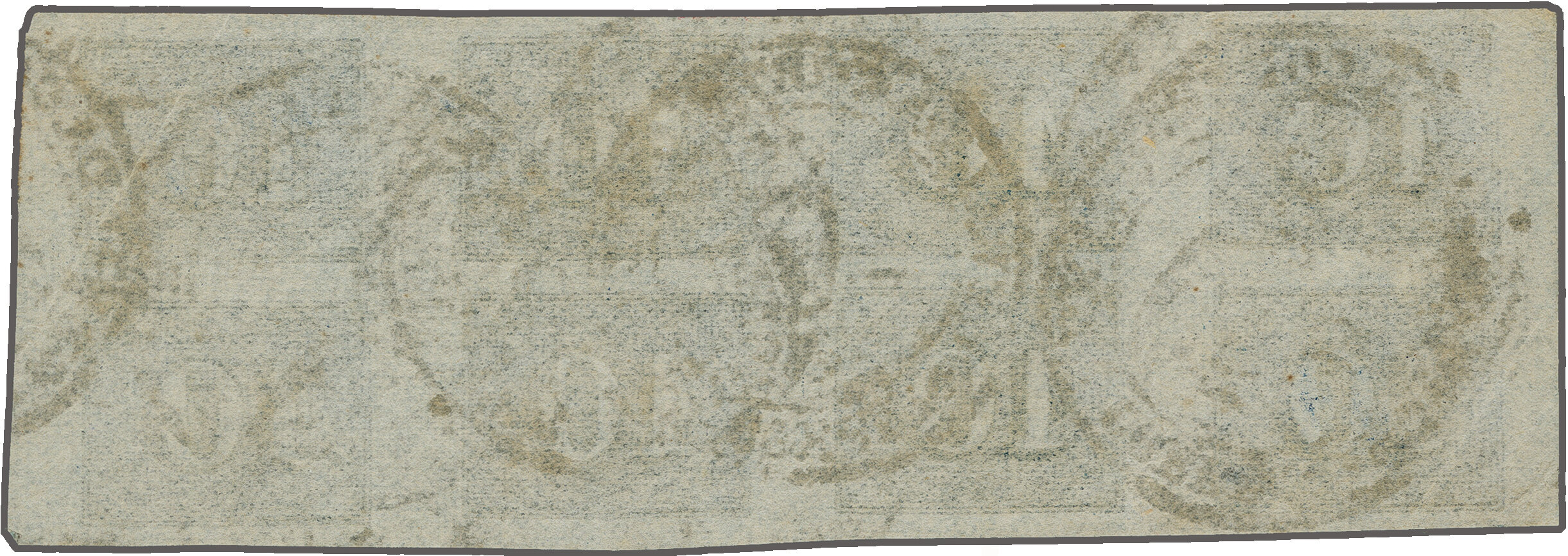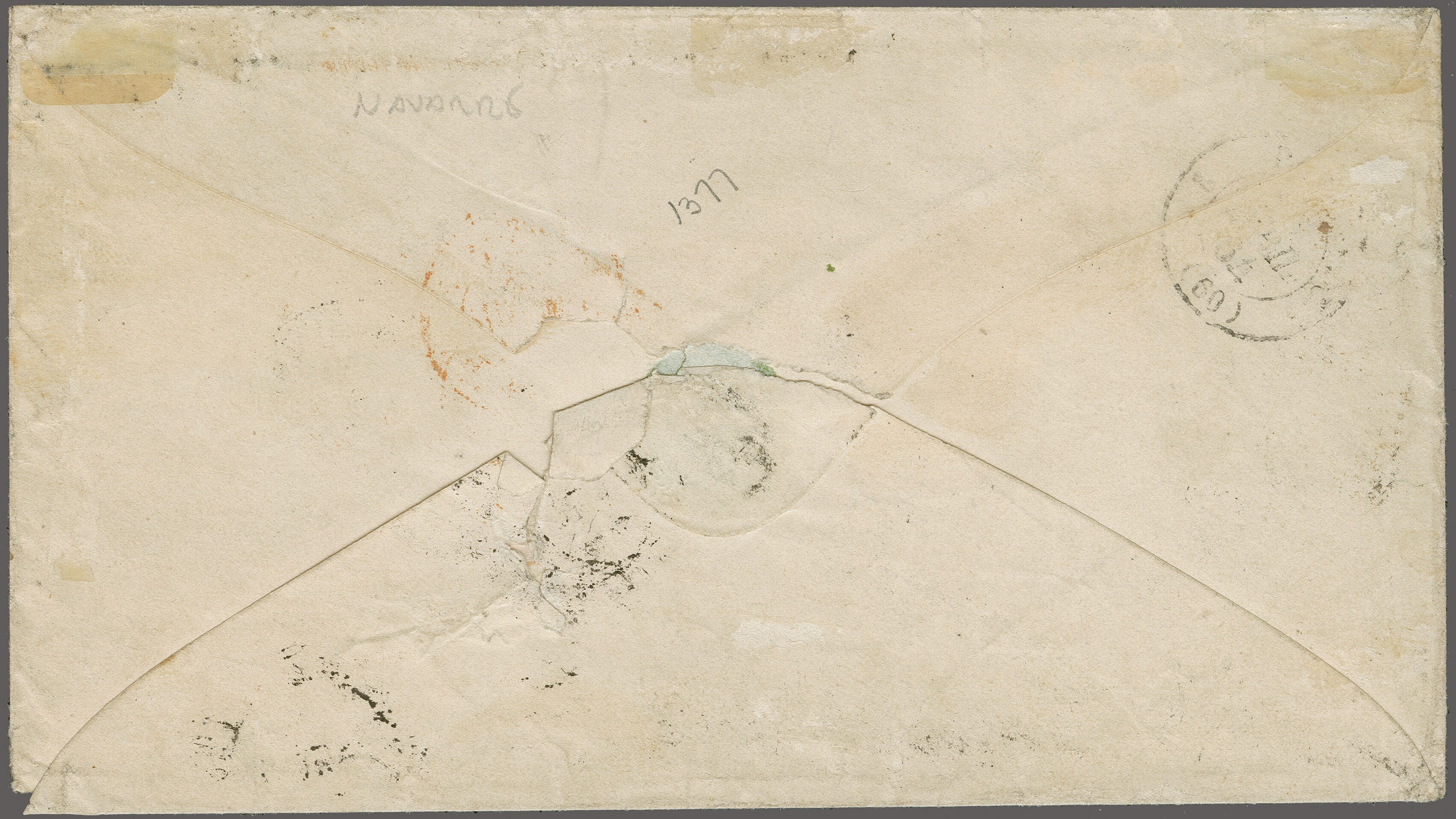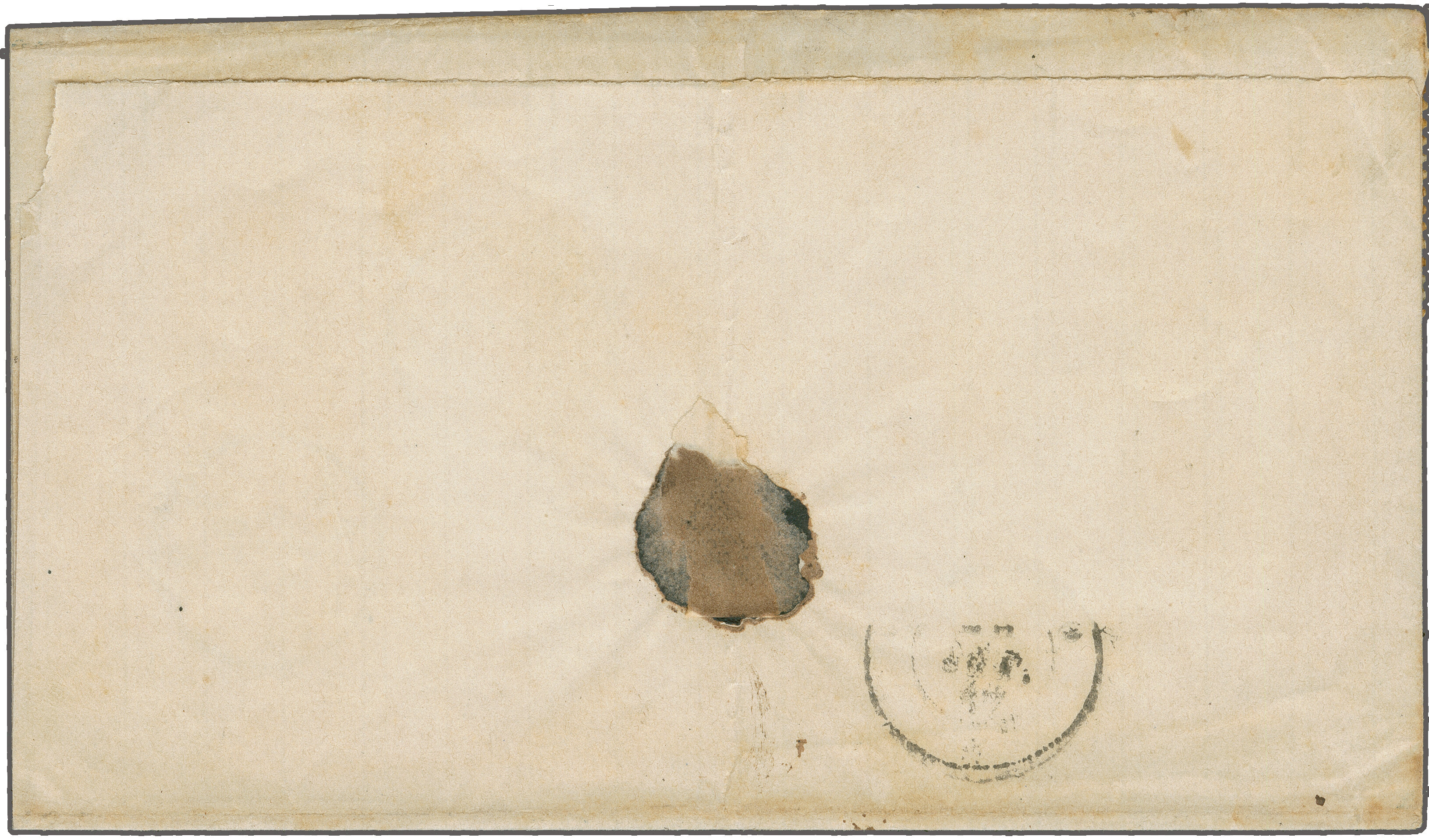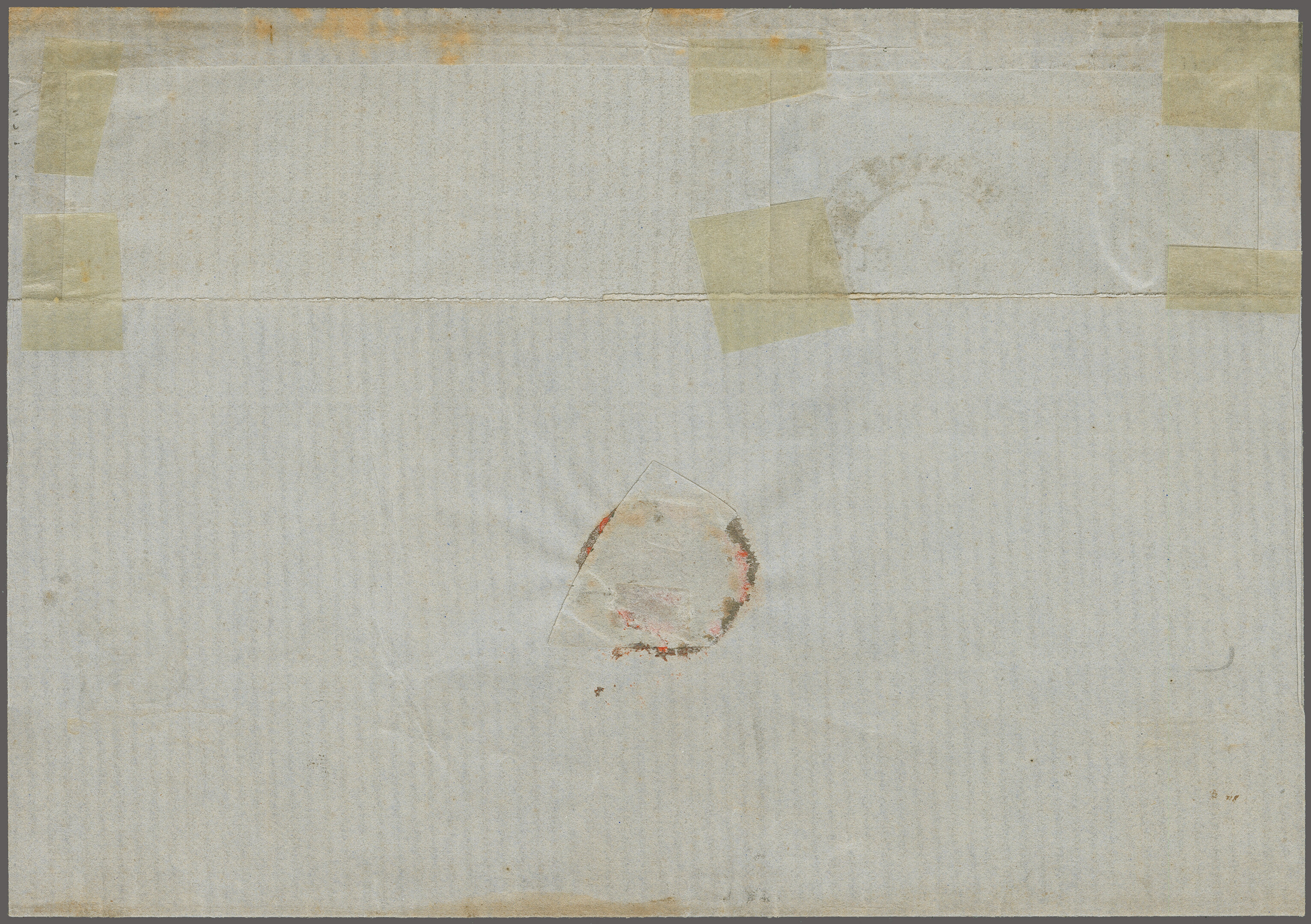 10093 cover imageVerticals 1850: 600 r. black on greyish thin paper, 300 r. deep black and 60 r. black on 1862 cover from Rio de Janeiro to Buenos Aires, Argentina at quintuple rate (overpaid 10 reis), carried by French steamer and endorsed per "Saintonge", the adhesives with mostly large margins, the 60 r. with closed tear at base, with each tied by Rio roller of dots and by "Correio Geral da Corte" cds (Nov 24). Obverse with further Rio dispatch cds's and framed "P.P." in red. Small faults to the obverse where hinged in three places, but a remarkable and rare franking - the sole cover known bearing the top two values of the issue. (Image 1) (Image 2)