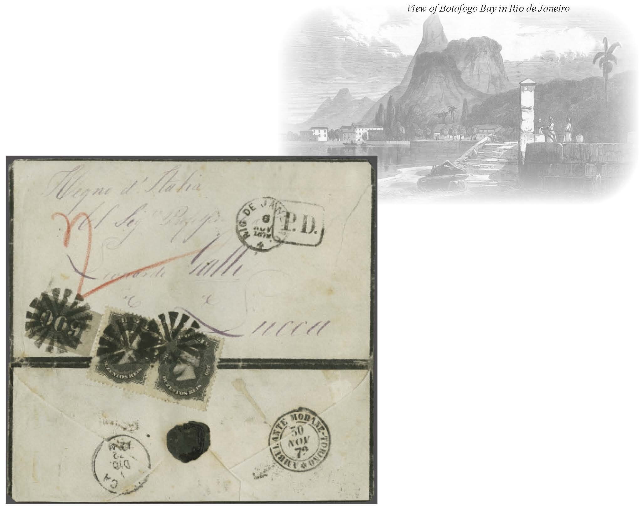 10099 cover imageColoridos 1854: 10 r. blue on greyish thin paper, a used single and vertical pair with close to tocuhed margins, used in combination with Dom Pedro 1866 200 r. black (2) on 1867 single rate cover from Paraibuna to Laurito near Naples, Italy; all tied by manuscript "Paraibuna" in ink manuscript with date alongside "12-8-67" and framed "P.D." below. Some peripheral ageing on the Dom Pedro's, reverse with Rio de Janeiro transit cds in blue (Aug 21) and Napoli cds (Sept 22) in black. An unusual cancellation and combination usage. (Image 1)
